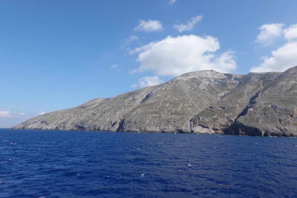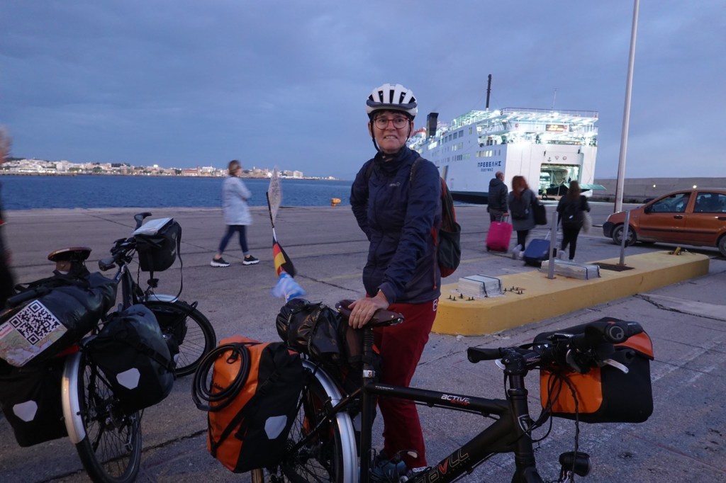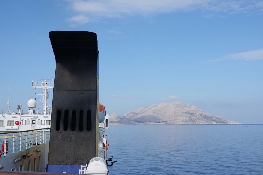 Die Fähre ist uralt und etwas vergammelt. Ein ganzer Tag auf See. 12 Stunden pure Langeweile. Wir schauen aufs blaue Meer. Ab und zu fahren wir an einer der unzähligen Ägäisinseln vorbei. An einigen macht die Fähre kurz halt: Chalki, Karpathos, Kasos. Außer den Orten mit Hafen gibt es da nicht viel. Wir schreiben am Blog, lesen, schauen aufs Meer… Wir kaufen uns WLAN. Doch das ist zu schwach zum Hochladen. Und dann geht Klaus Smartphone nicht mehr an. Der Akku ist wohl kaputt. Ohne wird es auf unserer weiteren Reise schwierig. Und auf See heute noch langweiliger. Doch das nehmen wir gerne in Kauf. Spannende Radtage auf Kreta erwarten uns.