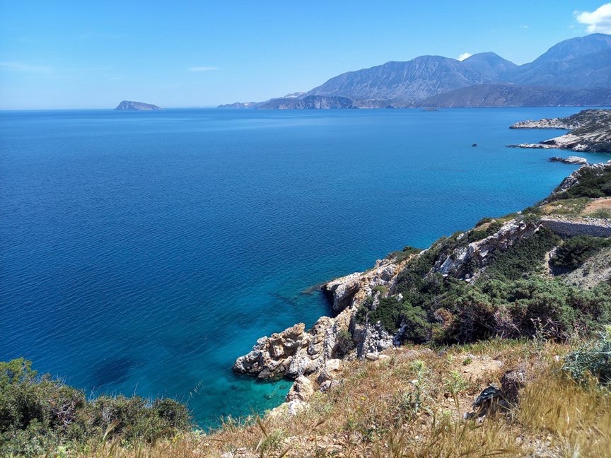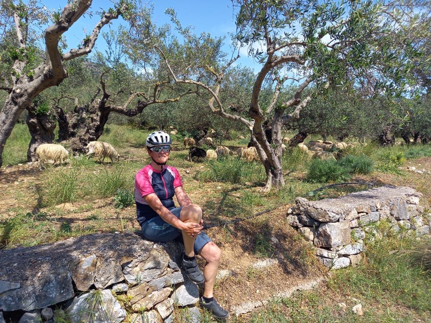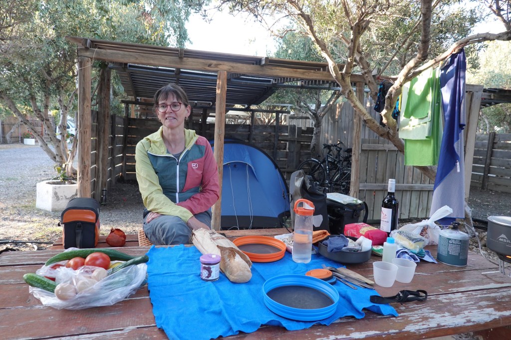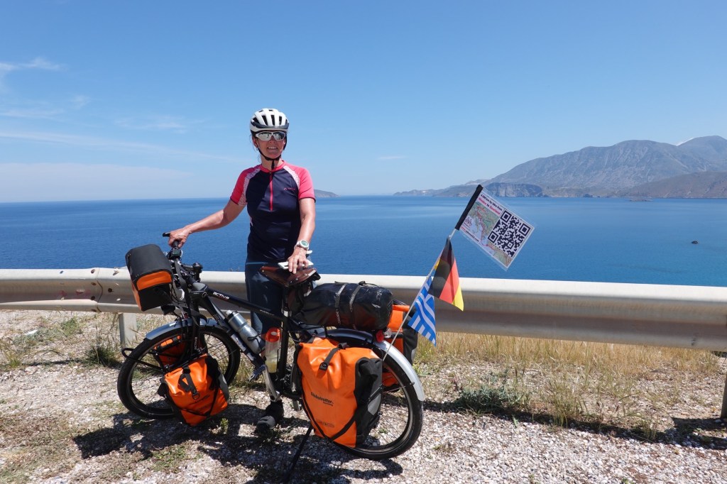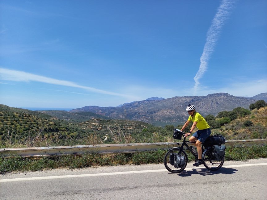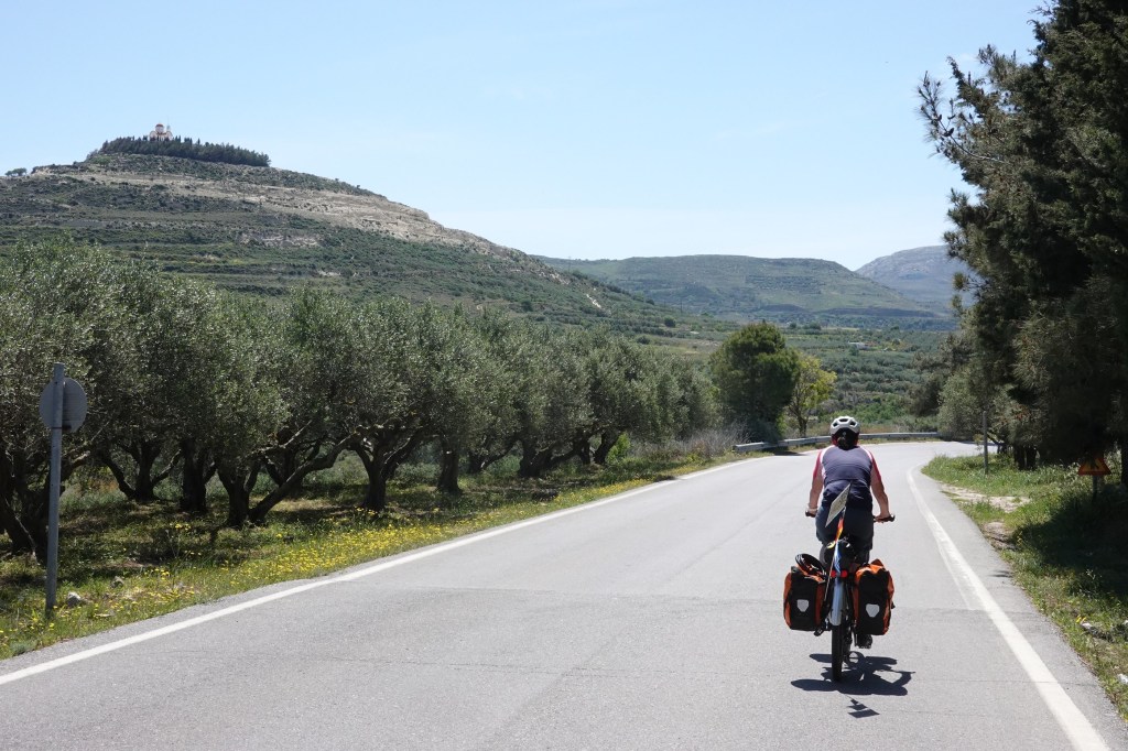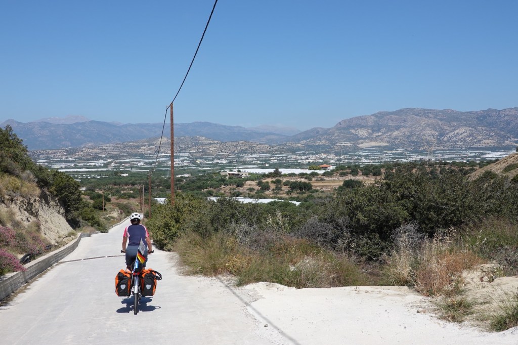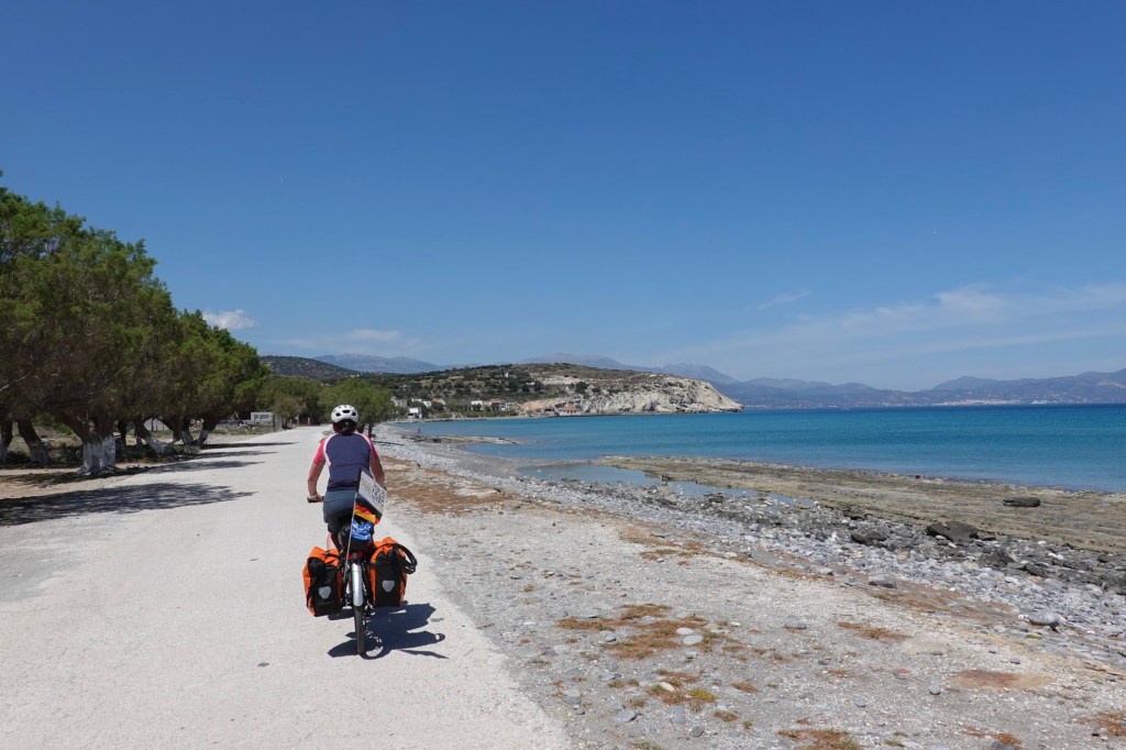 Wir queren die Insel, mit Rückenwind. An der Nordküste fahren wir meistens auf der Old National Road. Daneben ist der Hauptverkehr auf der neuen Straße. Gut für uns. Es geht stetig bergauf und bergab. An einigen Touristenzentren vorbei. Wir verlassen die Küste und müssen über einen Pass. Die Old National Road wird zu einer wunderschönen Fahrradstraße. Sabine fragt Klaus, wo eigentlich die Radfahrer sind. Gilt Kreta doch als Hochburg für Rennradurlauber. Kaum gesagt, da fährt die erste Rennradgruppe schon an uns vorbei. Einzelne Radfahrer folgen. Ungefähr 20 km geht es nach oben bis zum Pass. Dann folgt die Abfahrt. Serpentine um Serpentine. Am Ende durch eine schroffe Schlucht. Bis zum Campingplatz ist es nicht mehr weit.