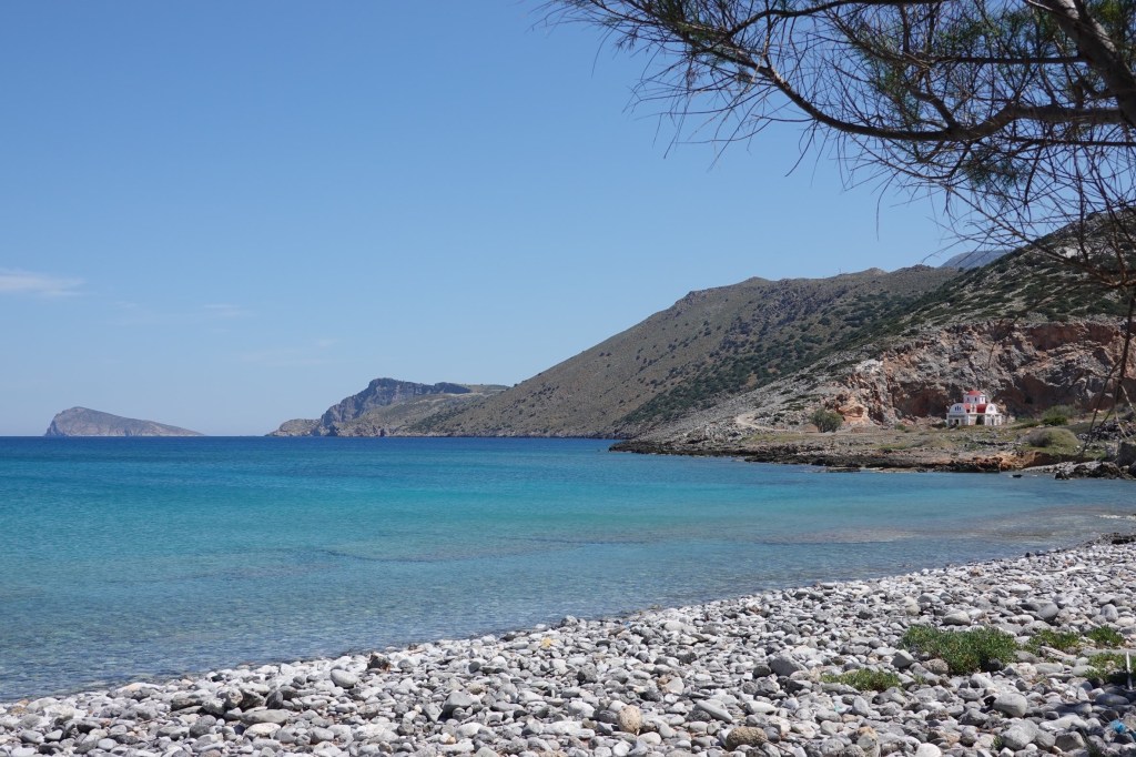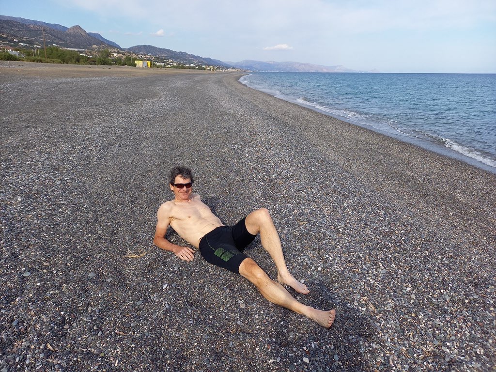 Es geht bergab an die Südküste. Hier gibt es nicht viel Tourismus. Gewächshäuser prägen die Küste. An der Küste geht es ständig auf und ab. Bis zu unserem Campingplatz in der Nähe von Ierapetra, der geographisch südlichsten Stadt Europas. Die Rezeption ist geschlossen. Zwei Briten informieren uns, dass erst am Abend geöffnet wird. Wir stellen unser Zelt unter einen der Holzverschläge, die im Hochsommer Schatten spenden sollen. Der kiesige Long Beach ist völlig leer. Wir haben einen kilometerlangen Strand ganz für uns alleine. Klaus geht baden, Sabine schwimmen. Die Wassertemperatur ist schon eine zeitlang auszuhalten. Nicht für Klaus, er bekommt schon zuhause im Hallenbad Krämpfe. Nach dem Schwimmen wollen wir einkaufen.