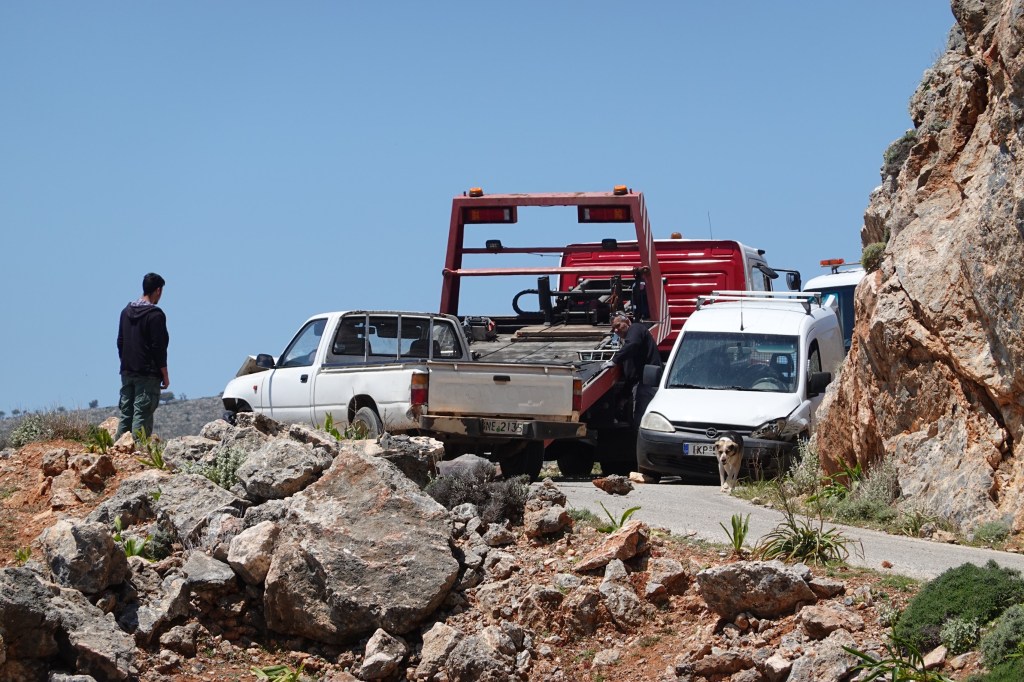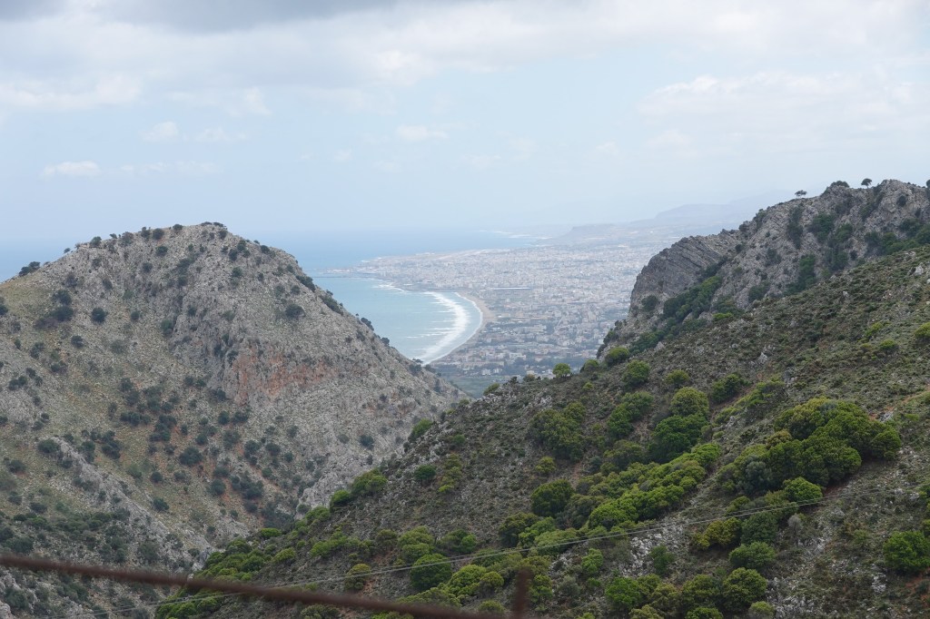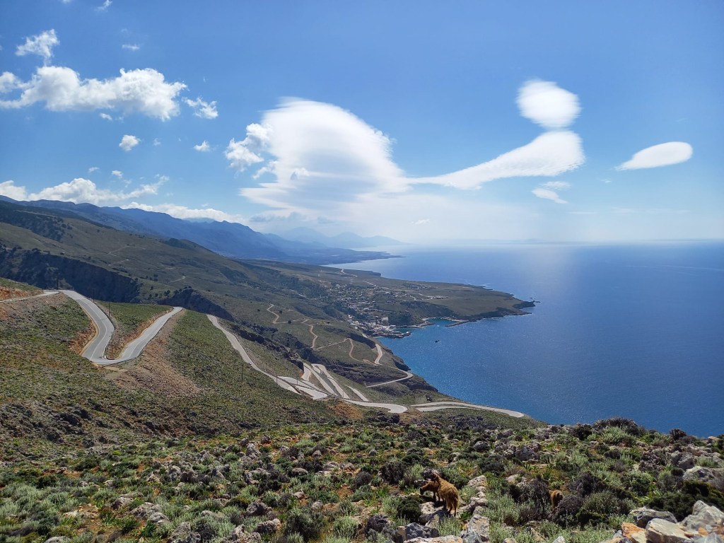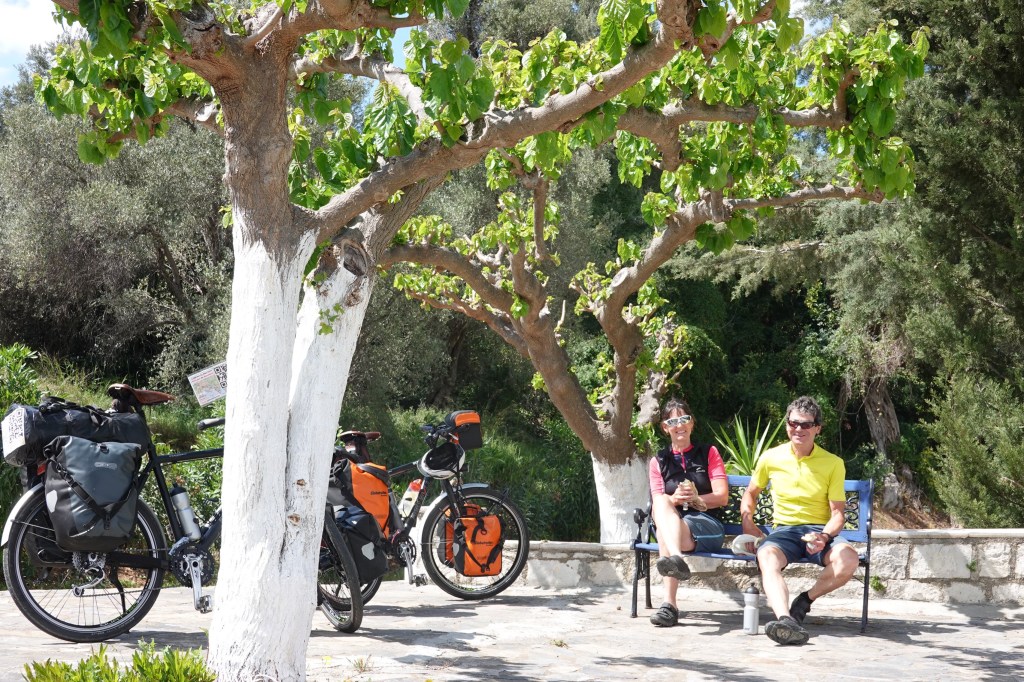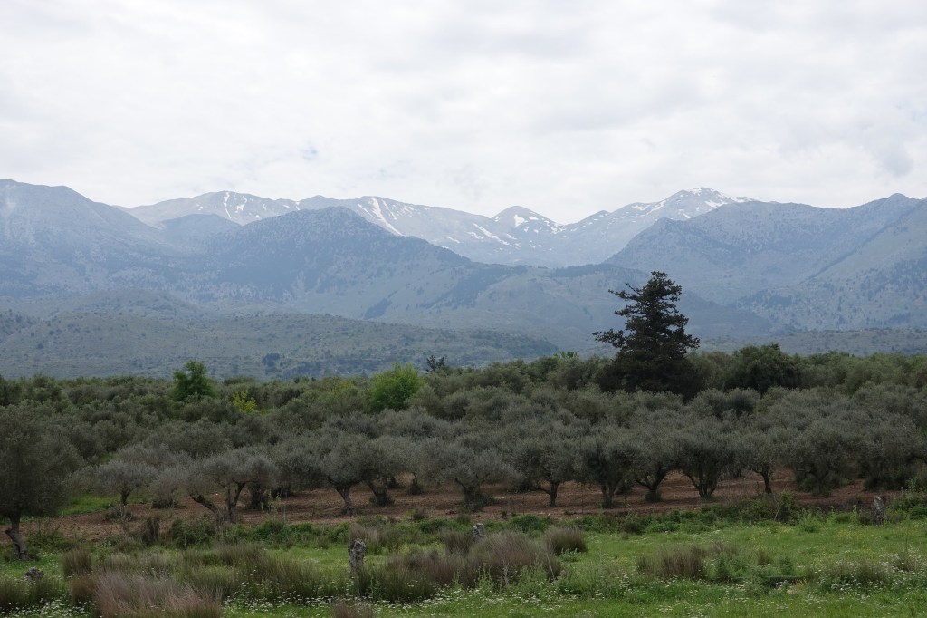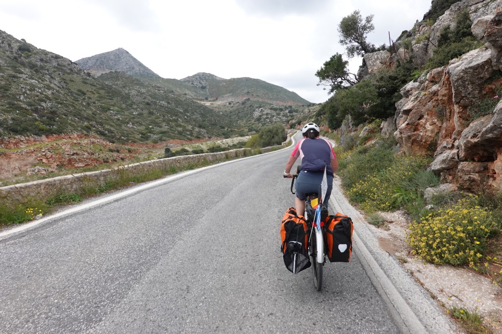 Wir kommen spät los. Zunächst heißt es im Apartment einen Platten flicken. In Klaus Vorderreifen ist keine Luft mehr. Dann fahren wir noch in die Innenstadt. Ein neues Handy kaufen. Ein billiges chinesisches muss vorerst reichen. Ein neues IPhone gibt’s nochmal zuhause. Endlich können wir los. Nach ein paar Kilometern biegen wir von der Küste in die Berge ab. Geopark Psiloritis steht auf dem Hinweis an der Straße. Es geht in das Massiv mit dem höchsten Berg Kretas. Er ist über 2400m hoch. Ganz so hoch müssen wir nicht. Trotzdem ist ein Pass von 500 Höhenmeter für uns mit den schweren Rädern kein Pappenstiel. Insgesamt werden es an dem Tag 1200 hm. Die Landschaft entschädigt uns für die Anstrengung.