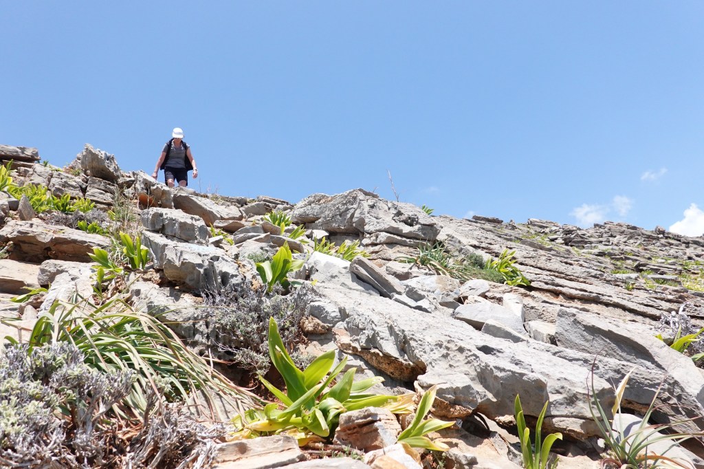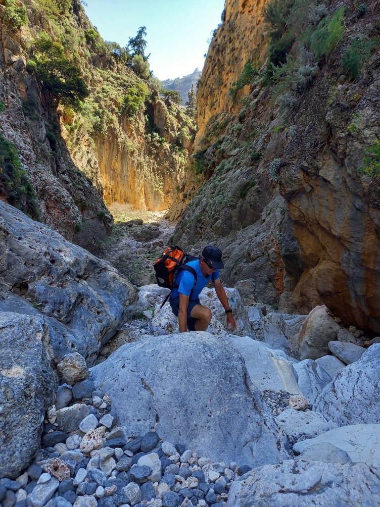 Über einen alten Maultierpfad geht es wieder nach oben. Vor Bau der Brücke war das die einzige Möglichkeit durch die Schlucht zu kommen. Auf einer Seite runter und auf der anderen Seite wieder hoch. Durch eine verlassene Siedlung geht es zurück zum Mietwagen. Hätten die Bewohner gewusst, dass irgendwann mal eine Brücke gebaut wird, wären sie nicht weggezogen. Die Lage im Nationalpark Pedres ist einmalig. Sechs Stunden waren wir unterwegs. In einer kleinen Taverne trinken wir noch einen Cappuccino. Dann müssen wir zurück. Eigentlich schade. Es ist für uns bisher der schönste Abschnitt Kretas. Wir bringen das Auto zurück. In einem Restaurant mit kreativer kretischer Küche essen wir zu Abend. Es ist schon längst dunkel, als wir wieder am Zelt sind. Ein toller Tag auf Kreta.