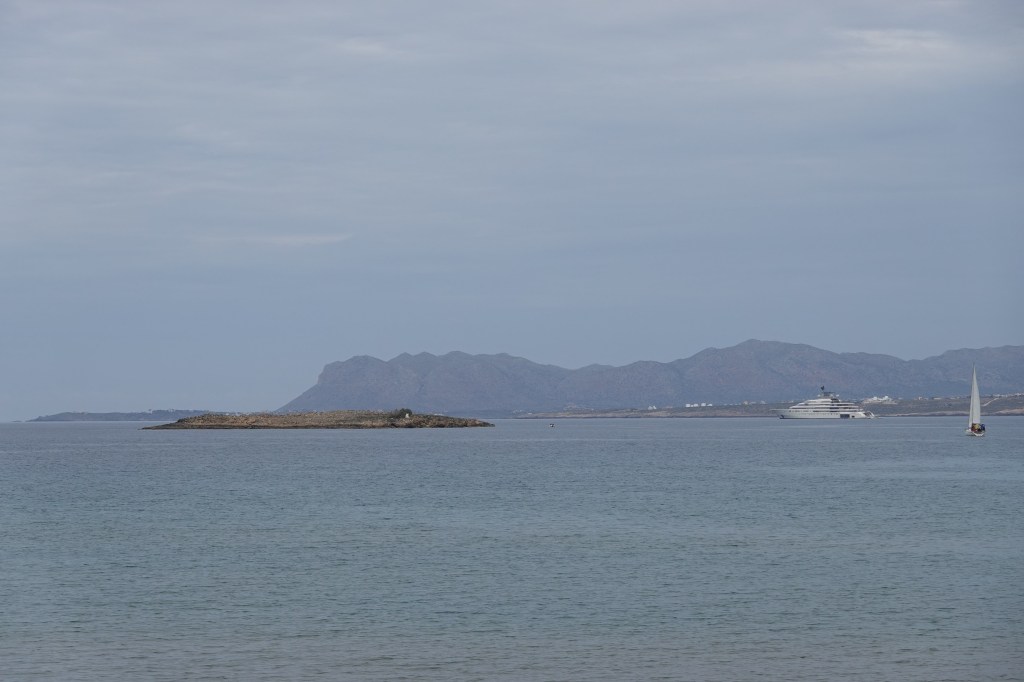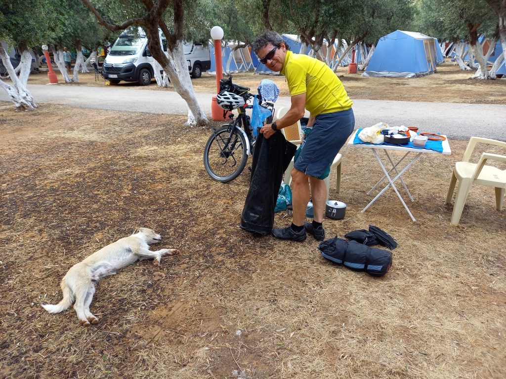 Wir fahren durch Karstgebirge mit grünen und gelb blühenden Sträuchern. Immer wieder sehen wir bis zum Meer. Außer ein paar Betonautos überholen uns nur wenige Fahrzeuge. Es gibt kleine Dörfer, Ziegen und Schafe. Kreta zeigt hier sein schönstes Gesicht. Wir genießen die Abfahrt bis zum Meer. Leider zeigt Kreta hier sein hässliches Gesicht. Touristenburgen an Touristenburgen, Souvenirläden, Imbissbuden, Tavernen, am Strand Sonnenschirm an Sonnenschirm… Massentourismus per excellence. Unser Campingplatz liegt in einem grünen Abschnitt irgendwo dazwischen. Dass es hier so eine grüne Idylle noch gibt, hätten wir nicht erwartet. Glück gehabt.