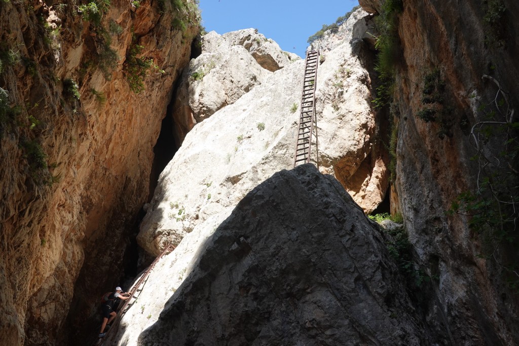 Wir treffen auf der ganzen Strecke nur ca. 10 Leute. Es ist anstrengend. Es gibt viele Kletterpassagen, bei denen wir auch unsere Hände zu Hilfe nehmen müssen. Fast 800hm müssen wir in der Schlucht überwinden. Die Schlüsselstelle ist eine Stahlleiter mit bestimmt 30 Stufen. Sabine geht die ersten Stufen nach oben, doch dann muss sie passen. Die Abstände zwischen den Tritten sind zu groß. Ihr Knie müsste genau die Belastung aushalten, die sie beim Rad fahren schon seit letztem Jahr vermeidet. Aus der Beugung anspannen geht immer noch nicht. Glücklicherweise gibt es hier einen Plan B. Ein steiler ausgesetzter Pfad führt um die Schlüsselstelle herum. Schade für Klaus, er wäre gerne über die Leiter hoch. Nach etlichen Kilometern sind wir unter der Brücke. Wenn ein Auto drüber fährt, rumpelt es über die Holzplanken. Im Sommer gibt es hier einen 135m Bungeesprung. Nichts für uns.