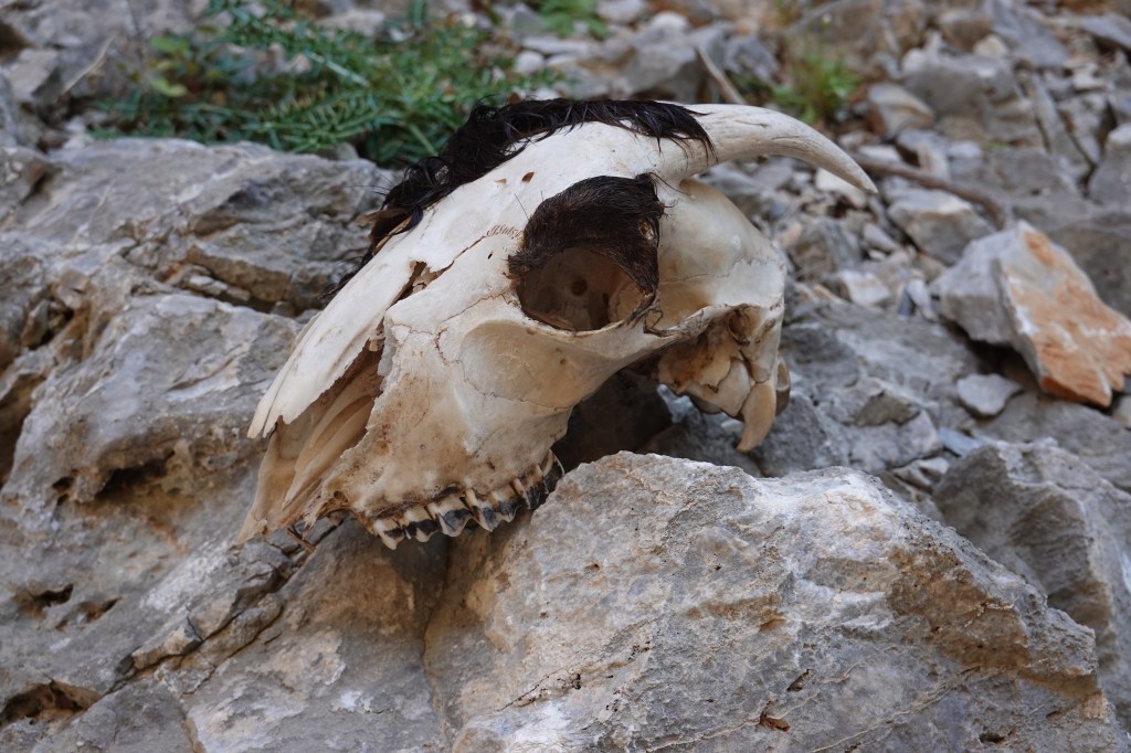 Wir parken an der Brücke, dem Ziel unserer Tour. Zuerst müssen wir zum Meer hinunter. Über Bergpfade und Serpentinen einer schmalen Straße geht es steil nach unten. Gut dass wir zu Fuß unterwegs sind. Zwei PKWs sind in einer Kurve zusammengestoßen. Sie haben Glück gehabt. Es gibt keine Leitplanken und es geht neben der Straße senkrecht nach unten. So steile enge Kurven haben wir noch selten gesehen. Unser erstes Ziel ist der Marmara-Beach. Über eine ca. 100 m hohe Kletterpassage kommen wir nach unten. Es ist ein feiner Kiesstrand mit Kalksteingrotten eingefasst. Das Wasser ist kristallklar. Kurz Schwimmen muss sein. Einfach weiter gehen, wäre schade. Hinter dem Strand beginnt die Schlucht. Ihre steilen Felswände sind über 200m hoch. Oft ist sie nur ca. 20 m breit. Das ausgetrocknete Bachbett aus Kies ist voll von blühenden Oleandersträuchern. Wir sind allein. Das Meckern von ein paar Ziegen hören wir an den Wänden widerhallen. Sie müssen acht geben. Die Wände sind auch für gute Kletterer wie sie zu steil. Etliche skelettierte Ziegenkadaver liegen in der Schlucht. Sie sind abgestürzt. Über uns kreiseln Bart- oder Gänsegeier mit bestimmt 2 m Spannweite. Es ist fast gespenstig.