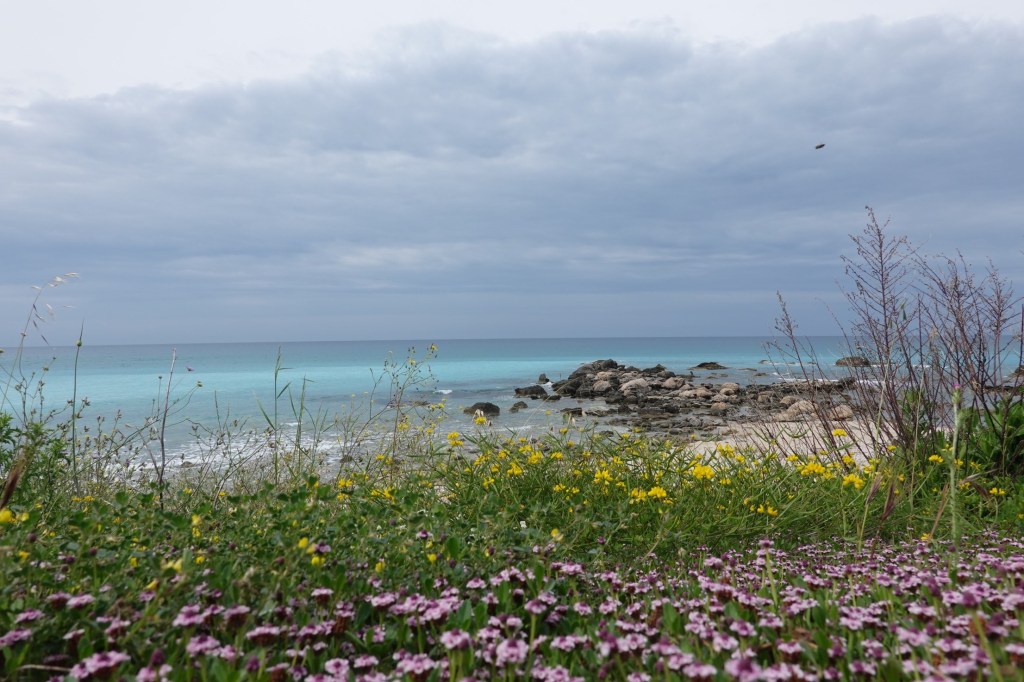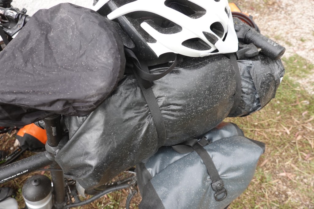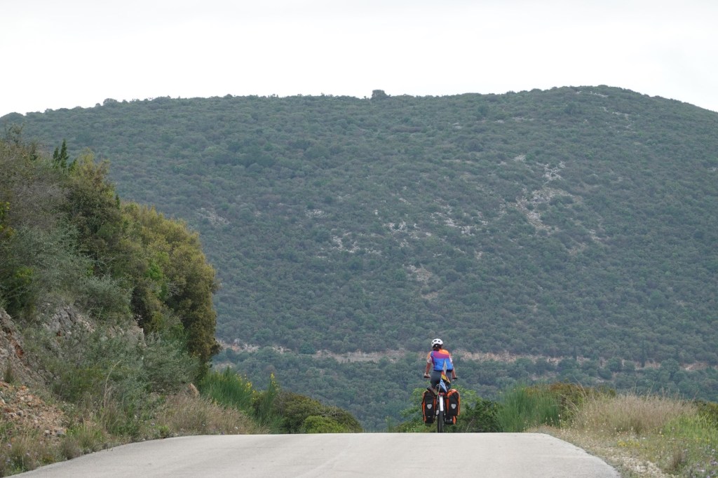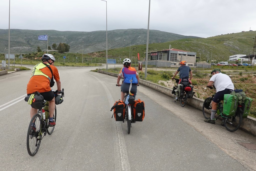 Bis Igoumenitsa ist wieder kaum Verkehr. In der Stadt sogar ein Radweg. Dann geht’s in Richtung albanischer Grenze. Wir treffen zwei Radreisende von den Kanaren. Sie fahren von Athen nach Spanien. Den ganzen EV 8. Sie überholen uns und fahren weiter auf der Hauptstraße über einen Berg. Wir biegen auf Nebenstraßen in der Ebene ab. Es geht durch süß duftende blühende Orangenplantagen. Ein Bikepacker mit Gravelbike stoppt vor wütenden Hunden. Wir holen ihn ein und starten unseren letzten Hundesprint in Griechenland. Dann fahren wir gemeinsam weiter. Roland kommt aus der Nähe von Basel und reist mit seinem Gravelbike durch verschiedene Länder in Europa. Er hat ein Interrail-Ticket und nimmt sein Rad zerlegt und verpackt in der Bahn mit. Heute will er einen Abstecher nach Albanien machen. Wir haben eine interessante schöne Fahrt zusammen.