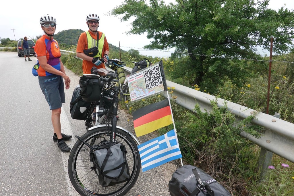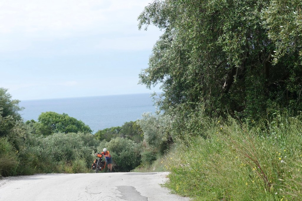 Noch einmal wollen wir kurz vor Igoumenitsa in Griechenland übernachten. Wir fahren neben der Hauptstraße immer an der Küste entlang. Es ist hügelig und alles ist total grün. Wie ein undurchdringlicher Urwald. Es geht auf und ab. Steil. Bergab müssen wir bremsen und bergauf klettern. Dauernd 10 bis 20 % Steigung. Besonders in den kleinen Orten. Zweimal muss Sabine schieben. Die steile Straße ist für die Last von 45 kg dann einfach zu lang. Entschädigt werden wir immer wieder durch grandiose Ausblicke auf kleine Buchten mit Sandstränden und türkisfarbenem Meer. Den letzten langen steilen Anstieg können wir noch auf einer ruhigen Seitenstraße meistern.