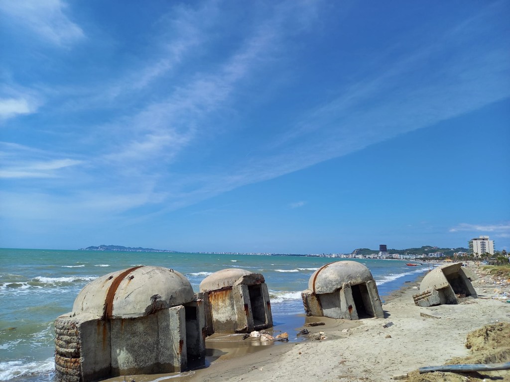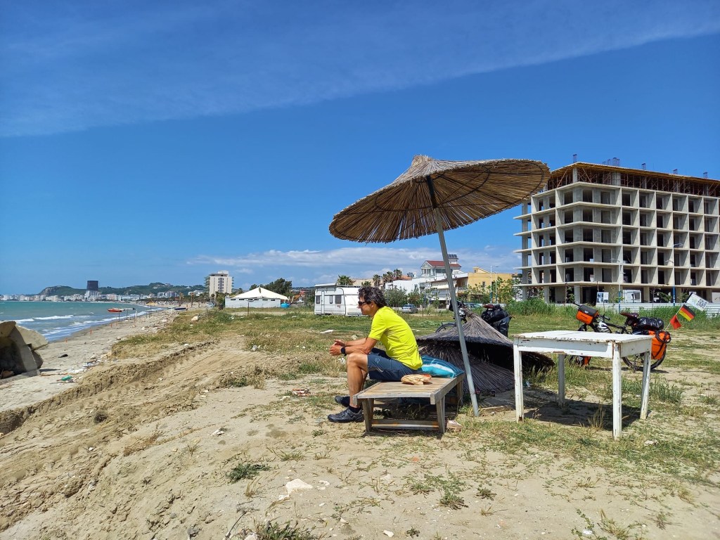 Wir fahren zum Meer. In die riesige Bucht von Dürrës. Albaniens Ballermann. Hotel an Hotel, so weit das Auge reicht. Massentourismus per excellence. Noch preiswert für die Urlauber, aber schrecklich. Wir machen halt, um unsere Brote zu essen. An einem ausgeschilderten Campingplatz. Am Strand, doch eigentlich auf einer Müllhalde, hinter Bunkern und vor Baustellen. Ohne sanitäre Anlagen. Zwei verrostete Außenduschen gibt es noch. Nein, campen in Albanien geht einfach nicht. Es dauert bis wir endlich aus der Stadt heraus kommen. Wir fahren an unzähligen Autowaschanlagen Lavazh vorbei. Überall herrscht Hochbetrieb. Hier im Norden von Albanien gibt es viele nagelneue Autos. Und was für welche. Große Limousinen, Vans , SUVs…Wo haben so viele Albaner das Geld für solche Autos her? Bei einem durchschnittlichen Lohn von 600 Euro. Wir wollen nach Plazhi San Pietro, einem kleinen Ort an einem riesigen Sandstrand. Der immer mehr mit Luxusresorts zugebaut wird. An den Stand kommen nur noch Hotelgäste. Egal, wir sind spät dran. 95 km sind wir gefahren. Wir wollen nur noch in unser Apartment. Es liegt abseits der Resorts am Berg. Am Ende geht es steil hoch. Dafür haben wir eine tolle Aussicht über das Meer. Bellavista heißt unsere Unterkunft. Die Gastgeberin begrüßt uns mit Getränken in ihrer grünen Oase. Die lange Strecke bis zu diesem Ziel hat sich dann doch noch gelohnt.
