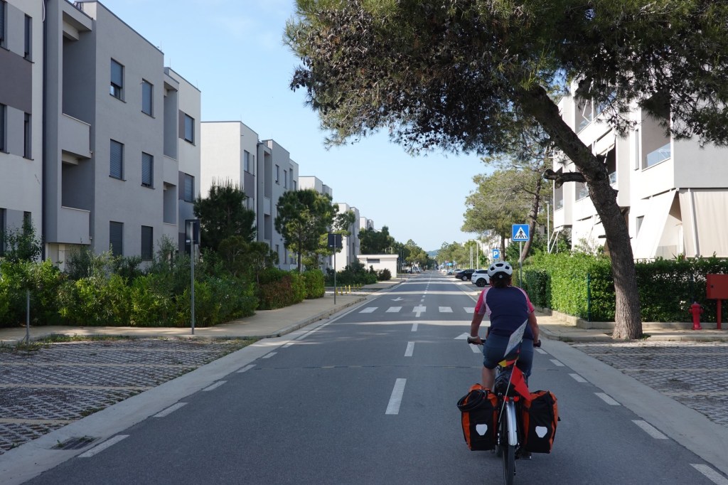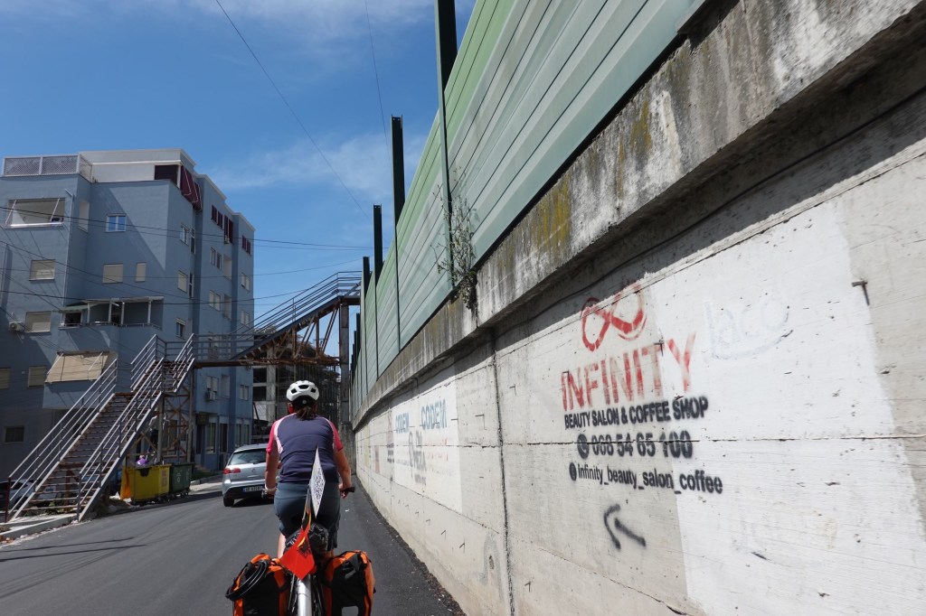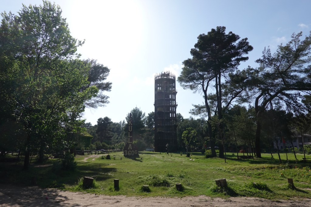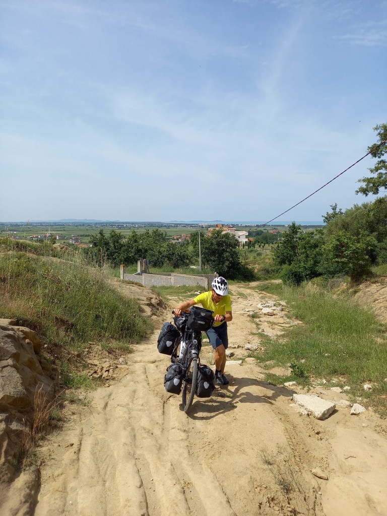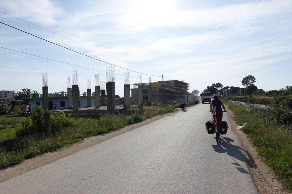 Die Nacht in unserem kleinen Hotel im Nationalpark Parku Kombëtar Divjakë-Karavastawar war sehr ruhig. Nachdem die Streuner mit Bellen aufgehört hatten, gab es nur noch Vogelstimmen. Wir wollen uns nach dem Frühstück noch Wald und Lagune von oben ansehen. Es gibt einen Aussichtsturm. Wir haben eine tolle Aussicht über den Pinienwald bis zum Meer und auf der anderen Seite bis zu noch verschneiten Bergen. Dann geht es weiter. Wir erwarten nicht viel von der Etappe. Es geht durch den Großraum Tirana-Dürrës. Eine Ebene, in der die meisten Albaner leben. Wir umfahren mehrmals die Autobahn, suchen nach uralten Brücken und Querungsmöglichkeiten der Schnellstraße. Albaner fahren auch auf der Autobahn mit ihren klapprigen Rädern. Wir nicht. Die Alternativen sind nicht gerade ein Erlebnis. Wir fahren direkt neben der Autobahn, auf stark befahrenen Landstraßen und durchqueren einige Städte. Es ist laut und wir atmen den ganzen Tag stinkende Abgase ein. Einfach nur durchkommen, Strecke machen. Morgen wird es sicher wieder besser. Bei Radreisen gibt es halt nicht nur Highlights.