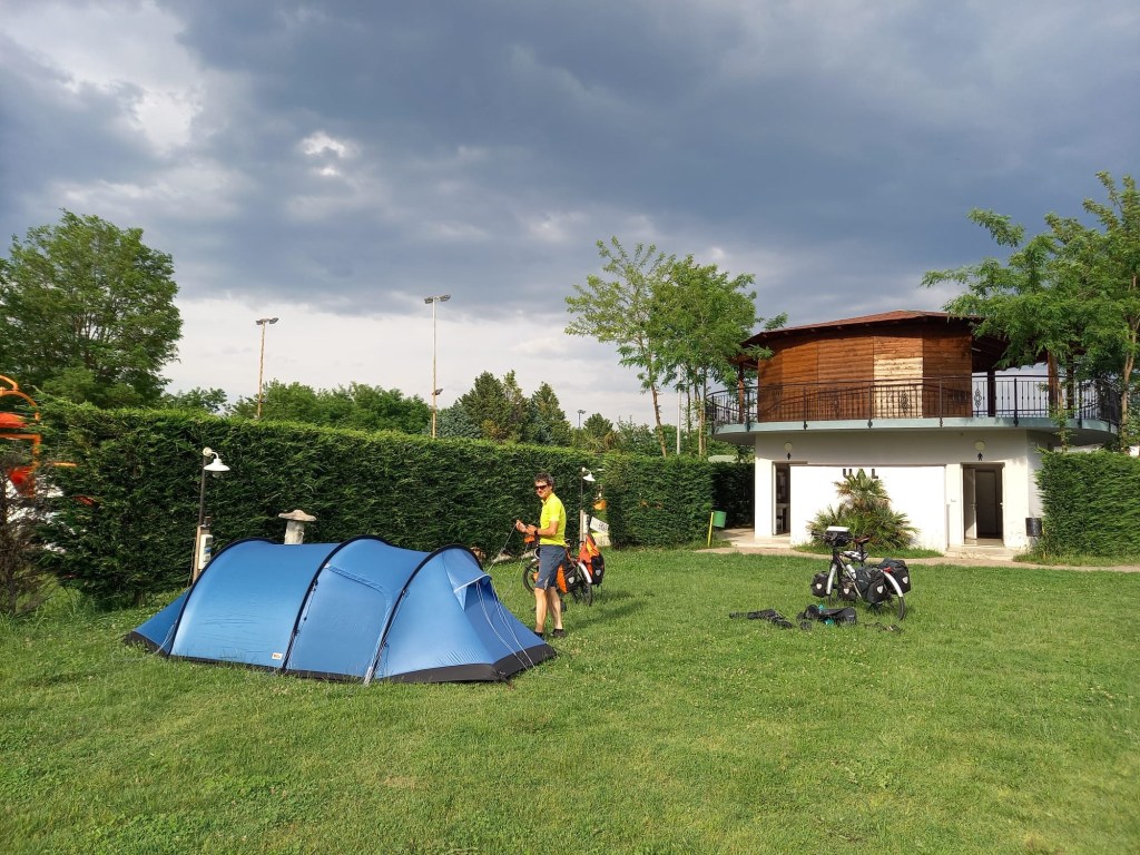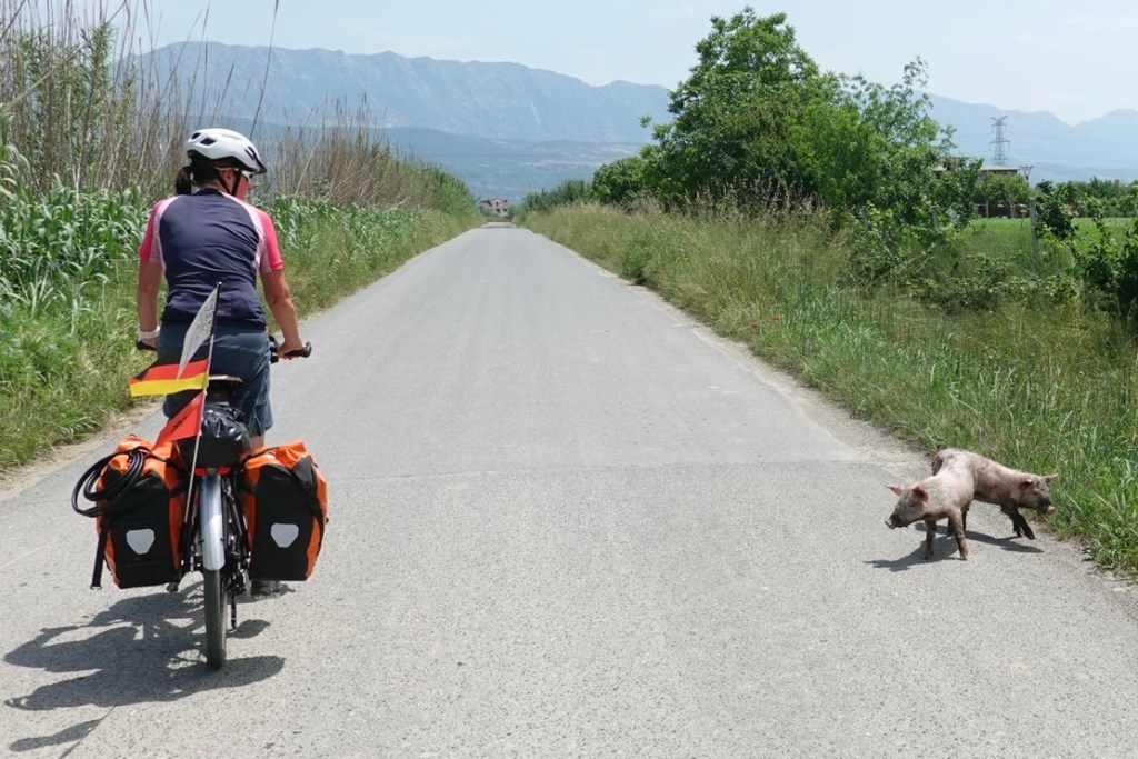 In der Ebene suchen wir den Weg über eine alte Brücke mit morschen Holzplanken. Hält sie uns aus? Gerade ist sogar ein Auto darüber gefahren. Mutig. Das würden wir uns mit unserem Auto nicht trauen. Auf einer Straße über Felder suchen Bauern nach ihren Tieren. Wenig später laufen uns zwei verschlammte kleine Ferkel über den Weg. Wir halten einen Autofahrer an und versuchen ihm klar zu machen, dass er den Bauern bitte sagen soll, dass ihre Ferkel hier sind. Wir finden eine Straße am Rand der Berge. Sie ist kein Highlight aber einigermaßen ohne Verkehr befahrbar. Nach Lezhë, einer total hässlichen Stadt, kommen wir in ein versöhnliches Albanien. Es ist grün, es gibt kleine Dörfer mit freundlich grüßenden Menschen. Wir treffen ein deutsches Paar mit Gravelbikes und tauschen Reiseerfahrungen aus. Auch hier gibt es viele Schlangen auf der Straße. Tote und lebende. Eine ist eine Boa, sie hat einen ganz dicken Kopf und kommt in Albanien vor. An eine braune circa 80 cm lange Schlange fährt Klaus ganz nah ran, um erfolglos zu filmen. Ob sie auch giftig ist, wissen wir nicht.