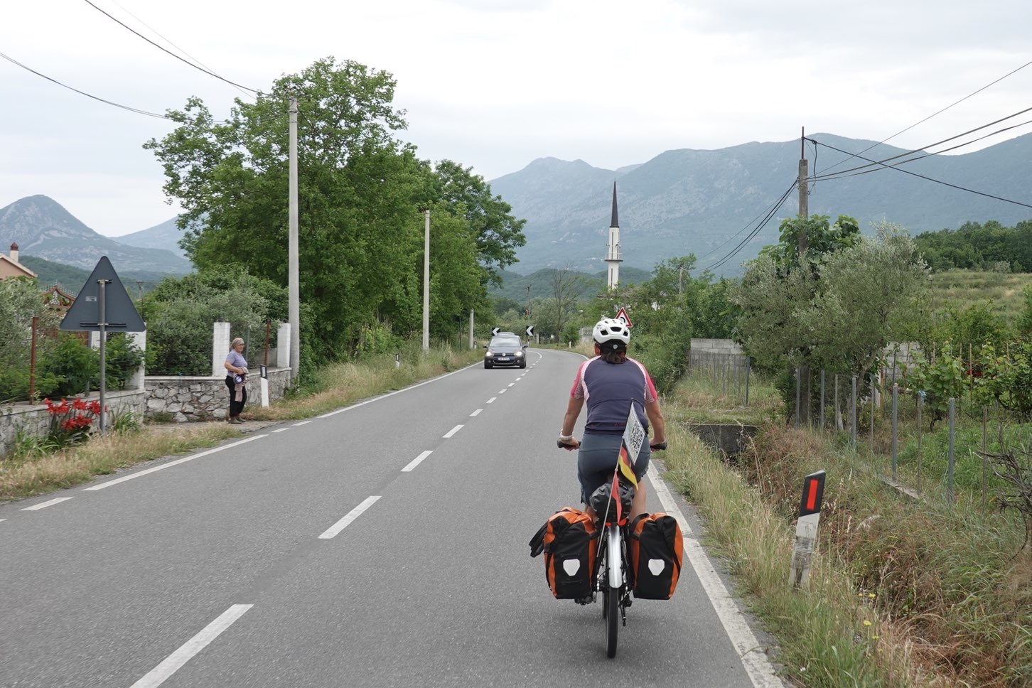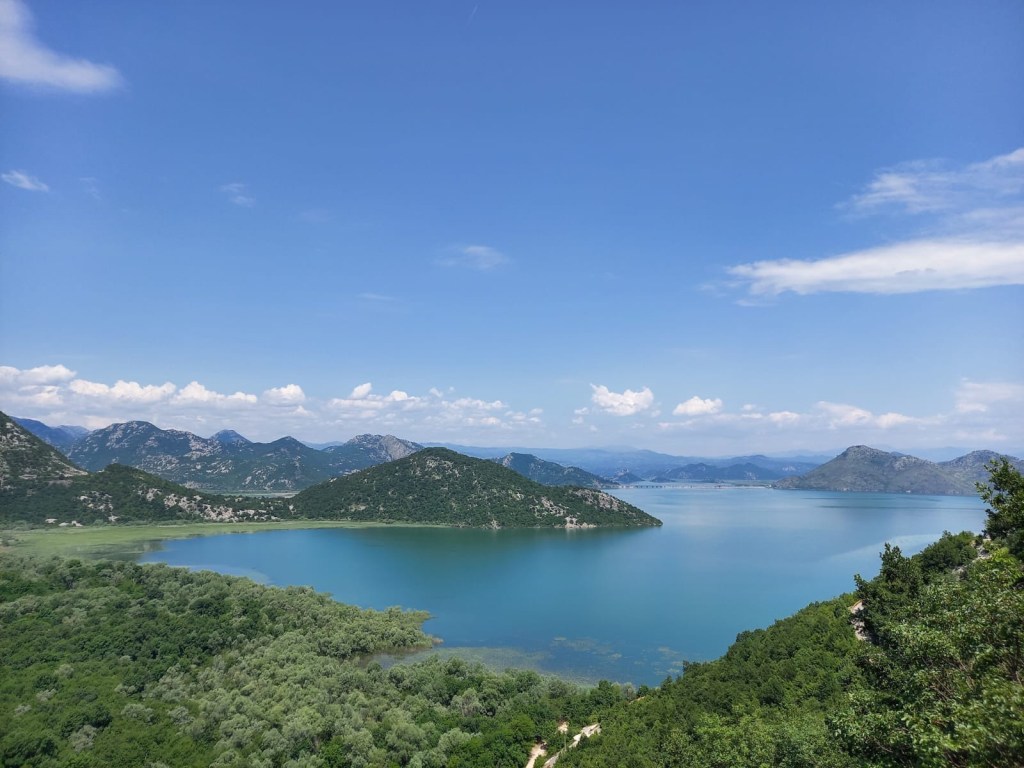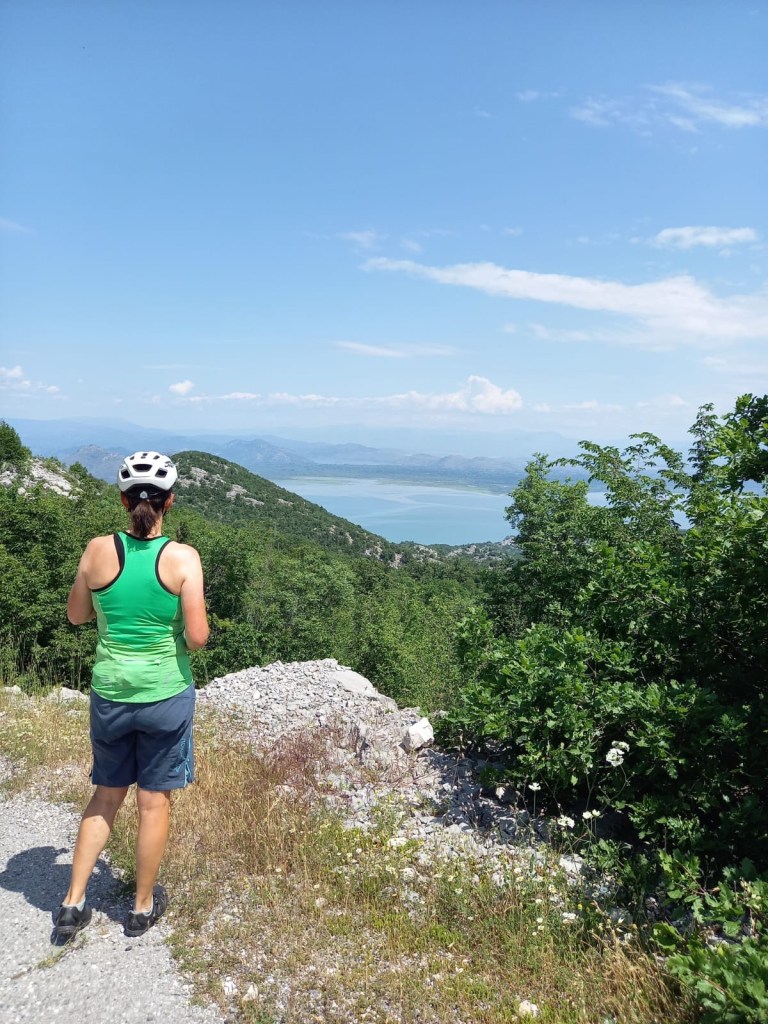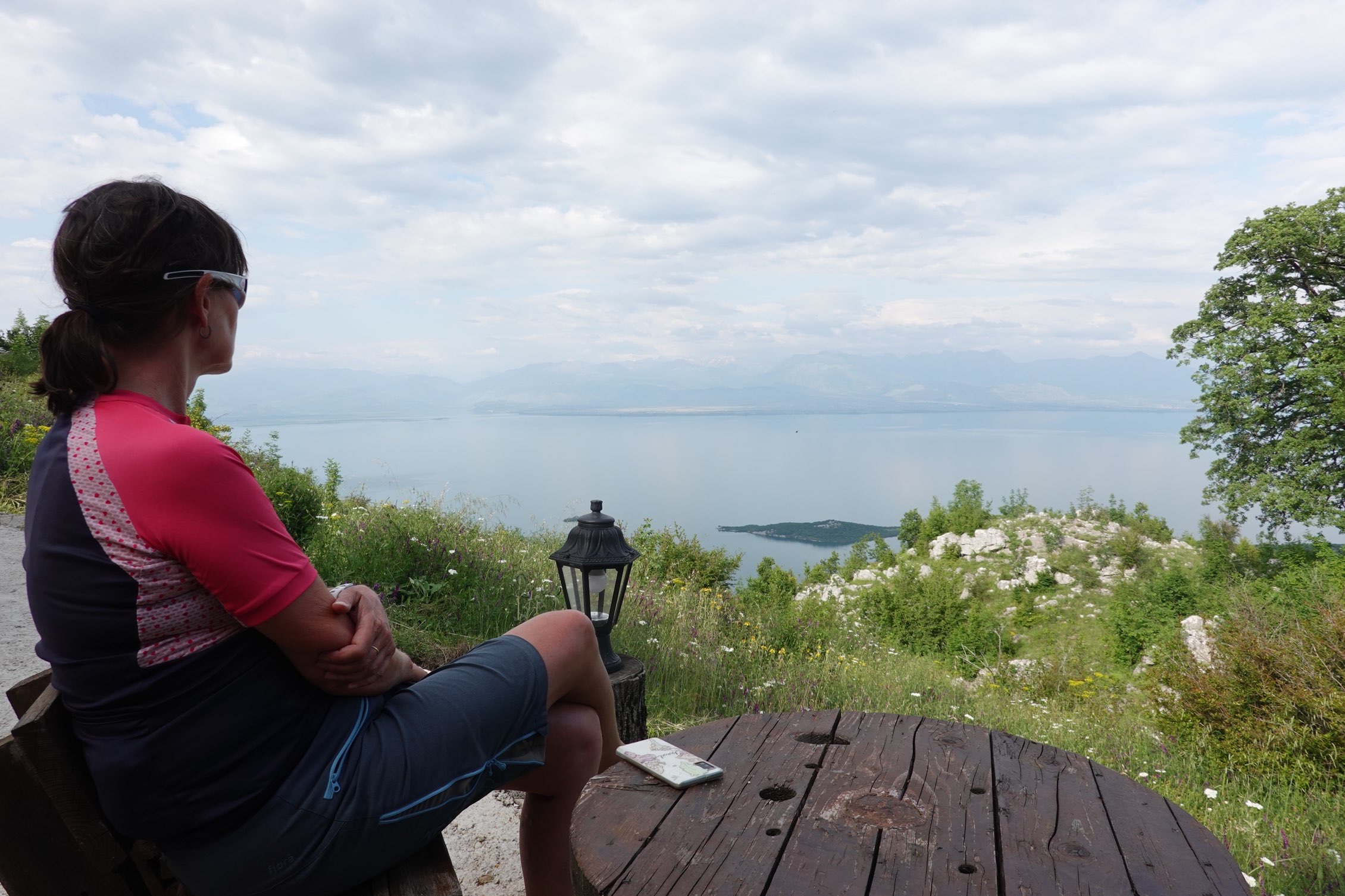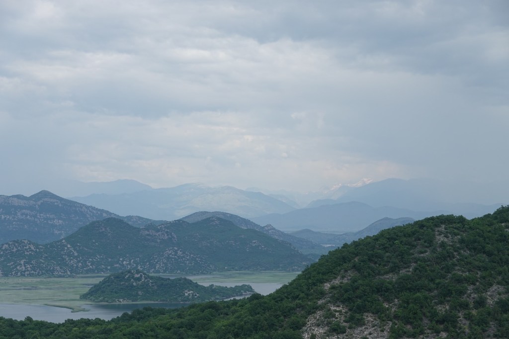 Bis Shkoder fahren wir mitten im Verkehr. Wo wollen die Albaner am Sonntag nur alle hin? Vielleicht ihr Auto waschen lassen? Dazu müssen sie nicht weit fahren. Alle 100m gibt es ein Zelt mit einem Hochdruckreiniger. Überall wird eifrig gesäubert. Was für eine Wasserverschwendung. Oder vielleicht machen einige auch einen Ausflug an den See. Dort wollen wir auch hin. Aber auf die Seite Montenegros. Dazu müssen wir erst einmal über die Grenze. Eine deutsche Zollbeamtin, die von Frontec nach Albanien zur Beobachtung der Grenzkontrollen entsandt wurde, beobachtet uns beim Flaggenwechsel. Sie informiert sich über unsere Reise. Ab der Grenze ist fast kein Verkehr mehr. Wir atmen auf und freuen uns über die grüne Landschaft mit kleinen Dörfern. Heute haben wir ein ganz besonderes Ziel. Der Skadar-See Nationalpark. Jedoch nicht ans Ufer, sondern ein paar hundert Meter weiter oben an einen Aussichtspunkt über dem See. Wir biegen auf eine kleine Bergstraße ab. Sie geht mit konstanter Steigung von mehr als 10 % immer weiter nach oben. Wir kämpfen mit unseren schweren Lasten und schwitzen. Den ersten Pass erreichen wir nach ungefähr anderthalb Stunden Bergfahrt. Wir schauen zurück auf Albanien und sagen Mirupafshim, auf Wiedersehen. Und schauen in Richtung Montenegro auf den Skadar-See und sagen Dobar dan, guten Tag. Was ist das für eine grandiose Aussicht? Wie wunderschön ist der See! Der Legende nach ist er aus den Tränen einer montenegrinischen Fee entstanden. Sein azurblaues Wasser ist auf jeden Fall wie im Märchen. In ein paar Wochen sind die Uferbereiche voller Seerosen. Dann werden die Tränen der Fee in Blumen umgewandelt. Wie toll muss das aussehen. Wir sind nun oben, müssen aber bis zu unserem Ziel noch mal hoch. Zwischendrin fahren wir zu einem Dorf ab. Es geht durch Kastanienwälder mit uralten Bäumen. Meterdicke Stämme aus knorrigem Holz sehen aus wie Fabelwesen. Der zweite Anstieg führt ebenso steil wie der erste an kleinen sauberen Dörfern mit Tabakfeldern vorbei. Dann durch ein Karstgebirge. Die Straße wird immer schmaler. Am Straßenrand blühen üppige Blumen. Wir sehen vielleicht fünf Autos. Wir sind fast allein in der Bergwelt. Am Viewpoint Livari haben wir eine kleine Holzhütte gebucht. Mit Aussicht. Und diese ist noch viel schöner als am Pass. Der ganze See mit seinen vielen kleinen Inseln liegt uns zu Füßen. Dahinter die schneebedeckten Grenzberge zwischen Albanien und Kosovo. Es gibt einen Imbiss, natürlich mit Aussicht, unser Abendessen ist gerettet. Die Familie, die Hütten, Camping und Restaurant betreibt, verlässt am Abend den Ort. Nur ein deutsches Paar mit Camper ist außer uns noch hier oben. Es ist absolut ruhig. Kein Hundebellen, kein Verkehrslärm, noch nicht einmal Hühner gackern. Auch die vielen Schwalben haben sich in ihre Nester begeben. Wir sitzen da und genießen. Montenegro ist wunderschön.