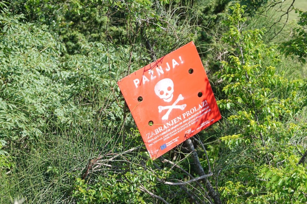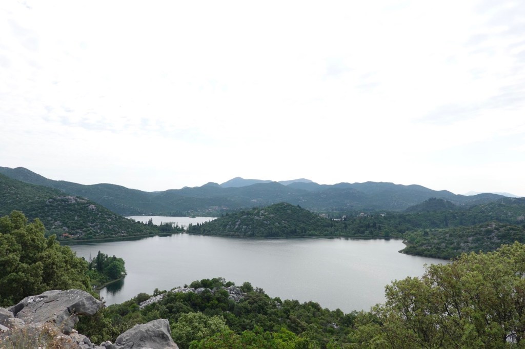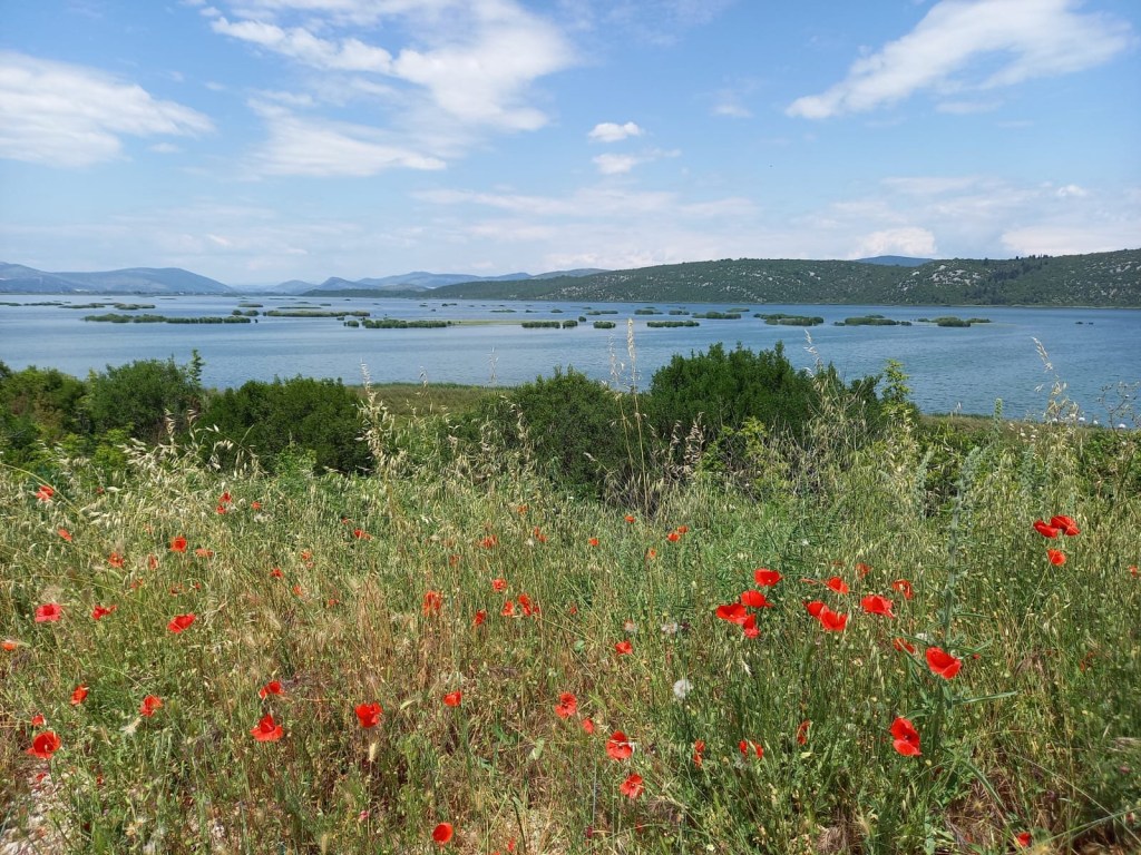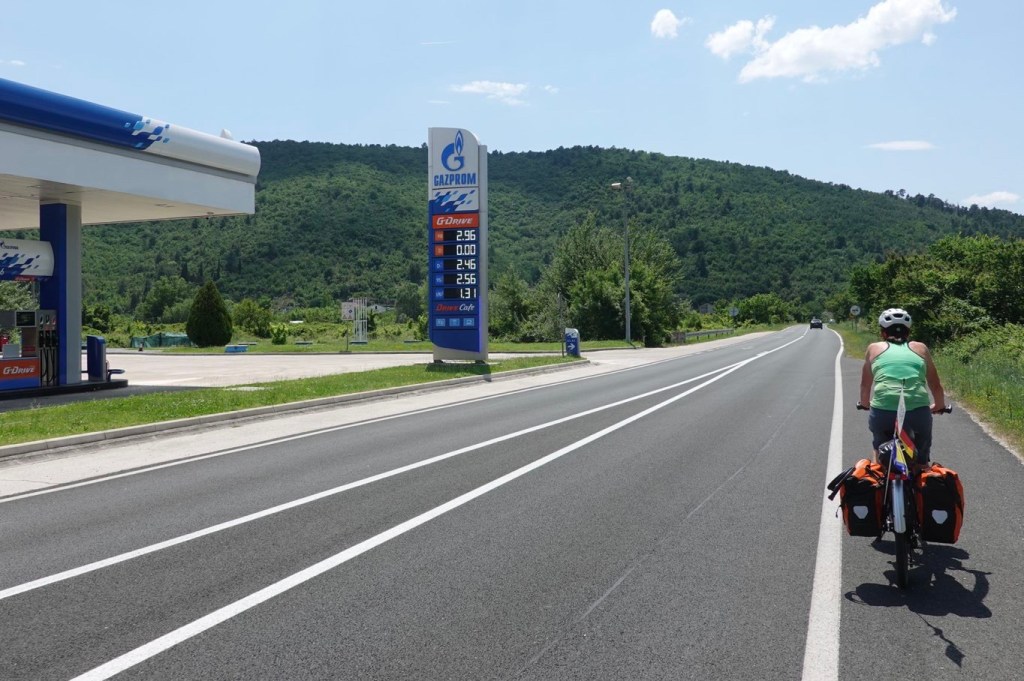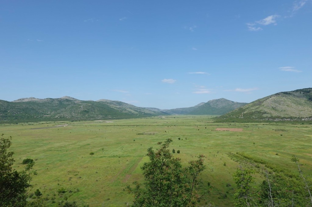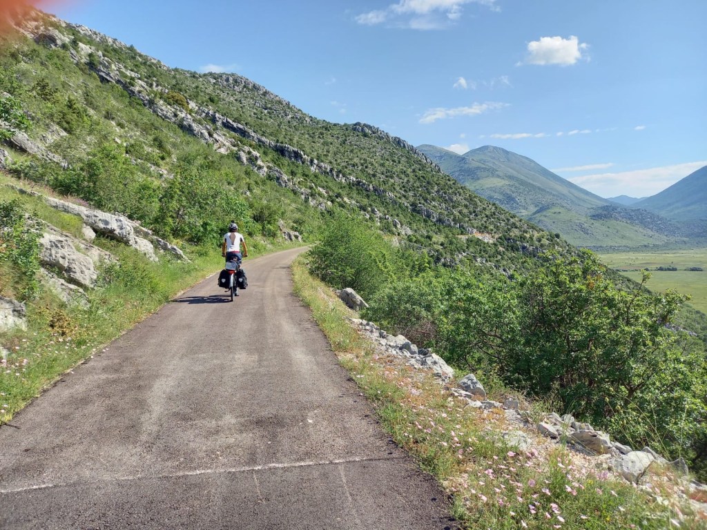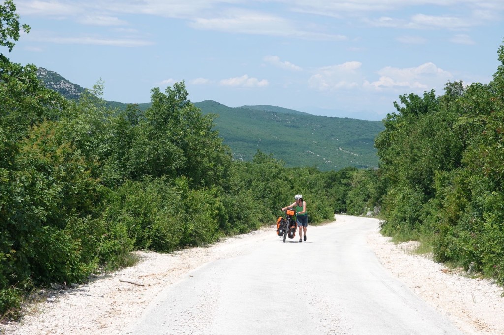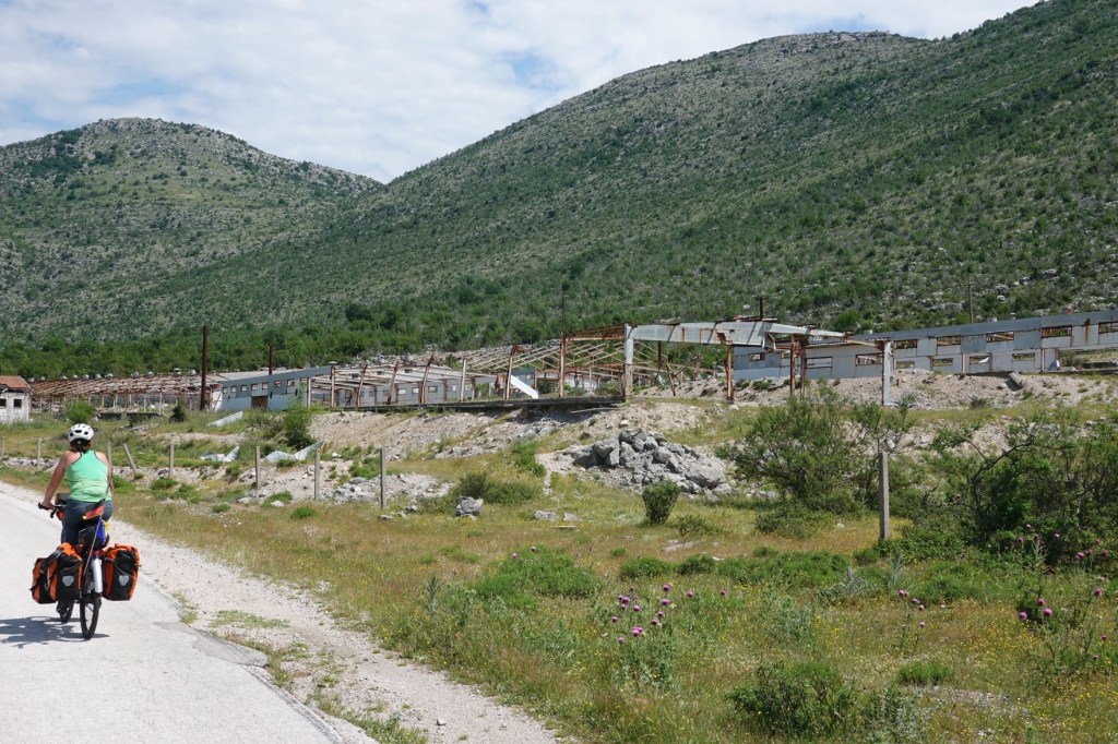 Es ist erstaunlich wieviele Reiseradler wir unterwegs treffen. Fast alle legen riesige Entfernungen zurück. Von Italien nach Istanbul, von Thessaloniki nach Spanien, rings um Adria und Ionisches Meer oder wie wir: von Griechenland nach Mitteleuropa. Die meisten sind in unserem Alter. Sie reisen im Sabbatical oder sind gerade in den Ruhestand eingetreten, wie wir. Alle genießen es, Zeit zu haben und im langsamen Fahrradtempo Europa zu entdecken. Das Münchner Paar in unserem Hotel fährt in umgekehrter Richtung wie wir. So können wir gegenseitig Erfahrungen über die Strecke austauschen. Sie schwärmen uns von der Etappe des Cirô vor, die uns heute erwartet. Er führt über neuen glatten Asphalt. Mit Blick über die riesige Ebene und die Berge Bosnien-Herzogovinas. Sie haben nicht zuviel versprochen. Die Strecke ist phänomenal, erinnert uns erneut an die Winnetou-Filme. Irgendwann müssen wir die Bahntrasse verlassen. Sie ist ab einem großen Stausee unbefestigt und führt durch über 10 Tunnels. Der eine gestern hat gereicht. Es geht bergab. Bis zu einem weiteren See. In der Region hat es tagelang geregnet und es gab viele Überschwemmungen. Auch der See ist weit über seine Ufer getreten. Die Uferbereiche sind voll mit Schlamm.