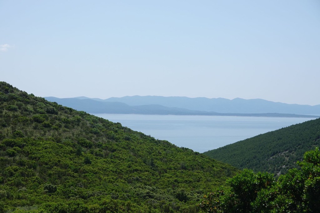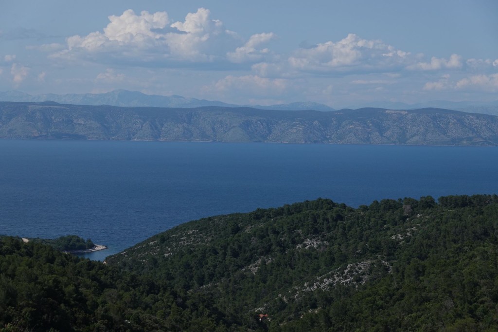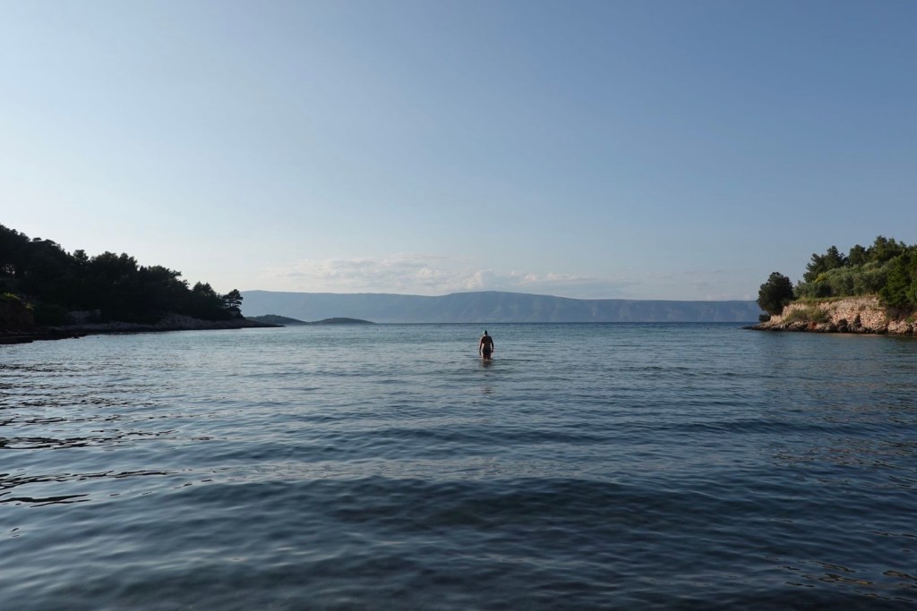 Die Magistrale ist heute am Pfingstsonntag nicht stark befahren. Wir kommen gut bis zur Fähre. Endlich nochmal Schiff fahren. Wir wollen auf die Insel Hvar. 1000 Höhenmeter erwarten uns. Die Insel ist alles andere als flach. Es ist steil, heiß und ohne Schatten. Sabines Tacho zeigt fast 40 Grad in der Sonne. Wir fahren längs über die Insel. Mit Ausblicken zum Festland und auf weitere Inseln. Wir fahren durch Olivenplantagen mit dicken Steinwällen, vorbei an Lavendelfeldern und durch Pinienwälder. Das Meer ist immer 400m tiefer. Ein kurzes Bad zur Erfrischung können wir uns nur für den Abend wünschen. Das klappt dann auch. Der Campingplatz liegt in einer kleinen Bucht direkt am Meer. Wir schwimmen im klaren Wasser und beobachten Seesterne auf dem Boden. Tut das gut. Endlich eine Abkühlung.
