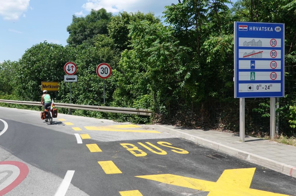 An der Grenze nach Kroatien winken uns die Beamtinnen einfach durch. Wir fahren an einem Fluss entlang bis zur kroatischen Küste. Ein paar Kilometer Magistrale sind es noch bis zu einem Campingplatz. Es ist nicht so viel Verkehr wie vor Dubrovnik. Er wird auf die Autobahn umgeleitet. Zum Campingplatz müssen wir durch eine Baustelle schieben. Autos kommen hier nicht durch. Ob dann der Platz geöffnet hat. Zwei Zelte von Radfahrern stehen schon auf der grünen Wiese. Der Besitzer begrüßt uns herzlich. Er freut sich, dass Radfahrer auf seinen Platz kommen. Ansonsten könnte man nur mit dem Helikopter anreisen. Viel Fläche hat er momentan auch nicht. Auch hier ist eine große Wiese überschwemmt.