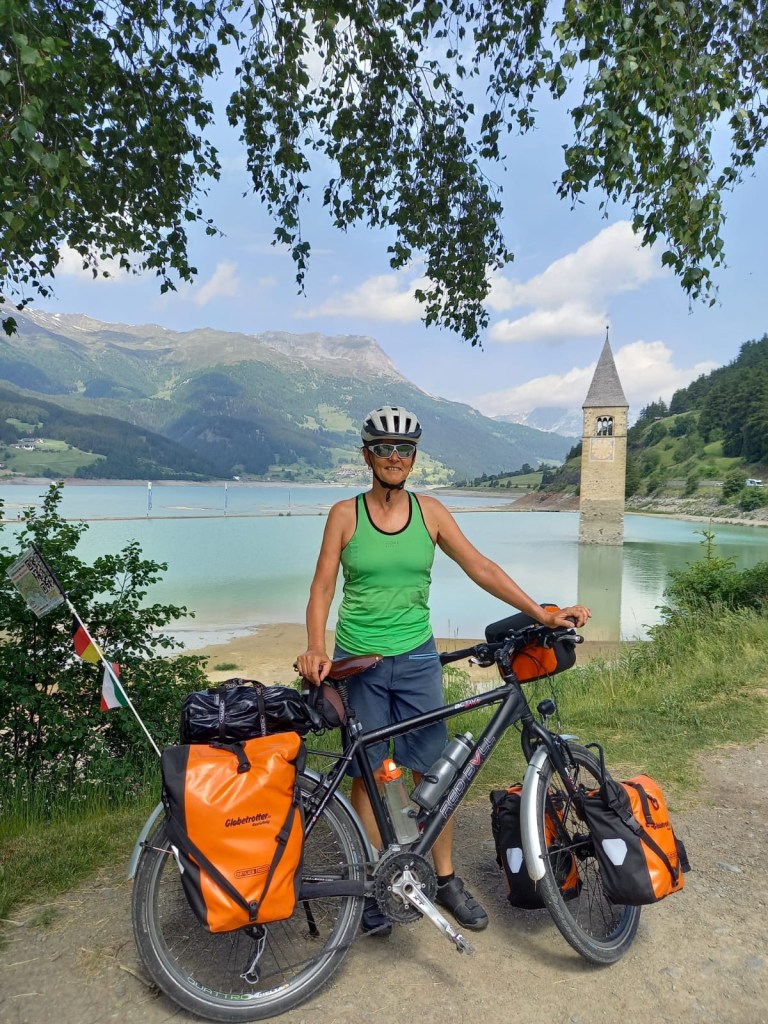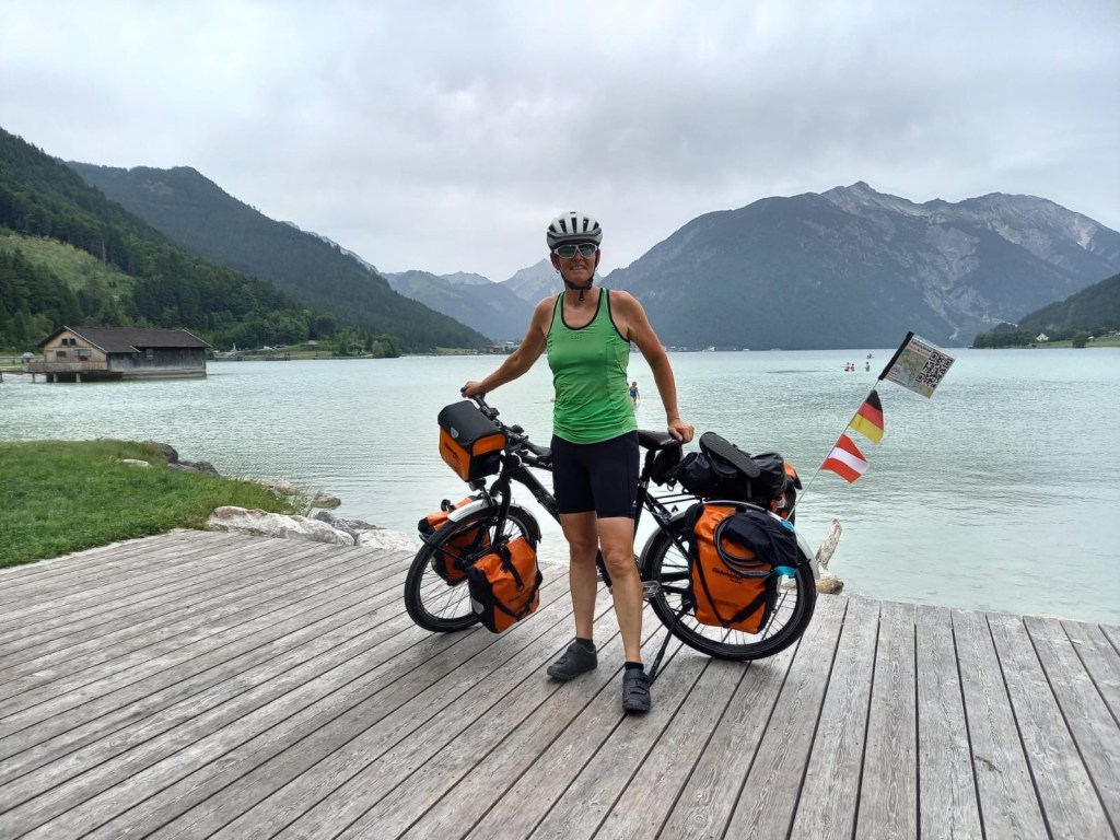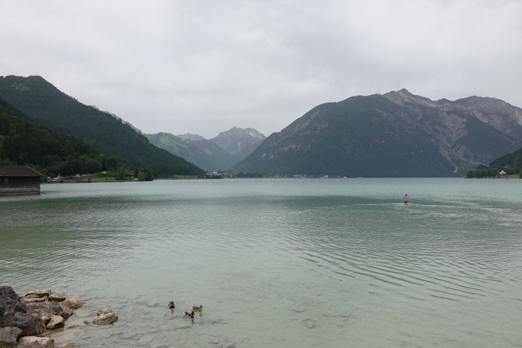 Dann sind wir wieder auf dem Radweg. Oder dem Weg, der Teil des Fernradwegs München-Venedig ist. Er führt über Zufahrten zu Bauernhöfen und schließlich über einen steilen Waldweg nach oben. Wer einen Fernradweg ausschildert, sollte auch mal versuchen, den Weg mit Gepäck zu fahren. Konstante 12 bis 15 % Steigung und loser Gravel ist eine Hausnummer für Radreisende. Sabine und ein junger Gravelbiker aus München schieben. Nur Klaus fährt. Er bekommt dafür größte Hochachtung des Münchners. Ob Schieben oder Fahren, alle kommen wir nass geschwitzt oben an. Ein Bad im kühlen Achensee ist erfrischend.