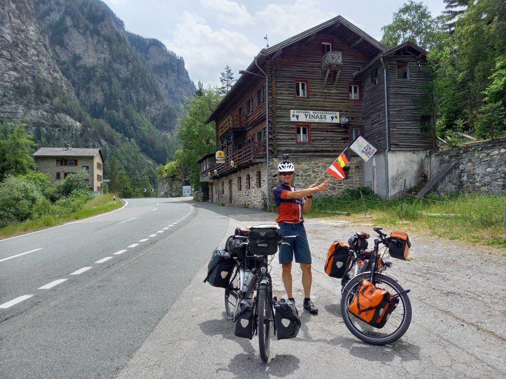Ins Inntal geht es fast nur bergab. Wir legen uns unsere Windwesten bereit. Doch zuerst fahren wir bis zu unserem höchsten Punkt der gesamten Tour. Der Reschenpass liegt auf 1530m Höhe. Fotosession. Wir machen ein Höchster-Punkt-Foto und ein Video. Genau in dem Moment kommt Didier vorbei. Der Franzose aus Grenoble. Es hat sich bewahrheitet: wir treffen uns zum dritten Mal. Dann geht es runter nach Nauders über die Grenze nach Österreich. Hier waren wir im Winter 2022 zum Langlaufen. Ohne Schnee sieht alles anders aus, aber wir erkennen die Loipen wieder.