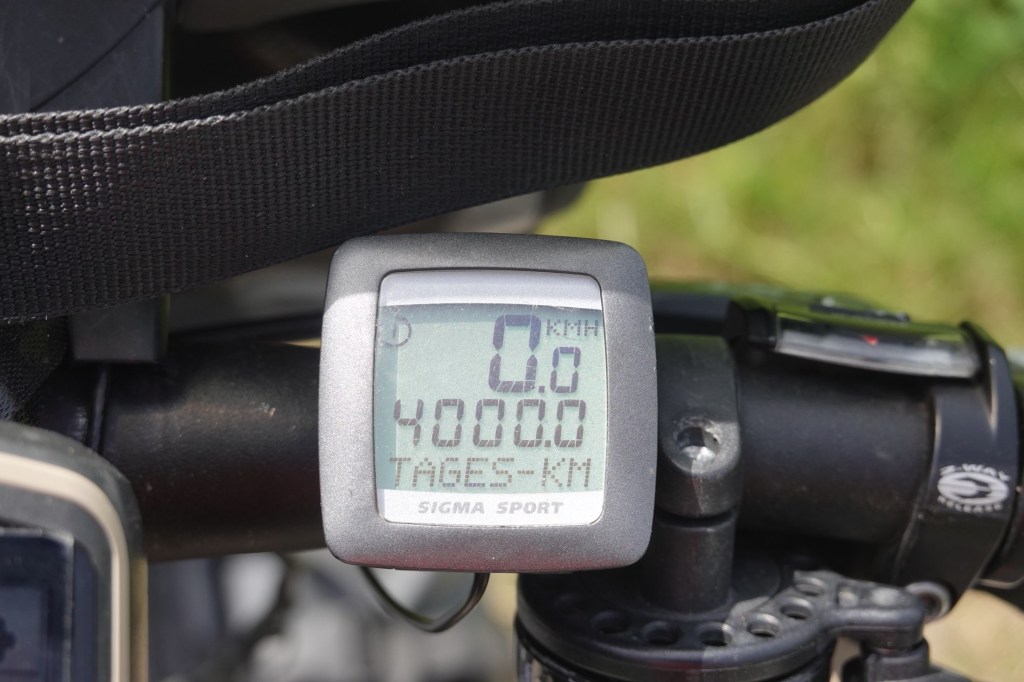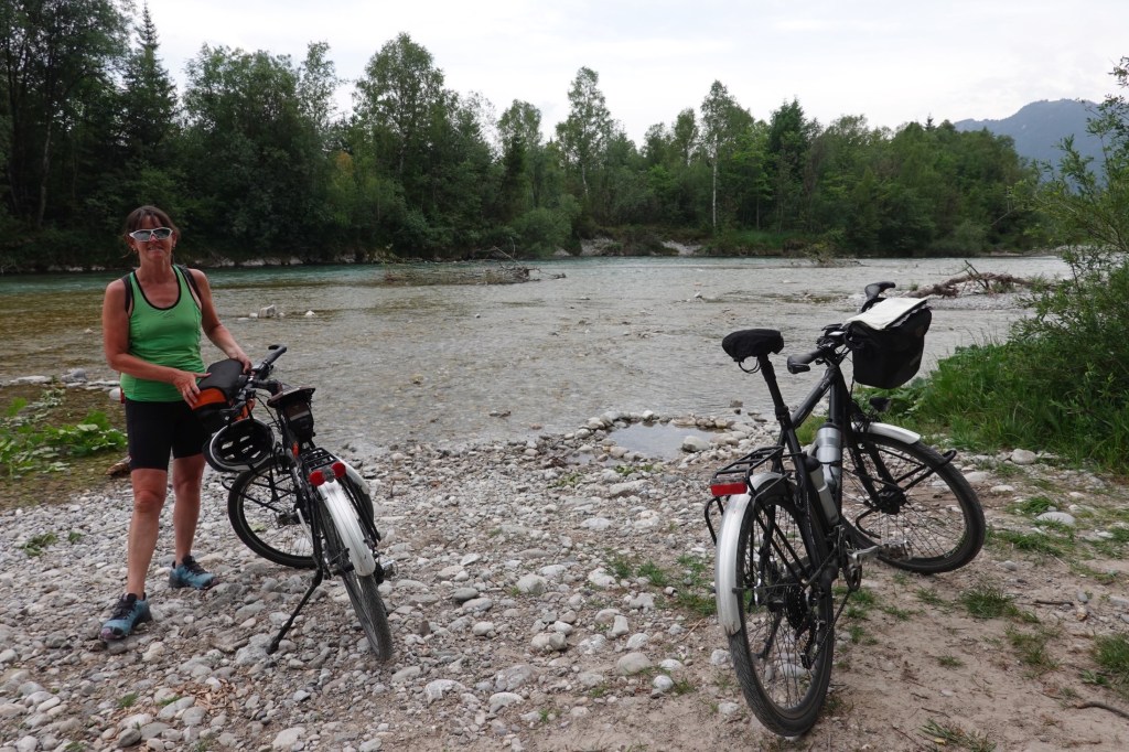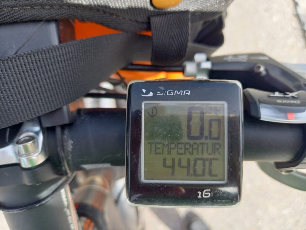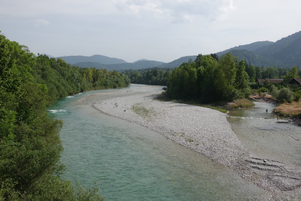 Dann geht es runter nach Lenggries. Kein kühlender Fahrtwind . Im Gegenteil. Es wird immer heißer. Am Sylvensteinstausee dann der Rekord. Sabines Thermometer am Tacho zeigt 44 Grad. Wir halten unsere Köpfe unter einen Brunnen. An der Isar herrscht überall Badebetrieb. Auch wir baden noch kurz nachdem wir unser Zelt in der Nähe von Lenggries aufgebaut haben. Heute Nacht soll die Abkühlung kommen. Mit Gewittern und Schauern. Wir haben die Alpen überquert. Die Hügel des Alpenvorlandes warten.