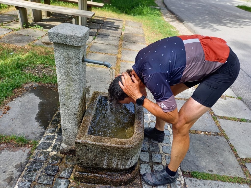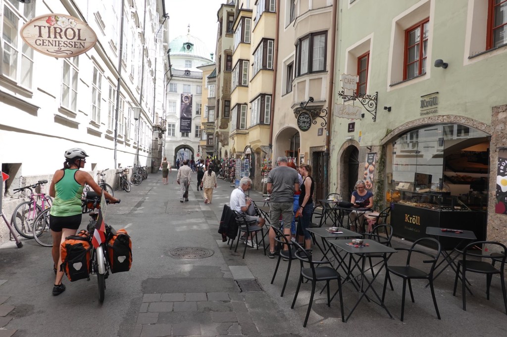 Der Inntalradweg ist nicht gerade spannend. Bis Landeck gestern war er noch abwechslungsreich. Aber heute ist er oft langweilig und öde. Neben der Autobahn, schnurgerade über Felder, wenig Schatten und bei 40 Grad sehr anstrengend. Wir fahren unter die Wassersprenger der Bauern, halten unsere Köpfe unter Brunnen und kühlen uns unter Duschen ab, die extra für die Radfahrer aufgestellt wurden. Innsbruck statten wir einen kurzen Besuch ab. Wir schieben durch die Altstadt bis zum Goldenen Dachl.