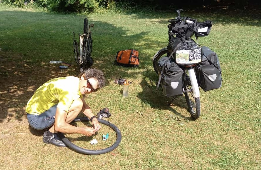 Alles gepackt und startklar. Oh, Mist. Sabines Rad hat einen Platten. Taschen noch mal runter vom Rad, Reifen ab und Schlauch flicken. Es dauert. Der Fehler ist nicht zu erkennen. Endlich kann es losgehen. Nach 500 m fehlt wieder Luft. Alles nochmal von vorne. Diesmal ohne Flicken sondern mit neuem Schlauch. Wir fahren verspätet los.