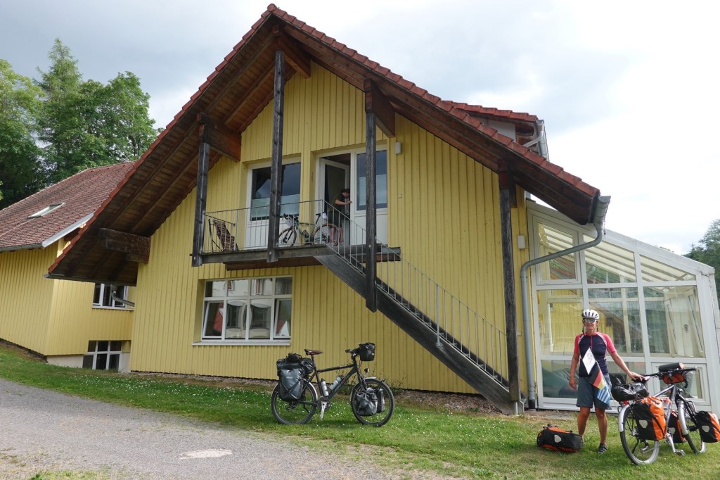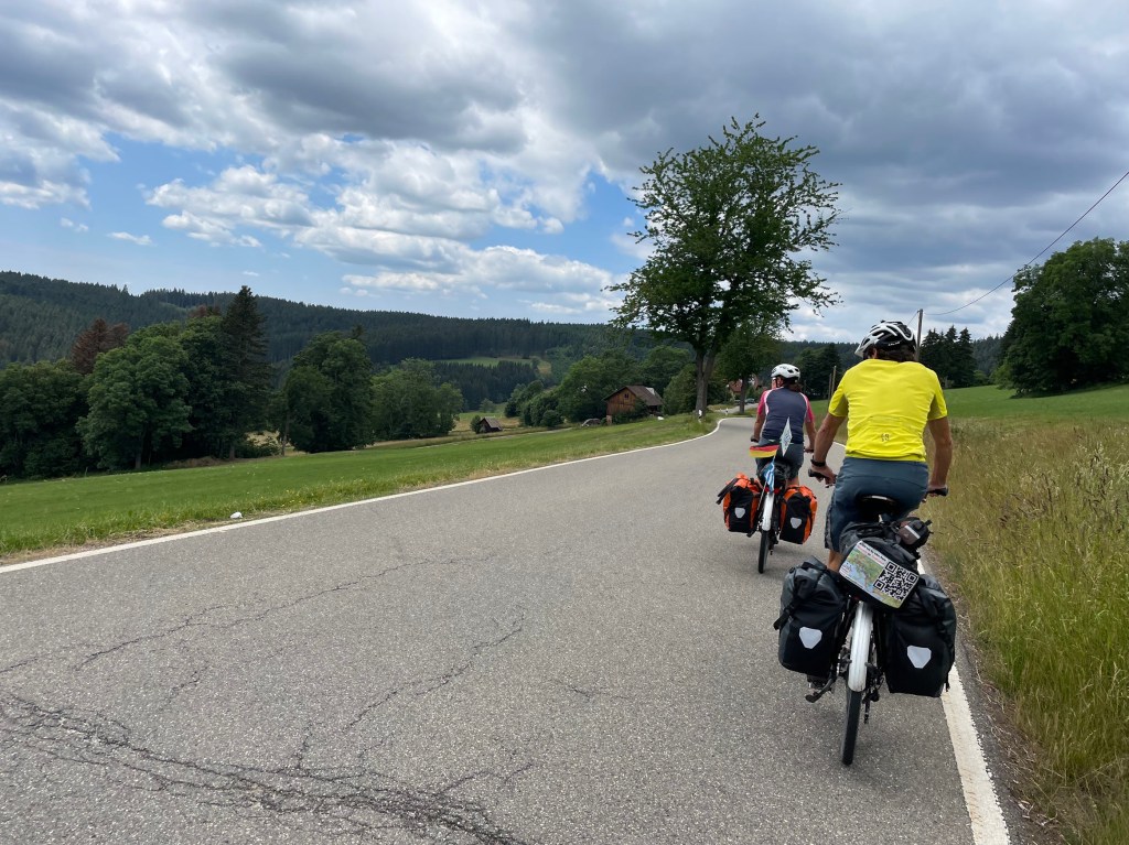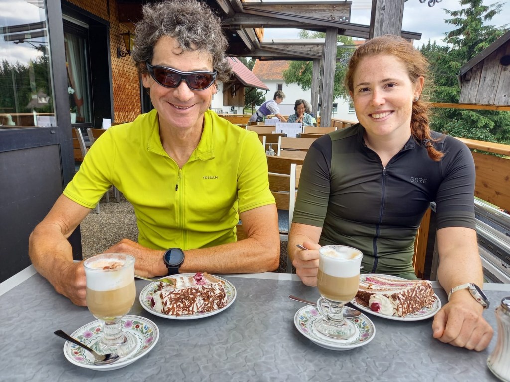 Dann fahren wir bergauf in den Schwarzwald. Sarah hat noch Unterricht. Danach kommt sie uns entgegen. Kurz vor unserem höchsten Punkt auf 1050 m sehen wir sie. Es ist schön nach so langer Zeit wieder zusammen zu sein. Das muss gefeiert werden. Mit einem Stück Schwarzwälder Kirschtorte, mit was sonst im Schwarzwald? Wir finden ein uriges Bergcafé. Sarah hat eine steile Straße hinunter zum Titisee ausgewählt. Sabine kann nur langsam fahren. Ihr Rad ist defekt. Irgendwas ist an der Lenkung. In Neustadt hilft der örtliche Radshop spontan. Der Steuersatz ist komplett kaputt. Bis ins Saarland kann sie so nicht mehr fahren. Doch innerhalb einer halben Stunde ist er ausgetauscht. Für Radreisende haben Fahrradmechaniker doch ein besonderes Herz. Erleichtert fahren wir nach Hinterzarten. Dort wollen wir bis Dienstag bleiben, etwas Rad fahren und wandern. Und die Familienzeit genießen.