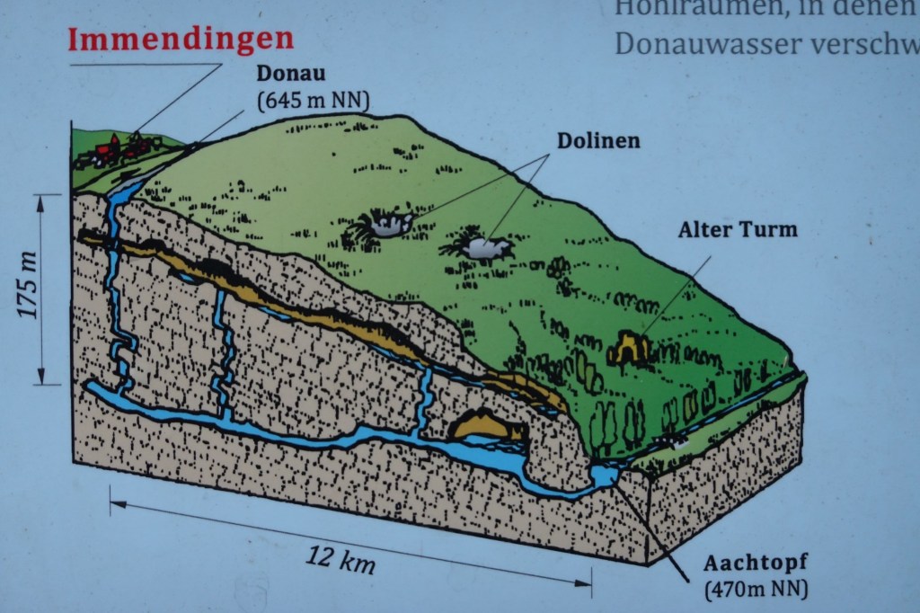 Die Versickerung der Donau haben wir vor ein paar Jahren schon gesehen. Aber, wenn wir schon mal da sind… Vor dem Frühstück wollen wir noch schnell zu der Stelle, wo das Wasser der Donau verschwindet. Es versickert im löcherigen Karstboden und fließt unterirdisch 14 km weiter und 175 m tiefer. Es tritt in der Aachquelle wieder hervor. Von dort fließt es in den Rhein. Die Donau verliert also den größten Teil ihres Quellwassers an den Rhein. Hinter Immendingen ist das Flussbett an ca. 260 Tagen im Jahr trocken. Der Weg dorthin ist für Fahrräder gesperrt. Doch morgens um 7 ist da noch keiner. Wir fahren los. Um dann doch zu schieben, denn es ist nur ein holpriger Pfad. Zurück können wir über den Radweg. In Donaueschingen schauen wir uns noch den sogenannten Donauursprung und die Donauquelle an.