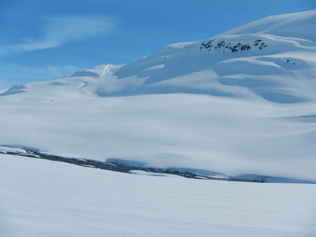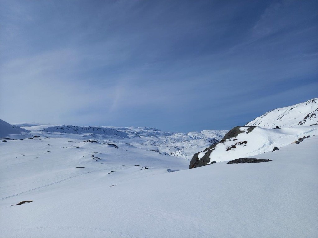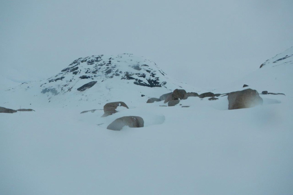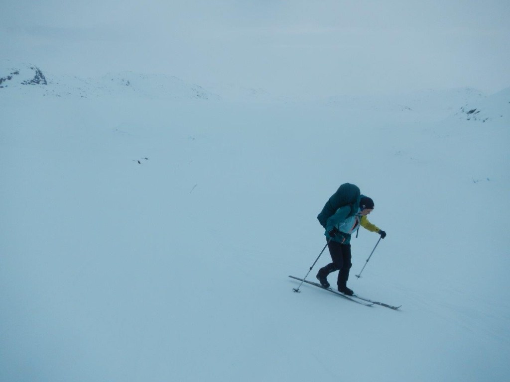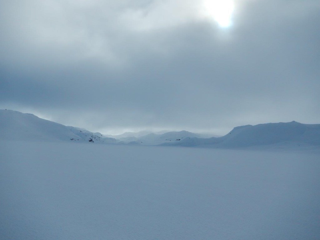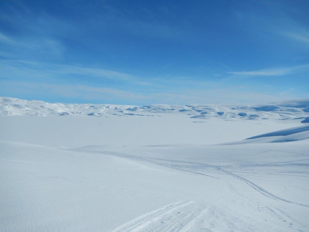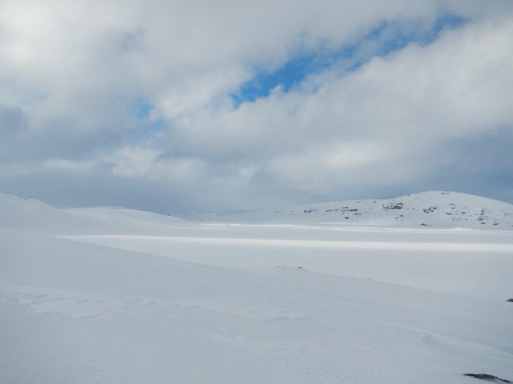 Endlich geschafft. Wir haben wieder festen Boden unter den Füßen. Zu fest. Der steile Hang, den wir hoch müssen, ist vereist. 500hm auf vereistem Firnschnee steigen wir mit unseren Fellen unter den Ski nach oben. Die Sonne scheint. In Jonstølen war es noch warm. Wir haben extra weniger angezogen als gestern. Je weiter wir nach oben kommen, desto kälter wird es. Ein heftiger eisiger Wind kühlt uns trotz der Anstrengung bergauf mächtig aus. Öfters weht er uns fast um. Zwei Schneemobile mit Rangern kommen uns entgegen. Sie halten an. Wir sollen auf dem nächsten See vorsichtig sein. Eine wilde Rentierherde zieht umher. Leider sehen wir sie nicht. Obwohl wir ständig alle hänge absuchen. Schade. Es geht wieder bergauf. Am höchsten Punkt schnallen wir die Felle ab. Zum Abfahren sind sie schlecht geeignet.