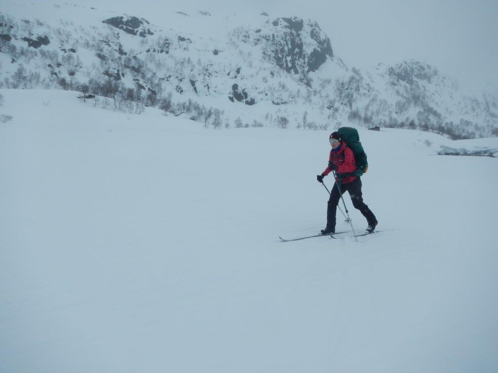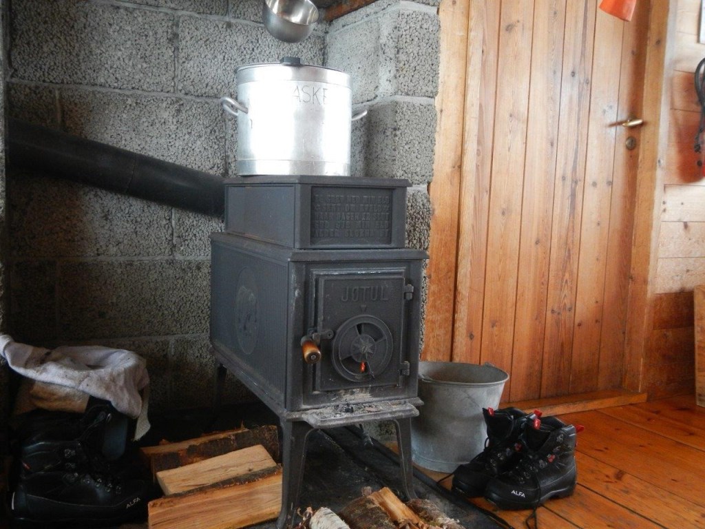 Und dann müssen wir doch mitten in der Nacht raus. Im Sturm zur Toilette. Alle Kleider, Schuhe, Mütze, Handschuhe…anziehen, für die 30m zum Toilettenhäuschen. Der Wind wirft uns fast um und nasser Schnee peitscht uns ins Gesicht. Mitten in der Nacht. Nicht zu ändern. Wir haben für unterwegs nur zwei Liter Wasser für uns zusammen. Unseren Flüssigkeitsbedarf können wir nur abends auffüllen. Mit Tee aus geschmolzenem Schneewasser. Der Tee treibt uns nachts aus dem Schlaf. Die beiden Norwegerinnen auf Litle Aurådalen haben Rotwein, Crémant und Schnaps auf ihrer Pulka mitgebracht. Sie feiern Geburtstag. Und schlafen lange. Wir frühstücken zeitig unsere Hafergrütze und Brote. Es weht immer noch ein starker Wind. Dazu kommt Schneeregen. Es ist warm. Über 0°C. Wir gehen frontal gegen den Wind. In kurzer Zeit sind wir nass. Die Brillen sind voller Wassertropfen. Egal, es ist halt so. Das Wetter fragt nicht danach, ob wir gerade auf Skitour sind. Wir sind in der Nähe des norwegischen Fjordlandes. Zum Lysefjord mit dem berühmten Preikestolen waren es gestern ca. 10 km Luftlinie. Und im Fjordland gibt es ungefähr in der Hälfte des Jahres Niederschläge. Schönes Wetter ist Glücksache. Am letzten Wochenende gab es hier tolles Wetter und sogar Nordlichter in der Nacht. In Südnorwegen eher selten. Das schöne Wetter ist vorbei. Wir müssen uns damit arrangieren. Also weiter nach Storsteinen. Nach einigen Kilometern lässt der Schneeregen nach. Gegen heftigen Wind kämpfen wir uns hoch bis zur Hütte. Wir sind sogar wieder trocken. Die Hütte liegt in der Nähe eines Reservates für die südlichste Rentierpopulation Europas. Nur ein Wanderweg quert das Gebiet. Sonst ist es für Menschen tabu. Rentiere sind die Fjellnomaden. Sie brauchen ein großes Terrain zum Umherziehen. Und spezielle Zonen zum Kalben. Mit dem Schutzgebiet hat Norwegen ihnen einen Lebensraum geschaffen. Die Norwegerinnen erzählen uns, dass es momentan Diskussionen darüber gibt, das Gebiet zu vergrößern. Unsere heutige und morgige Hütte müsste dann umgelegt werden. Eine teure Sache für den DNT. Und ähnlich schöne Plätze müssten auch noch gefunden werden. In Storsteinen können wir die Nähe der Fjorde erahnen. Schroffe steile Felswände fallen nach Westen hin ab. Die Hütte ist relativ neu. Außer Felix aus Berlin sind wir die einzigen Besucher heute. Wir machen das Feuer im Guss-Ofen an und genießen den Nachmittag und Abend. Draußen stürmt es immer noch.