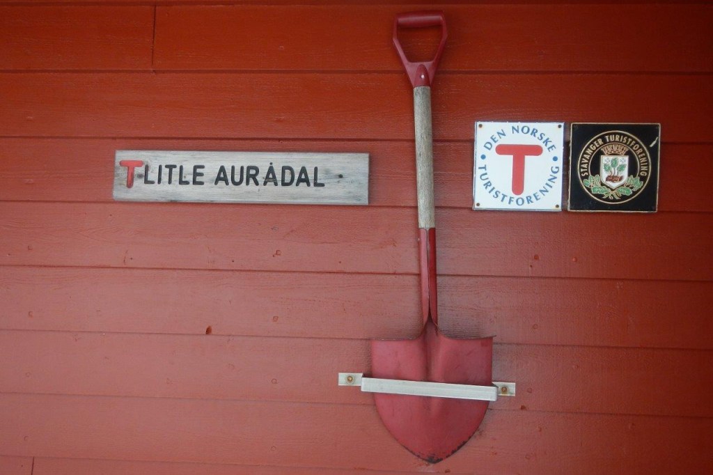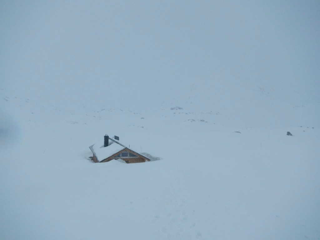 Wir werden früh wach. Die ganze Nacht schon drückt uns die Blase. Zum Toilettenhäuschen mit Plumpsklo müssen wir durch tiefen Schnee stapfen. Da bleiben wir doch nachts lieber im warmen Schlafsack. Doch jetzt pressierts. Es ist windig, aber noch nicht stürmisch. Nach dem Frühstück gehen wir los. Die Route verläuft über einen Pass und einen riesigen See. Und immer gegen den Wind. Es schneit. Wir können die Topografie nicht richtig abschätzen. Klaus gleitet bergab und stürzt. Er hat einen kleinen Abhang nichtgesehen. Alles ist weiß und es gibt keine Konturen. Auf dem See haben wir den Eindruck, dass wir stetig bergauf laufen. Der Wind bremst uns aus und die Ski laufen schlecht auf dem nassen Schnee. Stellenweise kleben sie richtig fest. Es bilden sich Stollen aus Schnee unter den Schuppen. Zur Litle Auradalen Hütte geht es dann auch noch mit stollenden Ski bergauf. Sie liegt oberhalb eines Bergsees mitten in den Bergen. Bei schönem Wetter lädt eine Bank am Eingang dazu ein, die Aussicht zu genießen. Wir machen es uns lieber in der Hütte gemütlich.