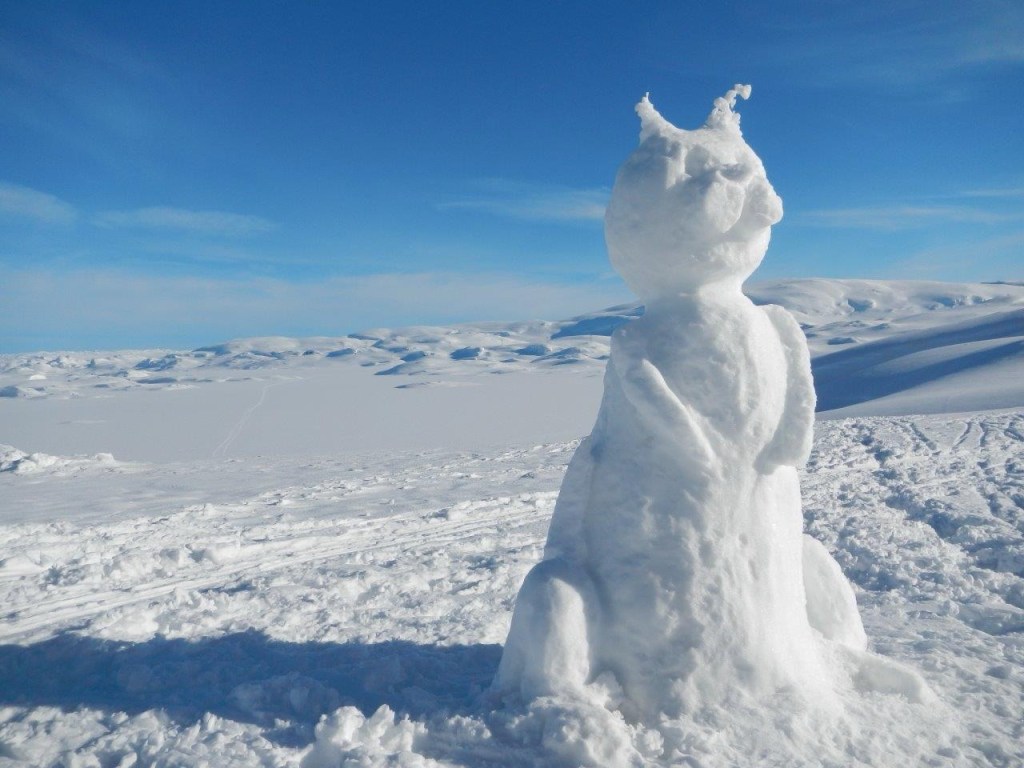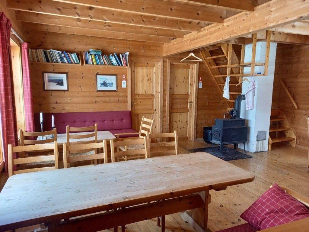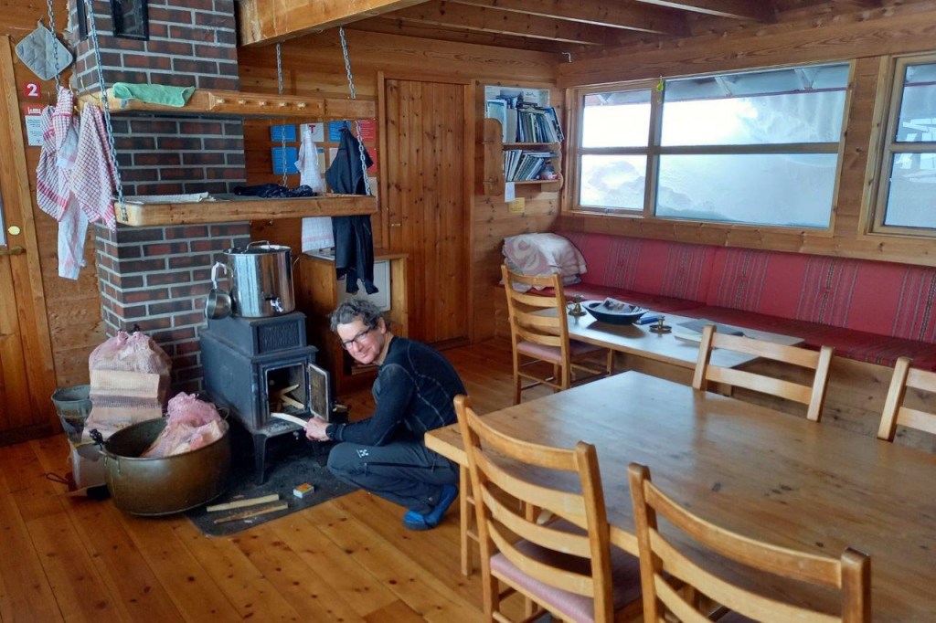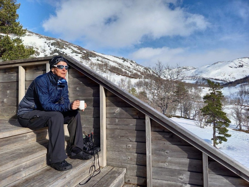 Eine Norwegerin mit Pulka leistet uns Gesellschaft. Sie ist ein paar Wochen ganz alleine unterwegs. Im Sommer arbeitet sie als Guide im Dovrefjell und führt Touristen zu den dort lebenden Moschus-Ochsen. Sie sind die einzigen ihrer Art in Europa. Sonst gibt es sie nur in Nordamerika. Wieder eine nette Begegnung mit einer interessanten mutigen jungen Frau. Unsere Abende sind nicht langweilig. Wir genießen die Zeit bis zum Schlafen vor dem warmen Holzfeuer mit Gesprächen, Lesen, Schreiben, Spielen und Sabine auch mit Stricken. Digitale Medien fehlen uns nicht. Nur eine Nachricht, dass es uns gut geht, würden wir gerne mal nach Hause schicken. Ohne Mobilfunknetz ist das leider nicht möglich.