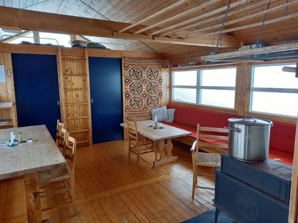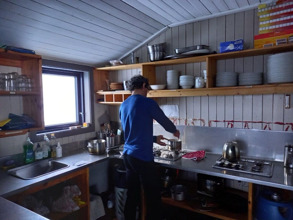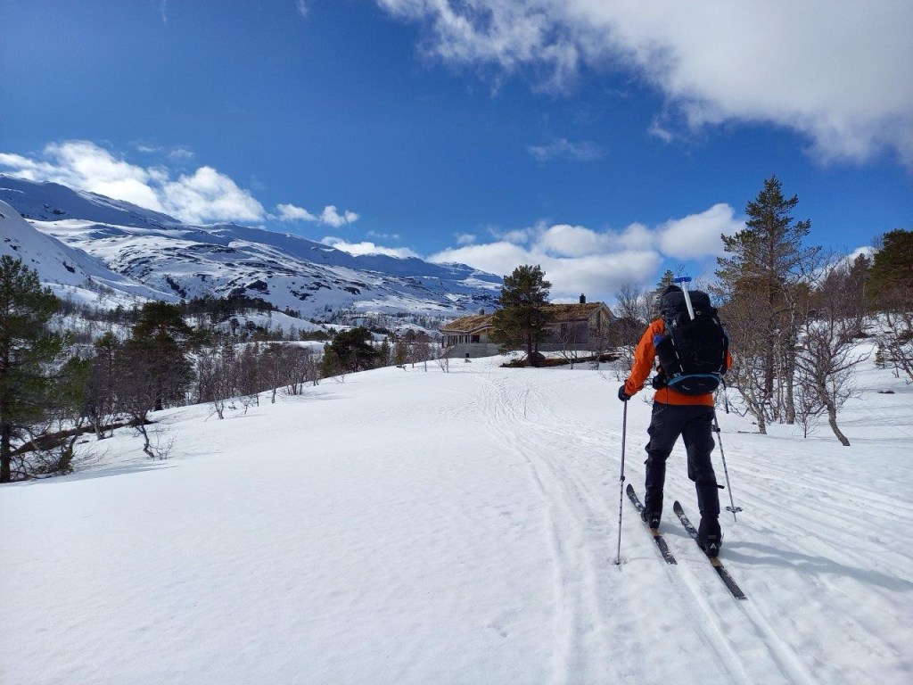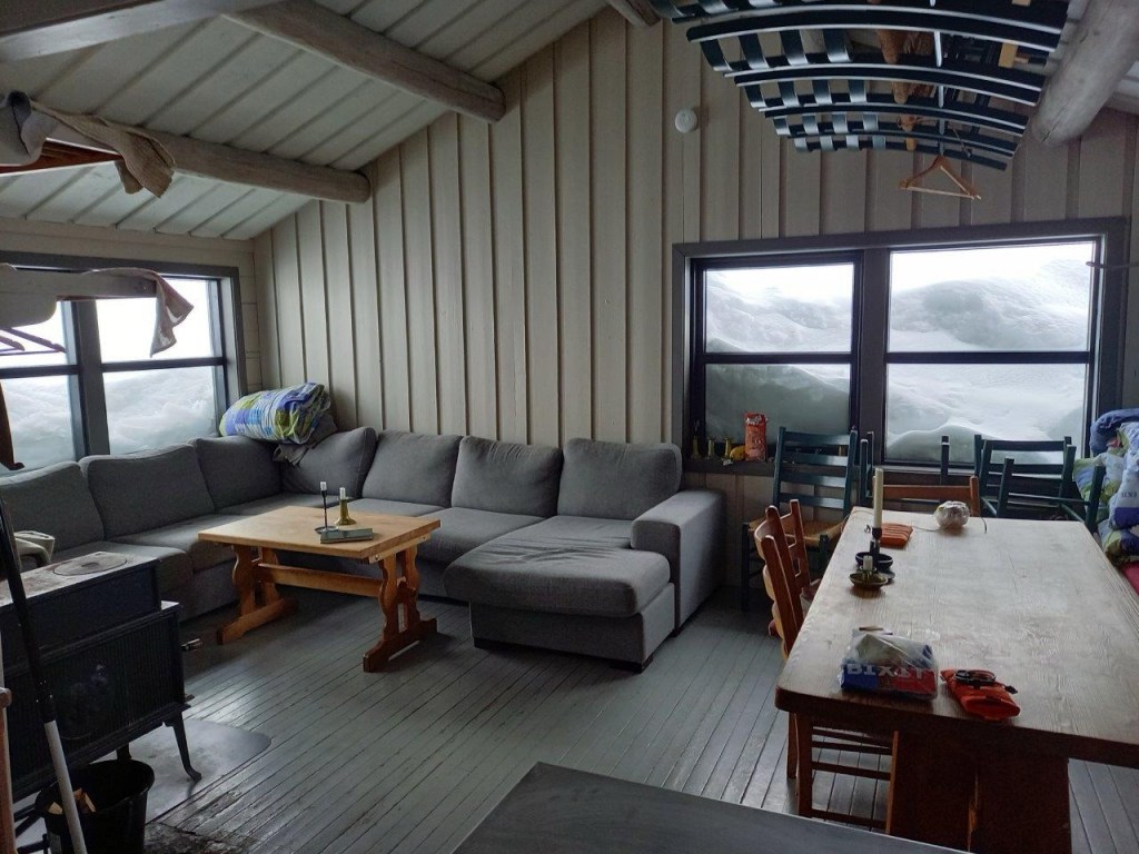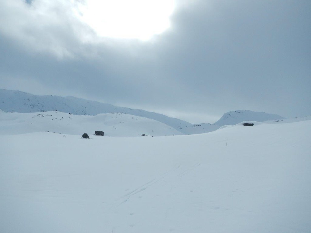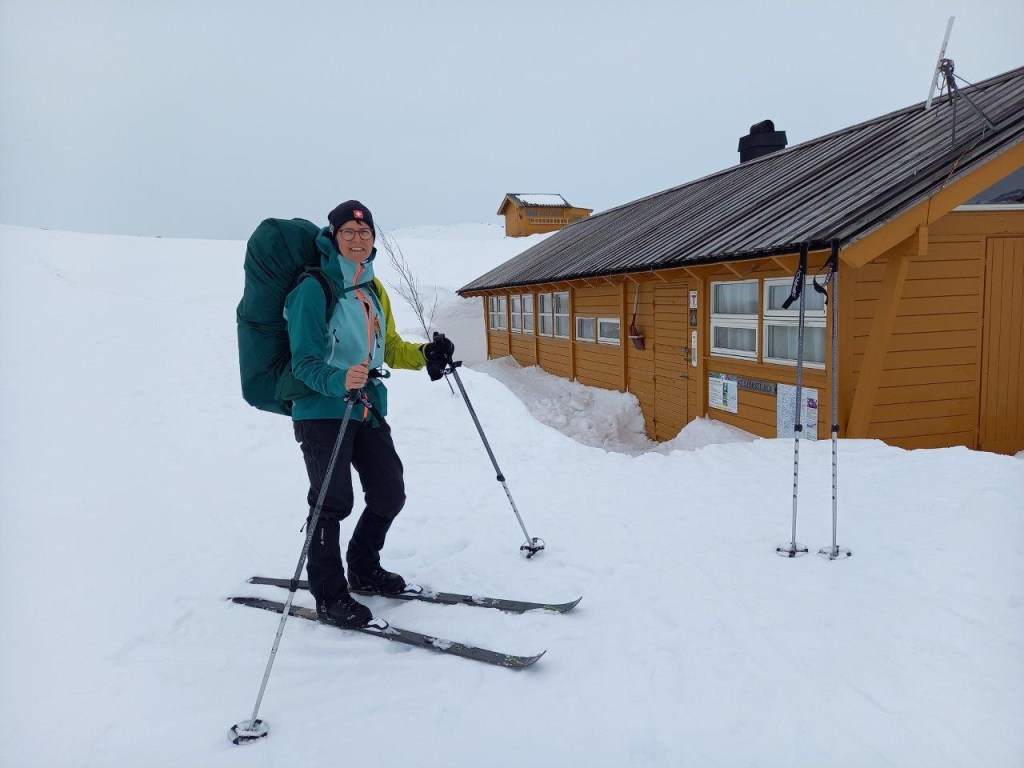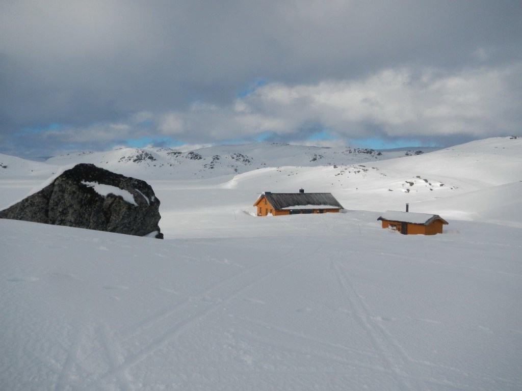 Es geht rauf und runter. Nun sehen wir auch die Konturen im Schnee und können bergab auch mal laufen lassen. Doch nicht sehr lange. Die Wolken kommen zurück. An der Hütte werden wir noch von einem Schauer aus nassem Schnee, fast Regen empfangen. Schnell in die Hütte. Wir machen es uns gemütlich. Bis zwei Norwegerinnen in der Hütte ein Durcheinander aus Kleidungsstücken, Rucksäcken, Essen… veranstalten. Mehr Tourengänger werden es an dem Abend aber nicht.