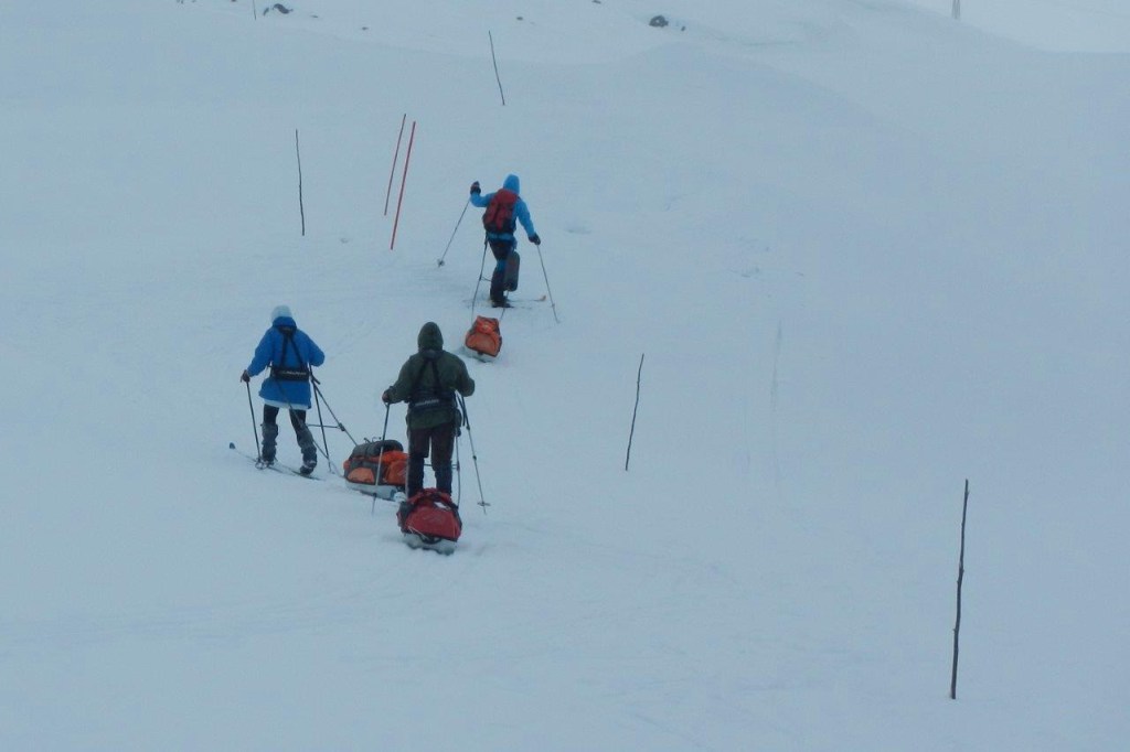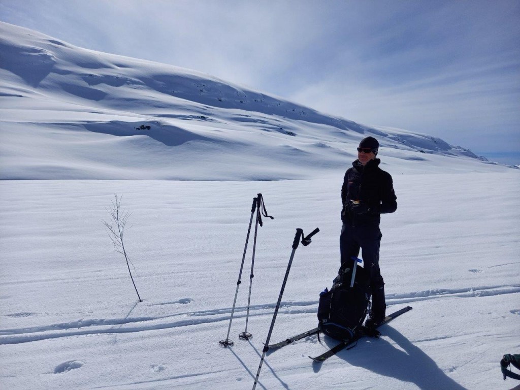 Durch hohen Schnee kämpfen wir uns auf einen Pass hoch. Auf der anderen Seite geht es in ein tiefes, enges Tal hinunter. So steil wie eine schwarze Alpinpiste in den Alpen. Zu steil und zu tiefer Schnee zum Abfahren mit Langlaufski. Wir nehmen die Ski auf die Schulter und stapfen zu Fuß hinunter. Im tiefen Schnee sacken wir ein, haben aber guten Halt. Unten schnallen wir die Ski wieder an. In der Sonne machen wir die erste Pause seit fünf Tagen. Ein Schneehuhn leistet uns Gesellschaft. Dann fliegt es laut gackernd davon.