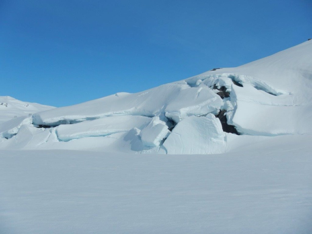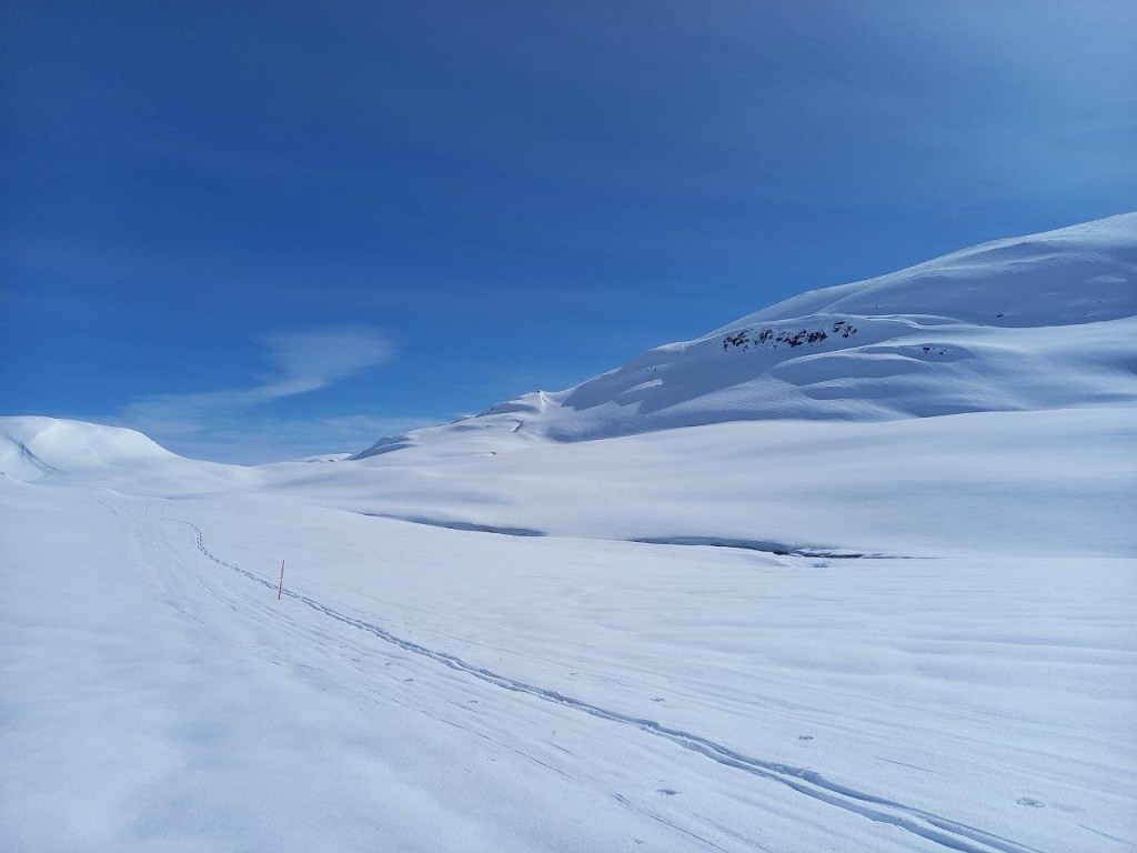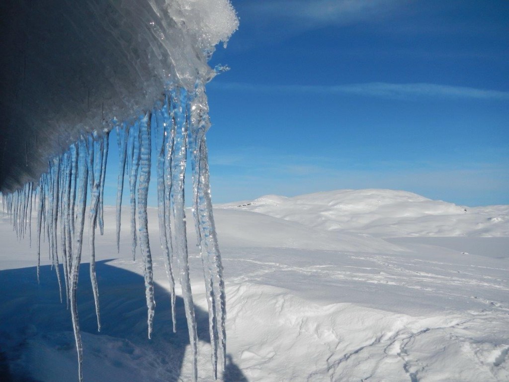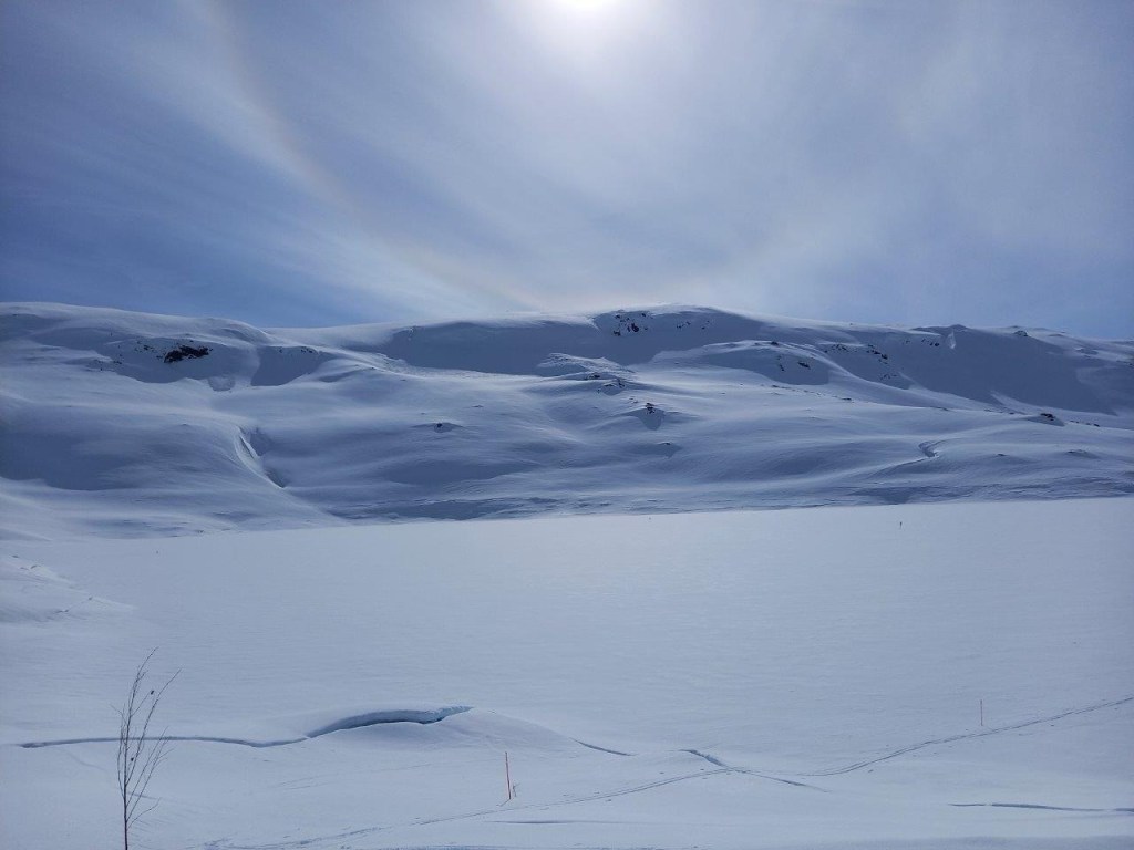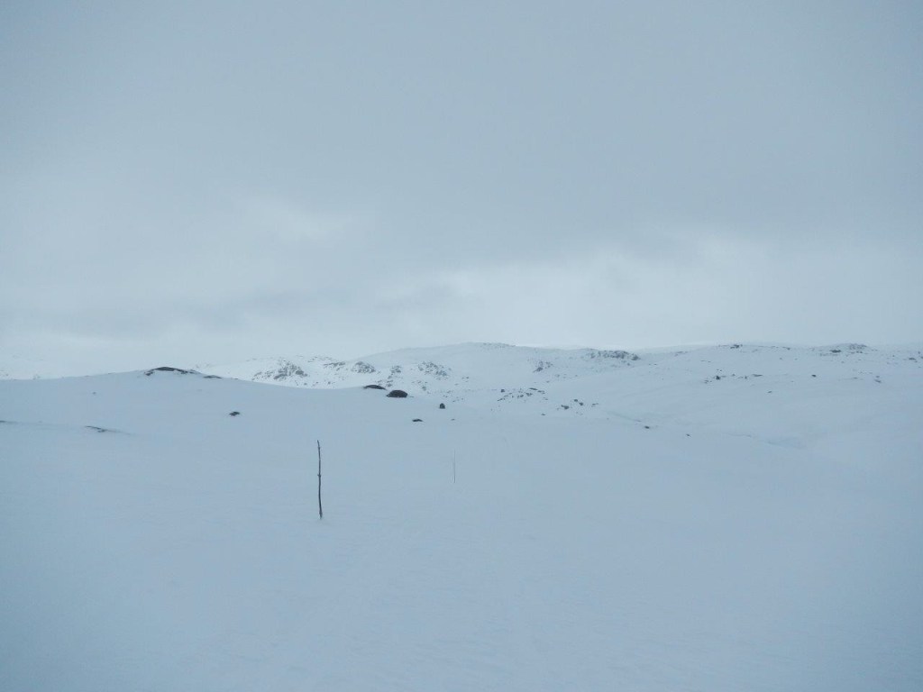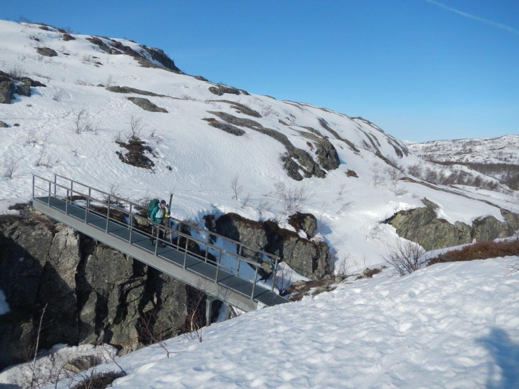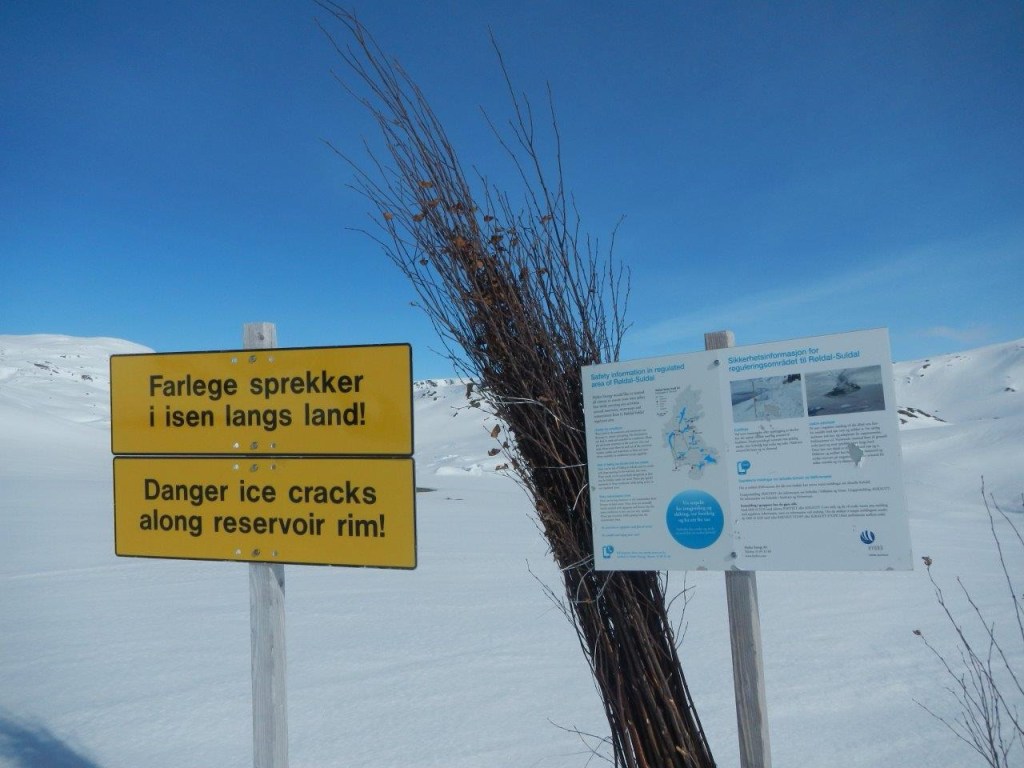 Endlich sind wir oben. Circa 600hm über steile vereiste Hänge gegen den Wind müssen wir aufsteigen. Es geht nur mit Steigfellen. Der Wind ist eisig. Die Sonne hat keine Chance. Heute schwitzen wir nicht. Trotz Anstrengung am Berg. Oben angelangt geht es über zwei riesige Stauseen. Eine tiefblaue Spalte müssen wir überqueren. Wieder warnen Schilder vor solchen Spalten. Nie die markierte Route verlassen! Wir sind froh über die Kvister, die ca. 1,50m hohen Stöcken, die als Wegmarkierung alle 30-50m im Schnee stecken. In den meisten Regionen werden sie kurz vor Ostern angebracht. Insgesamt auf 4300km in ganz Norwegen. Das ist viel Arbeit für den DNT, den norwegischen Wanderverein Den Norske Turistforening. Und eine große Verantwortung. Die Routenwahl vermeidet Gefahren wie Lawinenhänge oder unsicheres Wasser auf Seen. Überall wird die topografisch optimale Strecke für Tourengänger gesucht. Wir schätzen diese Arbeit sehr. Ohne Kvister, nur mit GPS, Kompass und Karte ist es wesentlich schwieriger zu gehen. Besonders bei schlechter Sicht.