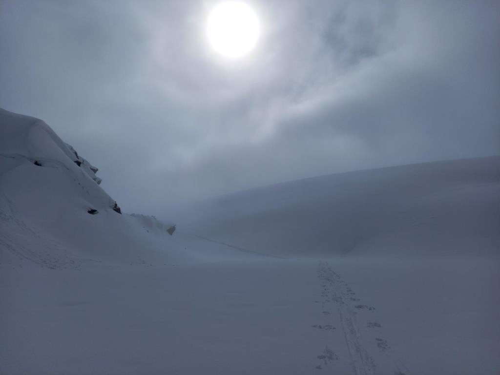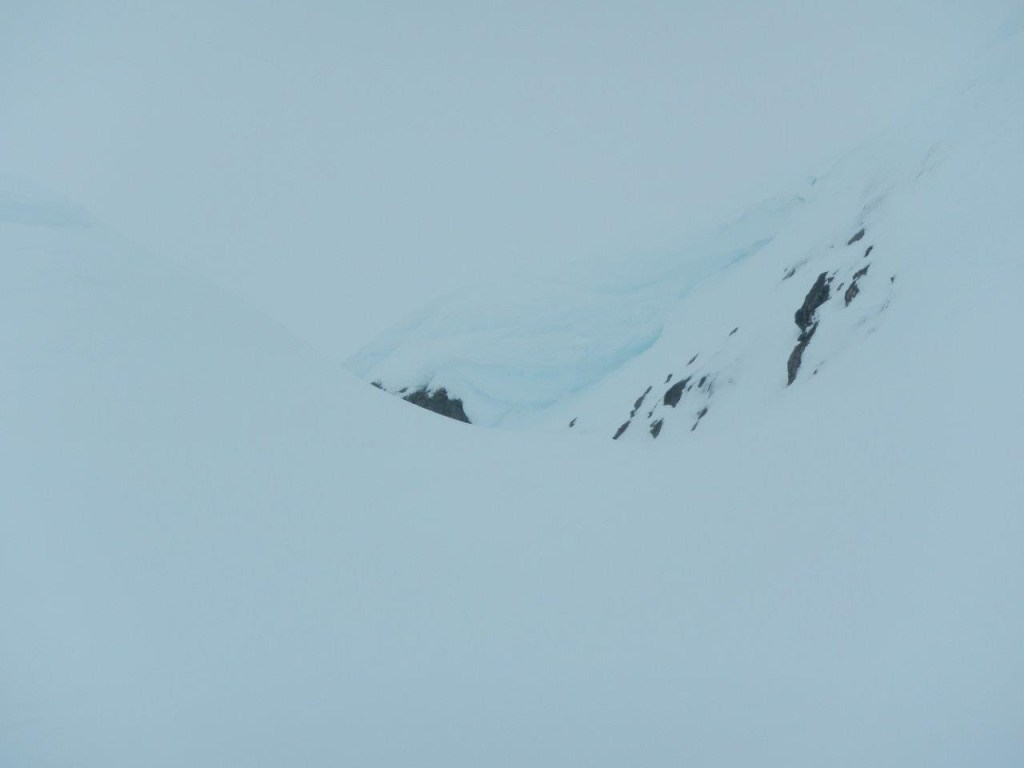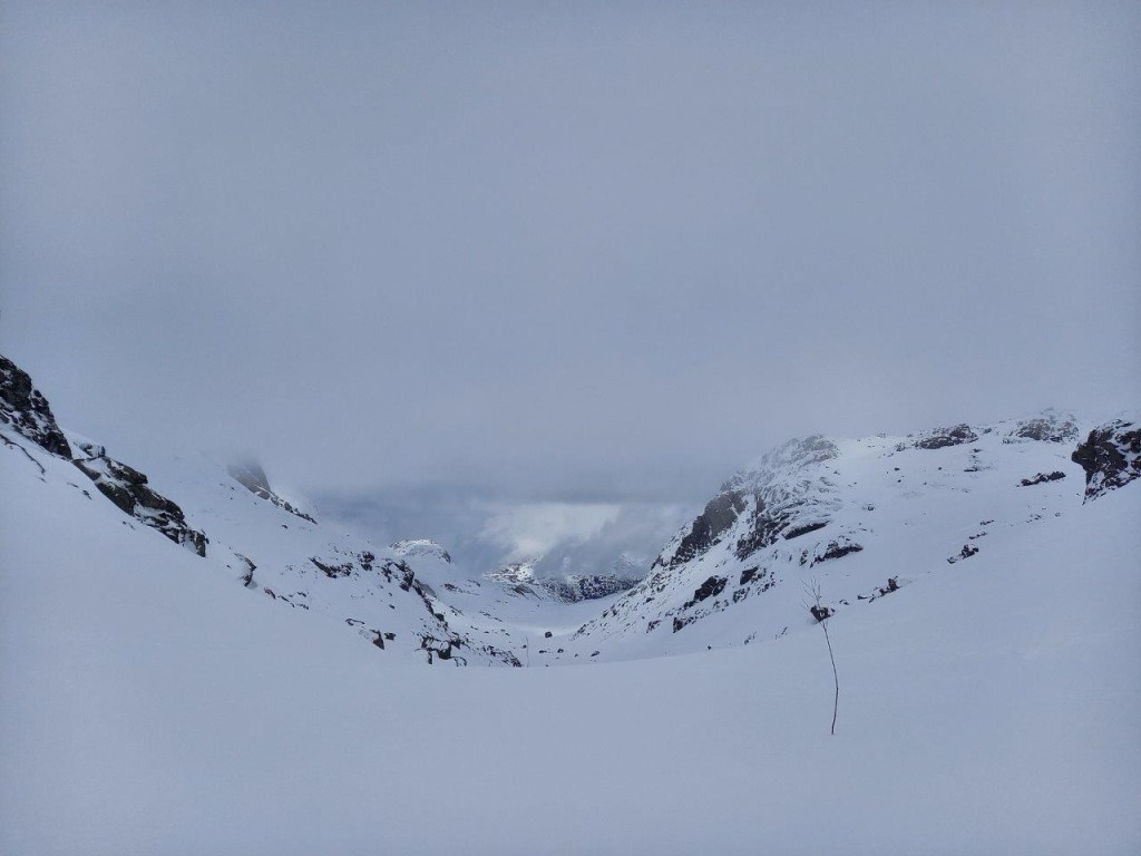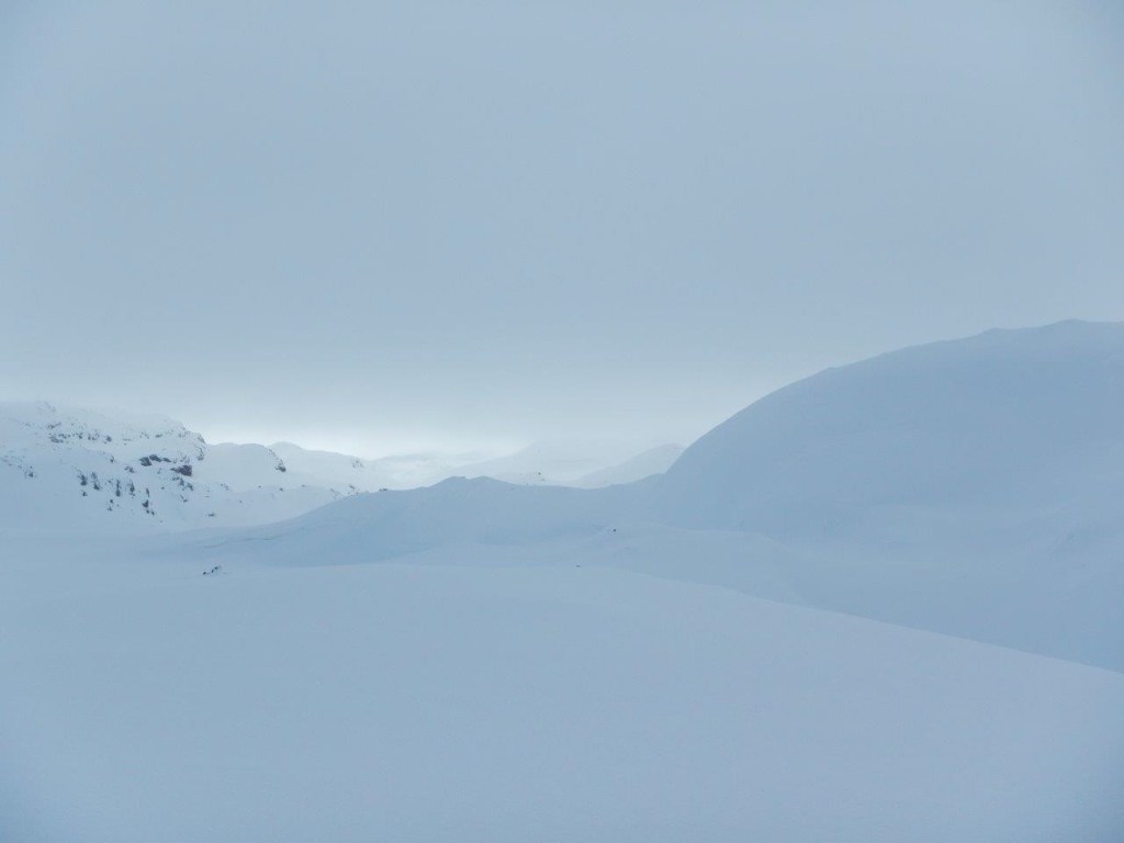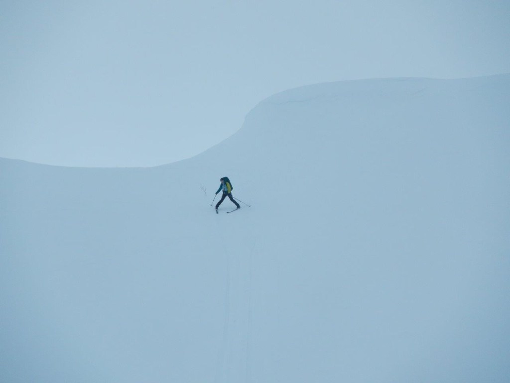 Morgens ist es etwas neblig. Keine Sonne mehr. Alles ist wieder monochrom weiß. Die Unterschiede zwischen Bergen und Himmel sind nicht mehr zu erkennen. Sie gehen ohne Konturen ineinander über. Ob unser Untergrund gerade bergab oder bergauf geht, ist nicht zu sehen. Schade. Der Schnee wäre so toll zum Abfahren. Es hat in der Nacht ungefähr 10cm geschneit. Doch wir sehen nicht genug. Klaus stürzt schon wieder an einem kleinen Abbruch. Also geht es nur langsam hinab. An einem Berg brauchen wir nochmal die Steigfelle. Dann geht es nur noch runter.