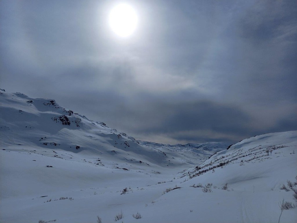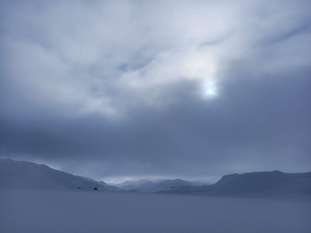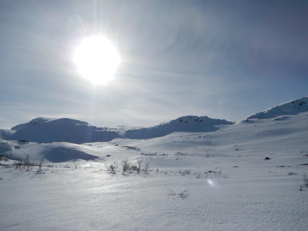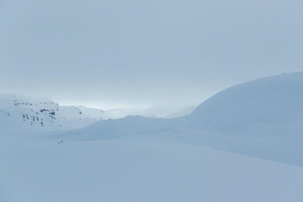 Leider stimmt die Wettervorhersage. Es ist neblig. Nur ab und zu können wir die Umgebung wahrnehmen. Wir erkennen keine Konturen im Schnee. Und auch nicht die Topografie. Direkt hinter der Hütte stürzt Klaus einen kleinen Hang hinunter. Schon das dritte Mal auf der Tour. Wir erkennen solche Abbrüche einfach nicht. Sabine hat es einfacher. Sie wartet bis Klaus vorgelaufen ist und fährt dann nach. Das Wetter ändert sich im Laufe des Tages. Es klart auf. Plötzlich scheint sogar die Sonne. Endlich. Wir sind begeistert. Schnell machen wir jede Menge Fotos. Im Sonnenschein ist die Landschaft atemberaubend schön. Sie ist nur schwer zu beschreiben. Alles ist weiß. Durch den Neuschnee sehen die Berge aus, als wären sie in Watte gepackt. Alles ist weichgezeichnet. Die norwegischen Fjell-Landschaften gehören zu den schönsten Gegenden, die wir kennen. Deshalb zieht es uns immer wieder hierher. Bei schönem Wetter können wir uns einfach nicht satt sehen.