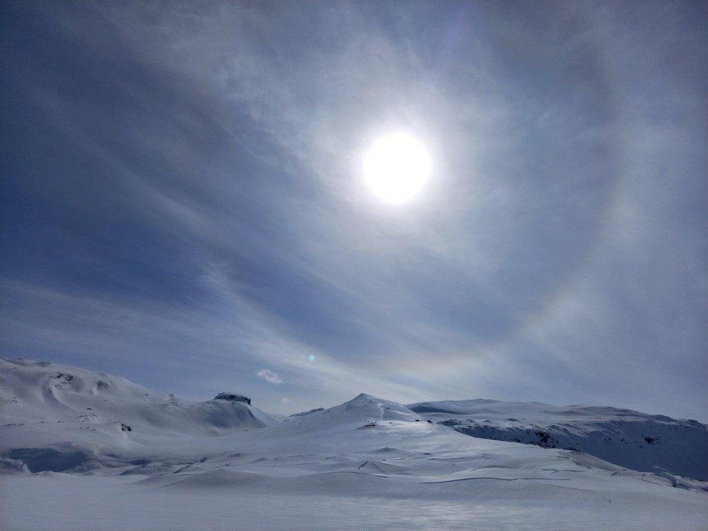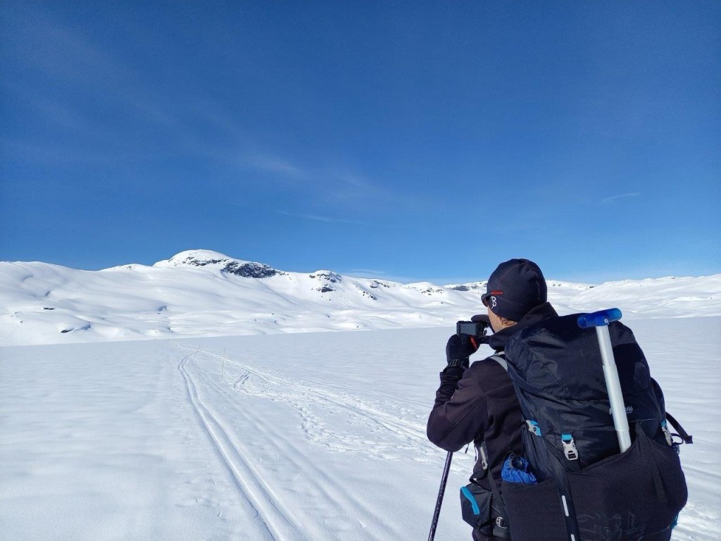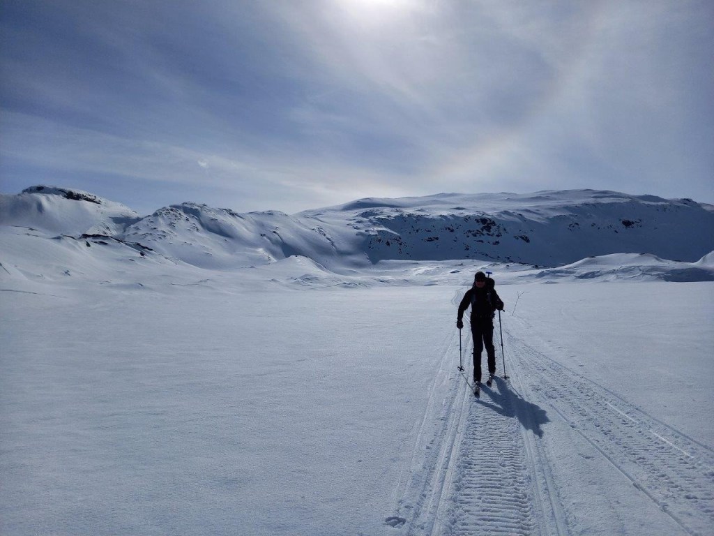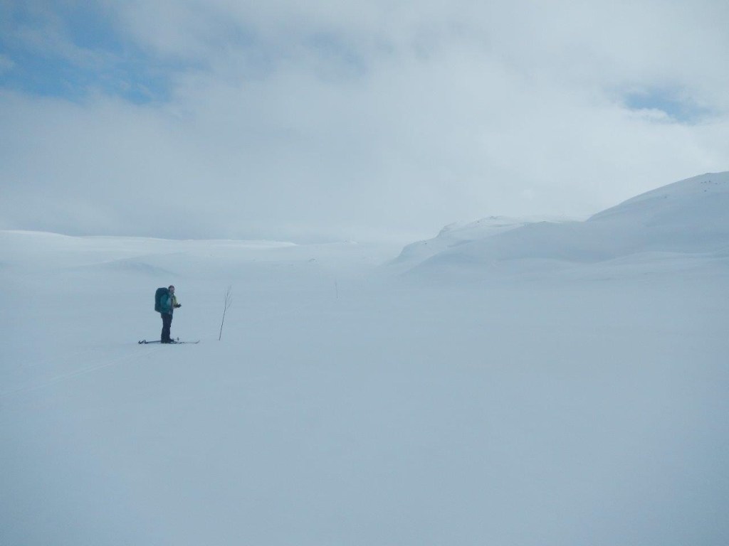 Leider stimmt die Wettervorhersage. Es ist neblig. Nur ab und zu können wir die Umgebung wahrnehmen. Wir erkennen keine Konturen im Schnee. Und auch nicht die Topografie. Direkt hinter der Hütte stürzt Klaus einen kleinen Hang hinunter. Schon das dritte Mal auf der Tour. Wir erkennen solche Abbrüche einfach nicht. Sabine hat es einfacher. Sie wartet bis Klaus vorgelaufen ist und fährt dann nach. Das Wetter ändert sich im Laufe des Tages. Es klart auf. Plötzlich scheint sogar die Sonne. Endlich. Wir sind begeistert. Schnell machen wir jede Menge Fotos. Im Sonnenschein ist die Landschaft atemberaubend schön. Sie ist nur schwer zu beschreiben. Alles ist weiß. Durch den Neuschnee sehen die Berge aus, als wären sie in Watte gepackt. Alles ist weichgezeichnet. Die norwegischen Fjell-Landschaften gehören zu den schönsten Gegenden, die wir kennen. Deshalb zieht es uns immer wieder hierher. Bei schönem Wetter können wir uns einfach nicht satt sehen.