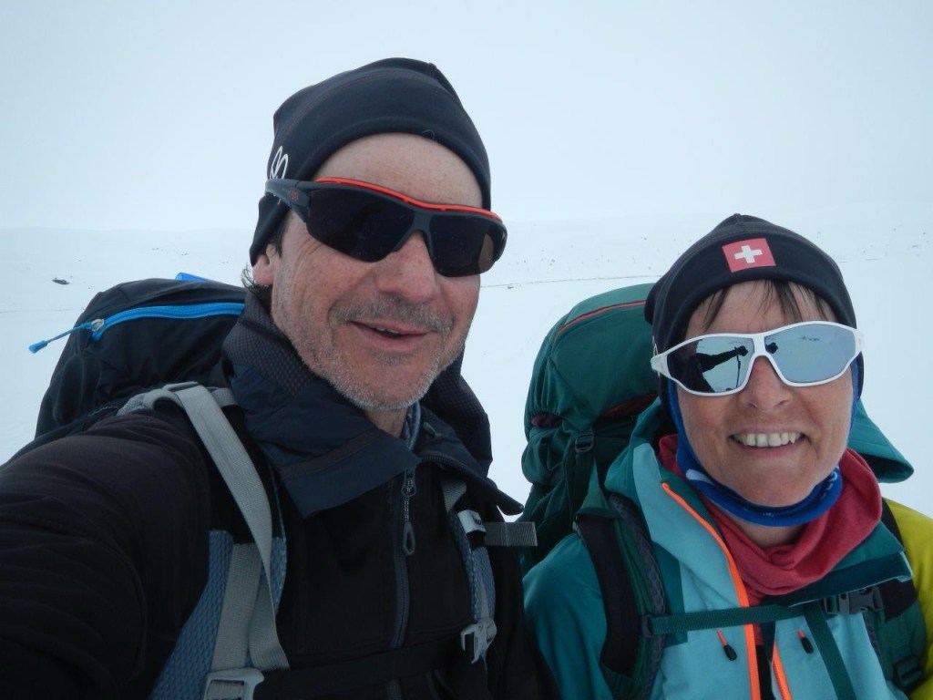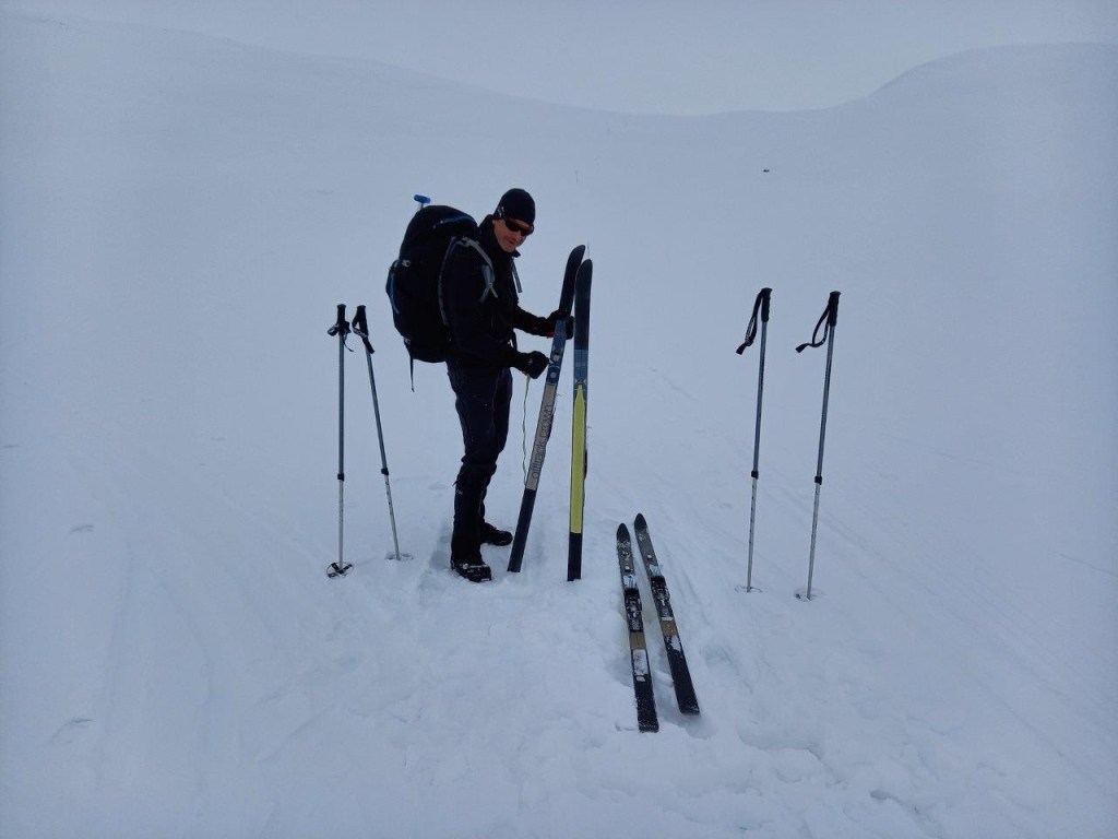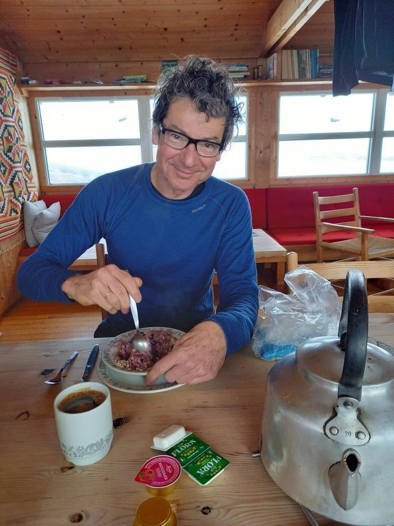 Etwas ist auch anders als letztes Jahr. Das Wetter. 2023 waren wir nur eine Woche früher unterwegs. Bei minus 24°C und Sonnenschein. Heute ist es um die 0°C, es schneit ein wenig und die Wolken hängen tief. Wir haben wenig Sicht und erkennen nicht, wann es steiler nach unten geht. Typisches Fjell-Wetter, das wir schon öfters auf Touren hatten. Der Wetterbericht sagt auch für die nächsten Tage nichts Besseres voraus. Im Gegenteil. In der Hütte reden alle von Sturm am nächsten Tag. Sie wollen in der Hütte bleiben. Wir nicht. Wir können nicht schon am zweiten Tag unseren Reservetag opfern.