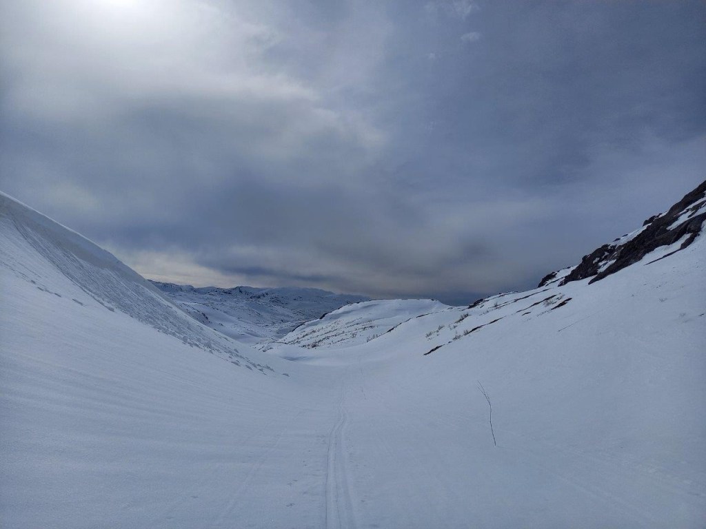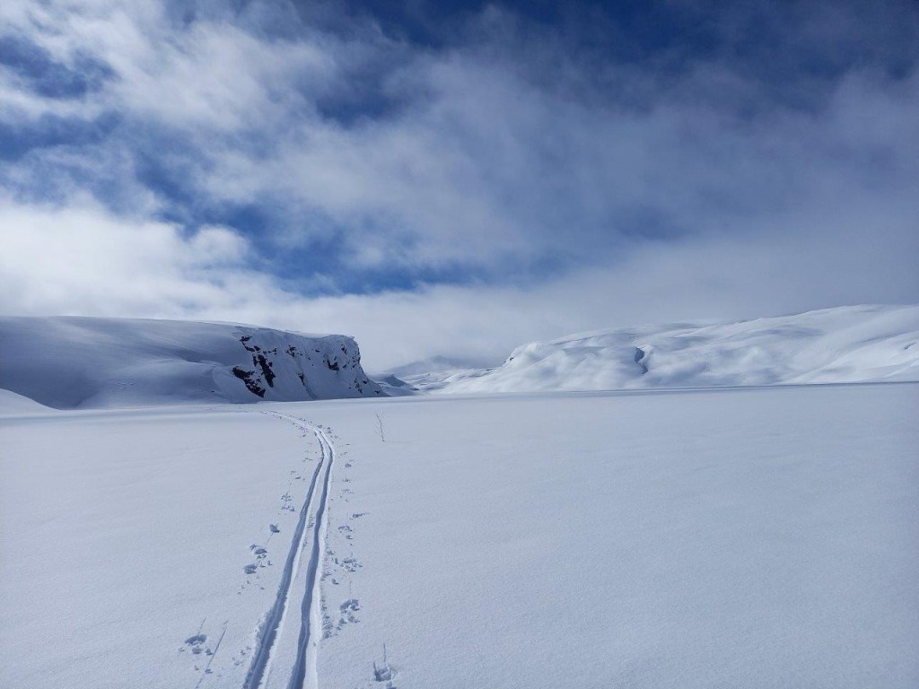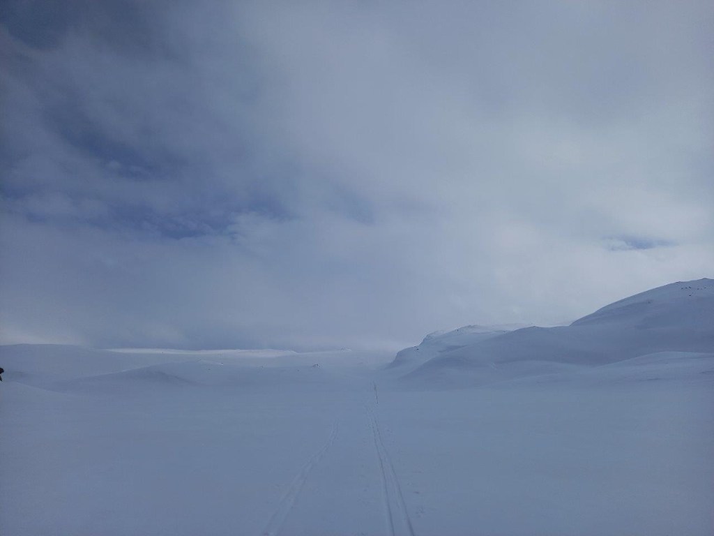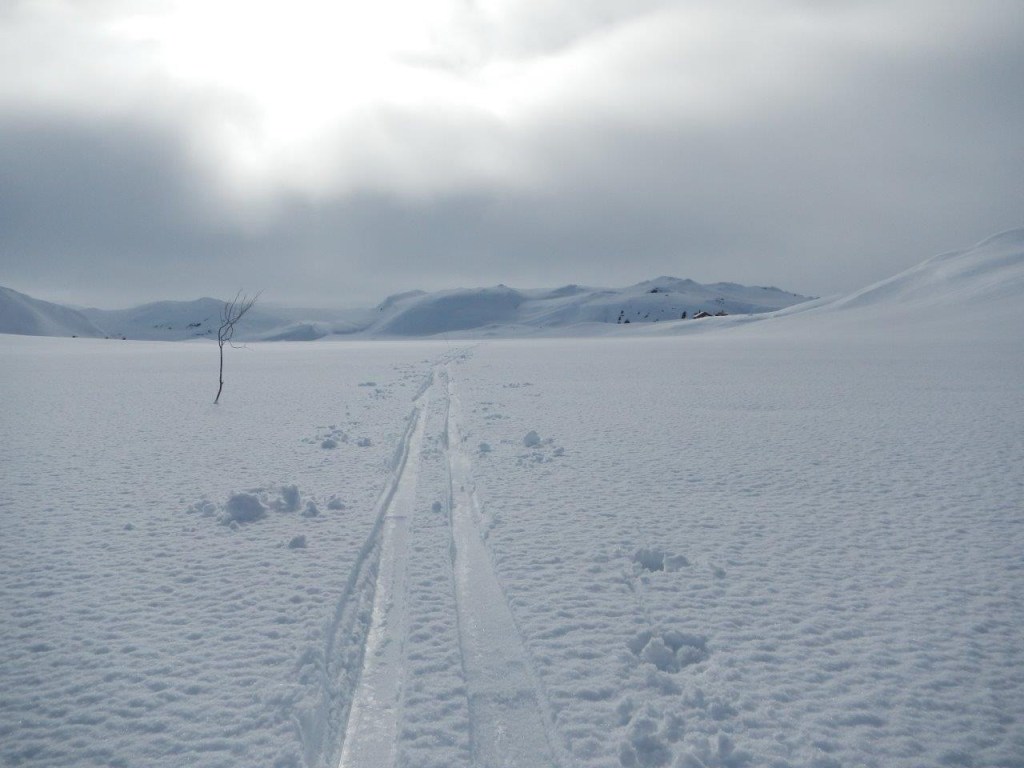 Wir treffen verschiedene Skitourer, die uns entgegenkommen. Alle berichten uns von der Sturmwarnung für den nächsten Tag. Alle wollen sie morgen in der nächsten Hütte bleiben und den Schneesturm aussetzen. Wir haben also richtig entschieden, nach Haukeliseter zu gehen. Rentierspuren kreuzen unseren Weg. Vor nicht allzu langer Zeit müssen sie hier vorbeigezogen sein. Wir sehen sie nicht. Obwohl wir wieder alle Hänge nach ihnen absuchen.