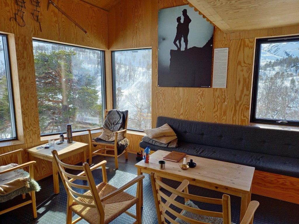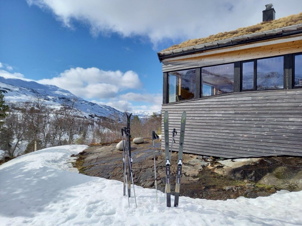 Bis zur tiefgelegenen Jonstølen Hütte müssen wir noch einmal steil hinab. Es ist so warm, dass der Schnee ganz sulzig wird. Wir bahnen uns den Weg um kleine Birken herum. Zwei Norweger heißen uns willkommen. Später trifft auch noch Felix ein. Es ist eine nagelneue, moderne Hütte von einem namhaften norwegischen Architekten entworfen. Aus dem Gastraum sehen wir aus Panoramafenstern die gesamte umgebende Bergwelt. Unterstützt durch die Olaf-Thon-Stiftung des bekannten Hoteliers kann der DNT eine solche Hütte finanzieren. Für uns purer Luxus. Jedoch ohne Wasser, das holt Klaus mit Kanistern 50hm weiter unten aus dem Bach, und zur Toilette müssen wir durchs Freie laufen. Luxus kann auch einfach sein. Wir genießen den schönen Abend.