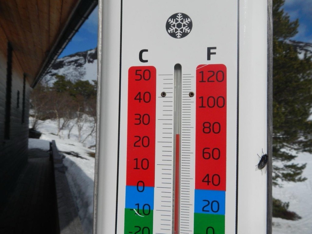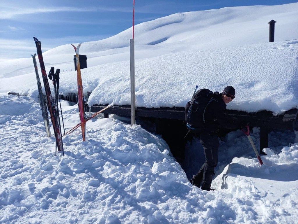 Heute aber ist die Sicht phänomenal. Der Himmel ist strahlend blau. Die Berge stahlen in reinstem Weiß. Der letzte Anstieg zur Homavatn Hütte hat es in sich. Auf dem Stausee haben wir zum besseren Gleiten die Felle abgeschnallt. Für die 70hm bis zur Hütte ziehen wir sie nicht extra wieder auf. Dann also im Grätenschritt nach oben. Sabine rutscht aus und fällt mit dem Gesicht in den harten Schnee. Ihre Nase blutet. Sonst ist alles noch heil. In der Hütte treffen wir zwei norwegische Paare. Sie haben den neuesten Wetterbericht für die nächsten beiden Tage. Er weicht etwas von der Vorhersage ab, die Klaus gestern auf einer Anhöhe zufällig einsehen konnte. Morgen soll es schön sein, übermorgen eher schlecht. Schnee und stürmischer Wind. Wir hatten geplant, morgen zu einer weiteren Hütte zu gehen und übermorgen 16km über einige Berge zum Bus in Hovden. Von dort wollen wir nach Kristiansand. Die Strecke über die Berge gegen den gemeldeten Sturm ist zu riskant.