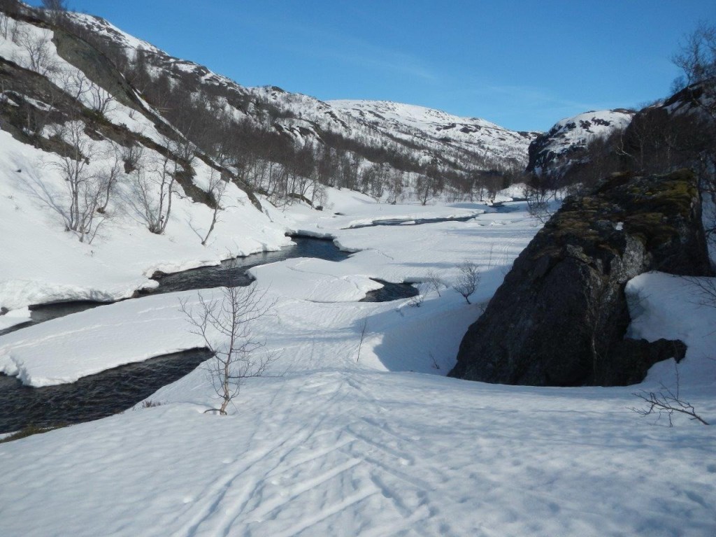 Heute wird es anstrengend. Zuerst müssen wir 100hm bergab. Abfahren geht nicht. Klaus versucht es und stürzt. Es ist steil. Unter uns rauscht ein Fluss. Der Schnee ist holprig und hart gefroren. Dann halt zu Fuß. Im Tal geht es auf Skiern weiter. Die zwei Männer in Jonstølen haben uns vor dem offenen Wasser des Flusses gewarnt. Über Schneebrücken, die schon teilweise wegen des warmen Wetters eingestürzt sind,müssen wir öfters den Fluss queren. Vor zwei Tagen haben sie die beiden Männer noch ausgehalten. Hoffentlich halten sie uns auch noch aus. Vor zwei Jahren wäre hier jemand verunglückt, erzählen die beiden. Es stand so in der Zeitung. Die ersten Schneebrücken halten. In einer engen Schlucht geht eseinen steilen Pfad hinauf. Mit Ski unmöglich. Glücklicherweise haben wir wieder guten Halt zu Fuß im Schnee. Wir queren die Hänge oberhalb des reißenden Flusses. Dann sind wir wieder im Flussbett. Mitten auf dem nur noch halb zugefrorenen Fluss verläuft unsere gekvisterte Spur. Wir folgen den Markierungsstäben. Wieder geht es über Schneebrücken. Dann über einen See mit überfluteten Wasserstellen und vielen Rissen.