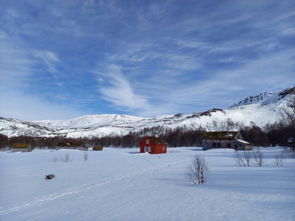 Im Bus sitzen außer uns nur norwegische Jugendliche, die mit ihren Alpinski ins Skigebiet fahren. Sie haben Osterferien. Wir steigen als letzte aus. Sonst will keiner bis hoch ins Fjell. Auf einer Spur auf einer zugeschneiten Straße kommen wir schnell voran. Ein norwegisches Langläuferpaar begleitet uns bis zum Ende der gewalzten Spur. Dann kehren sie um. Sie haben eine Hütte in der Nähe. Wir unterhalten uns nett während dem Laufen. Diese kurzen Begegnungen bereichern jede Tour. Ein kurzer Austausch von Informationen, Erzählungen über Touren und von sich selbst, ganz zwanglos. Und dann ist die Begegnung schon wieder vorbei. An einige Menschen erinnern wir uns Jahre später noch: „Weißt du noch? Da haben wir den… oder die… getroffen.“ Auch in der ersten Hütte Grautheller treffen wir andere Tourengänger. Eine Frau aus Lettland mit zwei Kindern, eine dänische Großfamilie, zwei Norwegerinnen mit Pulka und einen norwegischen Solo-Gänger. Gut, dass wir im letzten Jahr gelernt haben, dass man Betten reservieren kann. Zuvor war das nie möglich und auch nicht erforderlich. Wer zuerst kommt, hat ein Recht auf ein Bett, die letzten müssen eventuell auf Matratzen auf dem Boden schlafen. Heute hat jede Gruppe ihren privaten Raum. Und in der Küche wechseln wir uns ab.