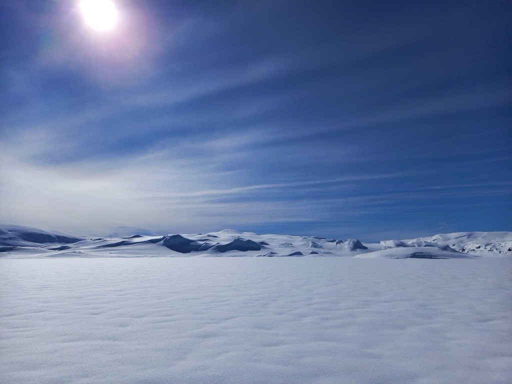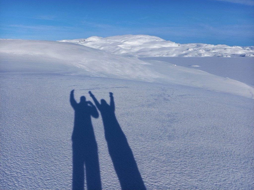 Mit etwas Rückenwind gehen wir los. Es schneit. Unterwegs kommen uns drei Gruppen mit Pulkas entgegen. Sie warnen uns vor einer Spalte beim Zutritt auf den Blåsjø-Stausee. Wir sollen ganz gerade zwischen zwei roten Stäben durchfahren. Warnschilder weiden auf Spalten und unsicheres Eis hin. Auf der Karte rot markierte Flächen sollten wir meiden. Unter dem zugefrorenen See verlaufen einige Rohre, die zu einem Wasserkraftwerk führen. Die Spalte ist nicht so dramatisch wie angekündigt. Auf dem riesigen See haben wir moderaten Seitenwind. Es hat aufgehört zu schneien. Und klart sogar etwas auf. Bis Hovatn geht es ständig auf und ab. Wir sind wieder die ersten auf der Hütte. In einem gemütlichen Schlafraum legen wir unsere Sachen ab. Wir machen Feuer und backen Pfannkuchen. Unterwegs haben wir mal wieder keine Pause gemacht. Die fünf Stunden Gehzeit sind wir durchgelaufen. Es ist zu ungemütlich zum Anhalten. Nach uns kommt Felix in der Hütte an. Später noch ein norwegisches Paar. Und dann zeigt sich sogar noch kurz die Sonne. Endlich. Wir machen schnell ein paar Fotos. Felix steigt noch auf einen Berg. Dort soll es Mobilfunkempfang geben. Den letzten hatten wir an der Bushaltestelle bei unserem Start vor drei Tagen. Auf dem Berg weht ein kalter starker Wind. Im Windsack schreibt Felix eine Nachricht an seine Familie und versucht zu telefonieren. Er bringt uns den neuesten Wetterbericht mit. Morgen soll es zuerst neblig sein, nachmittags soll die Sonne scheinen. Auch die Vorhersage für übermorgen ist erfreulich: abflauender Wind und Sonnenschein. Gute Aussichten.