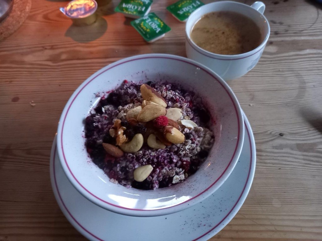 Es ist Ostersonntag. Es gibt leider keinen Osterbrunch, sondern wie jeden Morgen Hafergrütze mit getrockneten Heidelbeeren, Himbeeren und Nüssen. Danach Knäckebrot. Das muss bis nachmittags reichen. Nach dem Frühstück steht noch der Osterputz auf dem Programm. Die Hütte zu reinigen ist Pflicht vor jeder Abreise. Auch Wasser und Holz für die nächsten Besucher bereitstellen ist Ehrensache.