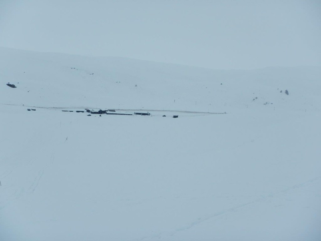 Wir fahren los. Im Bus über eine der gefährlichsten Straßen, im Schneesturm, über eine geschlossene Schneedecke. Etwas mulmig ist uns schon. Wir kommen nur zwei Kilometer weit bis in den Tunnel. Die Fahrbahn im gesamten 5 km langen Tunnel ist schneebedeckt. So stark bläst der Wind den Schnee hinein. Im Tunnel ist erstmal Stopp. Ein Konvoi von PKWs und sogar LKWs wartet darauf, hinausfahren zu dürfen. Der Bus darf vor. Nachdem eine Autoschlange aus der Gegenrichtung an uns vorbeigefahren ist, dürfen wir mit dem Bus einem Schneepflug folgen. Der Schnee wirbelt über die Straße. Es geht sehr steil bergab. Hoffentlich ist der Busfahrer ein guter Fahrer.