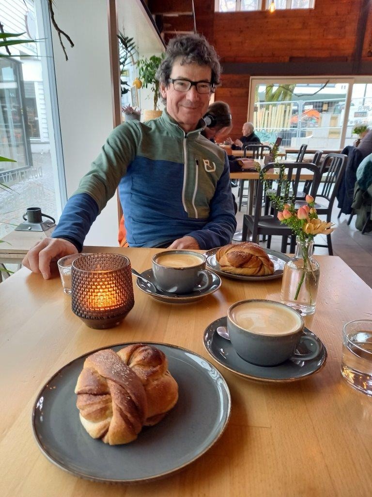 Um 15 Uhr soll unser Bus nach Haukeli fahren. Dort können wir in einen Bus nach Kristiansand umsteigen. Kurz vor 15 Uhr packen wir Ski und Rucksäcke und wollen zum Bus. Doch der Mann an der Rezeption informiert uns, dass der Bus nicht fährt. Wir fragen warum?????Die Straße sei bis auf weiteres gesperrt. Wegen starkem Schneefall und sturm. Wir sitzen fest. Bei dem Wetter kommen wir also hier nicht weg. Keine Chance, vielleicht morgen, meint der Rezeptionist. Das ist halt so in den Bergen. Dann müssen wir halt nochmal hier übernachten. Immerhin noch besser, als unser ursprünglicher Plan, heute über die Berge nach Hovden zu laufen. Das hätten wir in dem Sturm nicht geschafft. Wir informieren Sarah und Sabines Papa. Und gehen einen Kaffee trinken.