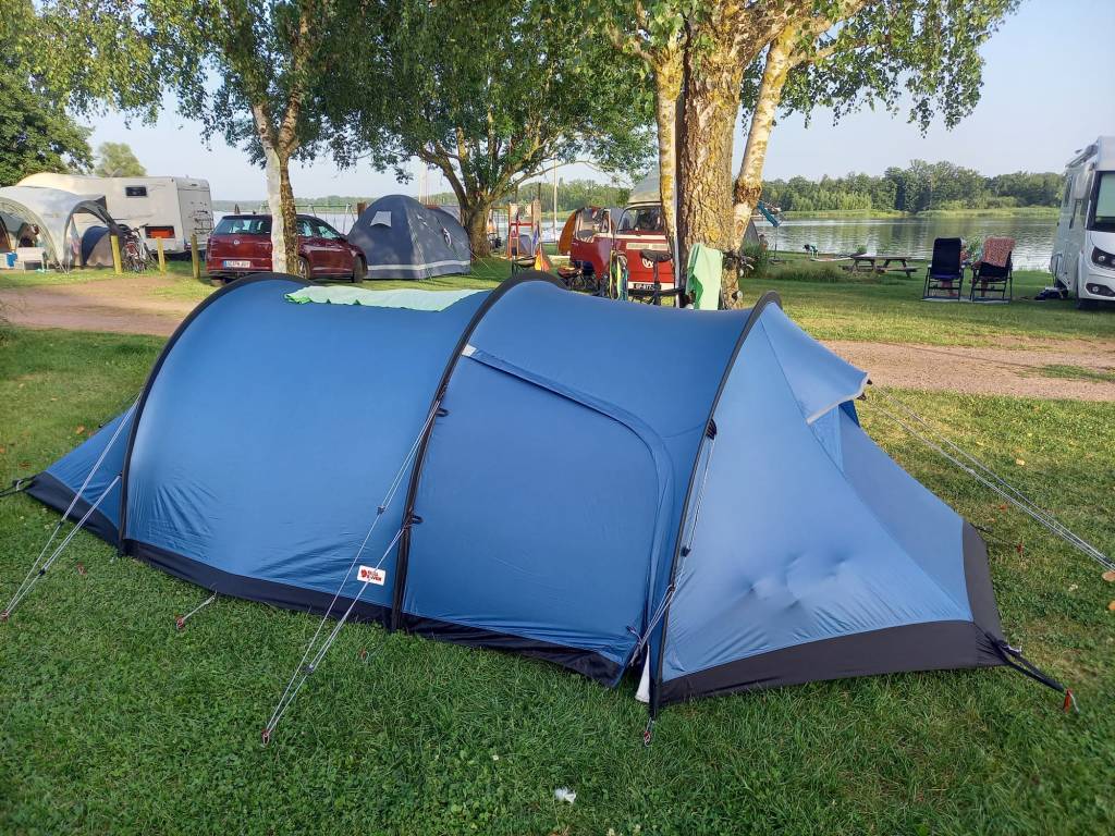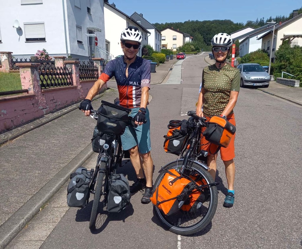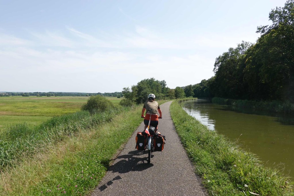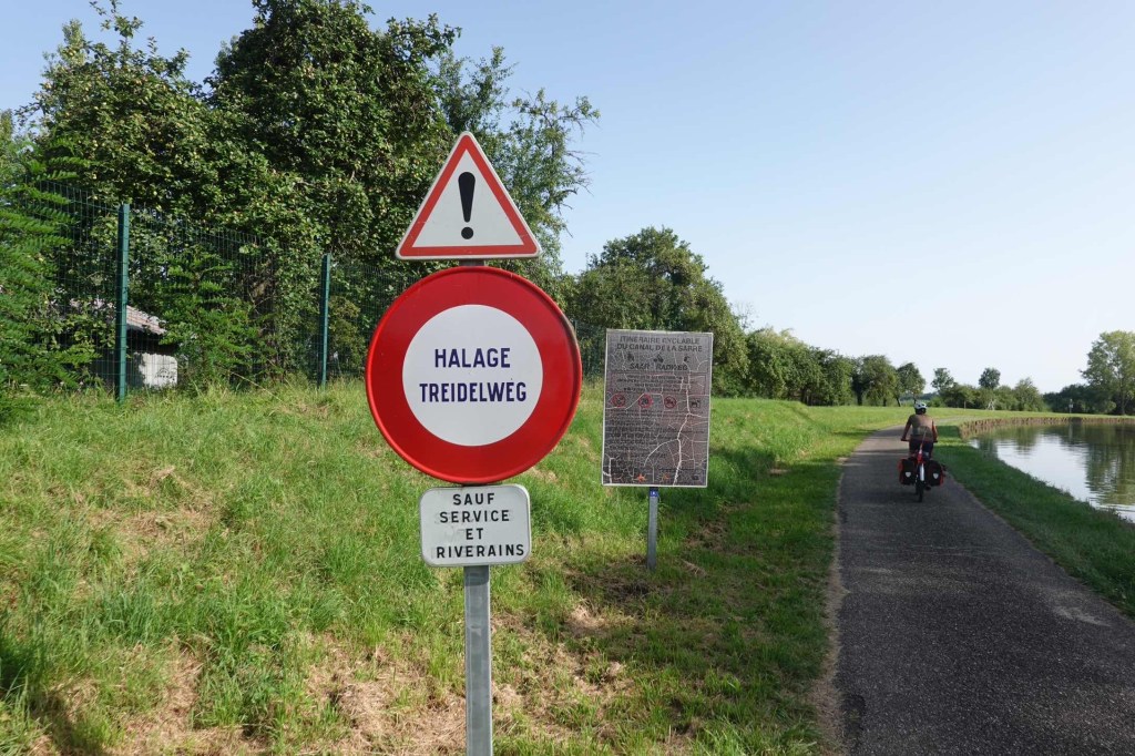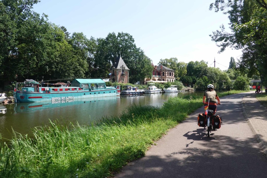 Nach sieben Kilometern fällt Klaus auf, dass er die Befestigung für die GoPro-Kamera auf dem Helm vergessen hat. In Saarbrücken sucht er im Media-Markt nach einem solchen Teil. Vergeblich. Erste Pause nach 10 Kilometern. Kommen wir heute noch an? Auf dem Treidelpfad am Saar-Kohle-Kanal kommen wir flott voran. Doch es ist unerträglich heiß. Wir sehnen uns nach Schatten und Wasser. Auf dem Campingplatz am Stockweiher können wir uns endlich abkühlen. Beim Schwimmen im See nimmt unser Körper wieder normale Temperatur an. Ein Tag zum Akklimatisieren. Wir fahren ja noch 5500km in Richtung Süden. Das war sicher nicht der einzige heiße Tag.