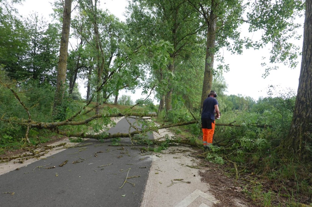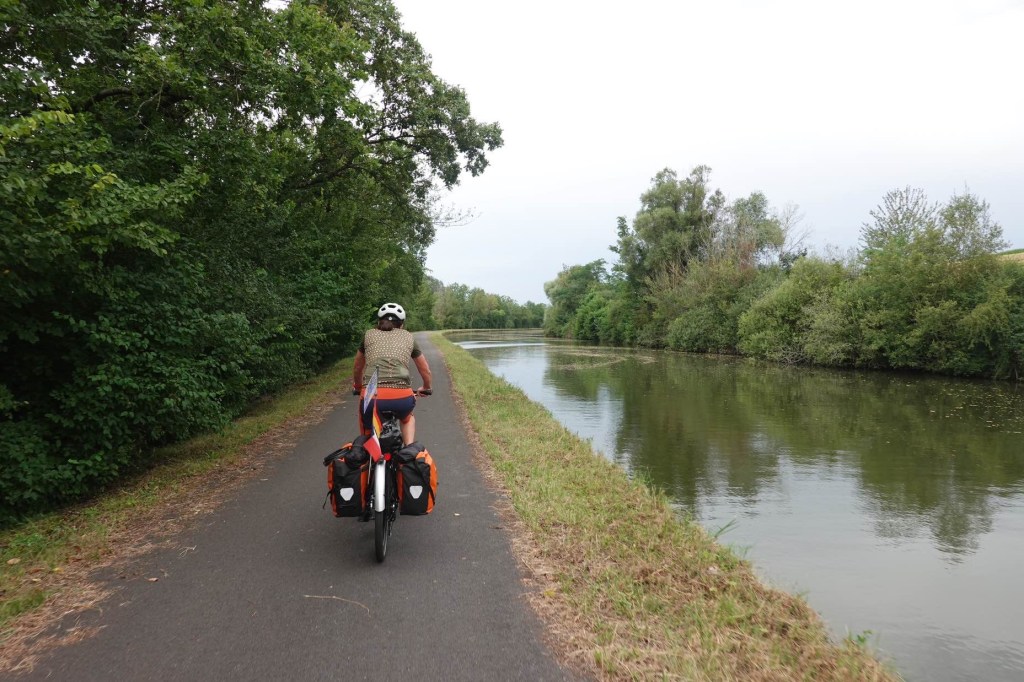 Einen Kanal lassen wir heute links liegen. Den Saar-Kohle-Kanal. Vom Stockweiher geht es über Landstraßen zum Rhein-Marne-Kanal. Er ist meist flach, nur an den Schleusen geht es hoch und wieder ab. Wir wechseln zum Canal de Jonction de Nancy. Der hat es in sich. Alle 200 m eine Schleuse. Wir fahren bis zum Scheitelpunkt nur bergauf. Heute Vormittag gab es hier ein heftiges Gewitter. Den Sturm haben wir noch mitbekommen, den Regen nicht. Es liegen viele Äste auf dem Weg. Umgefallene Bäume behindern uns. An Nancy fahren wir vorbei. Über 10 km wäre der Abstecher in die Stadt hinein. Unser Campingplatz liegt 20 km hinter Nancy an der Mosel. Ein Einheimischer schickt uns über eine steile Straße. Unnötige 300 Höhenmeter. Über die andere Moselseite wären wir schneller dort gewesen. Den letzten Supermarkt verpassen wir. Im Restaurant auf dem Platz gibt es Quiche Lorraine, Salat und Pommes. Passt.