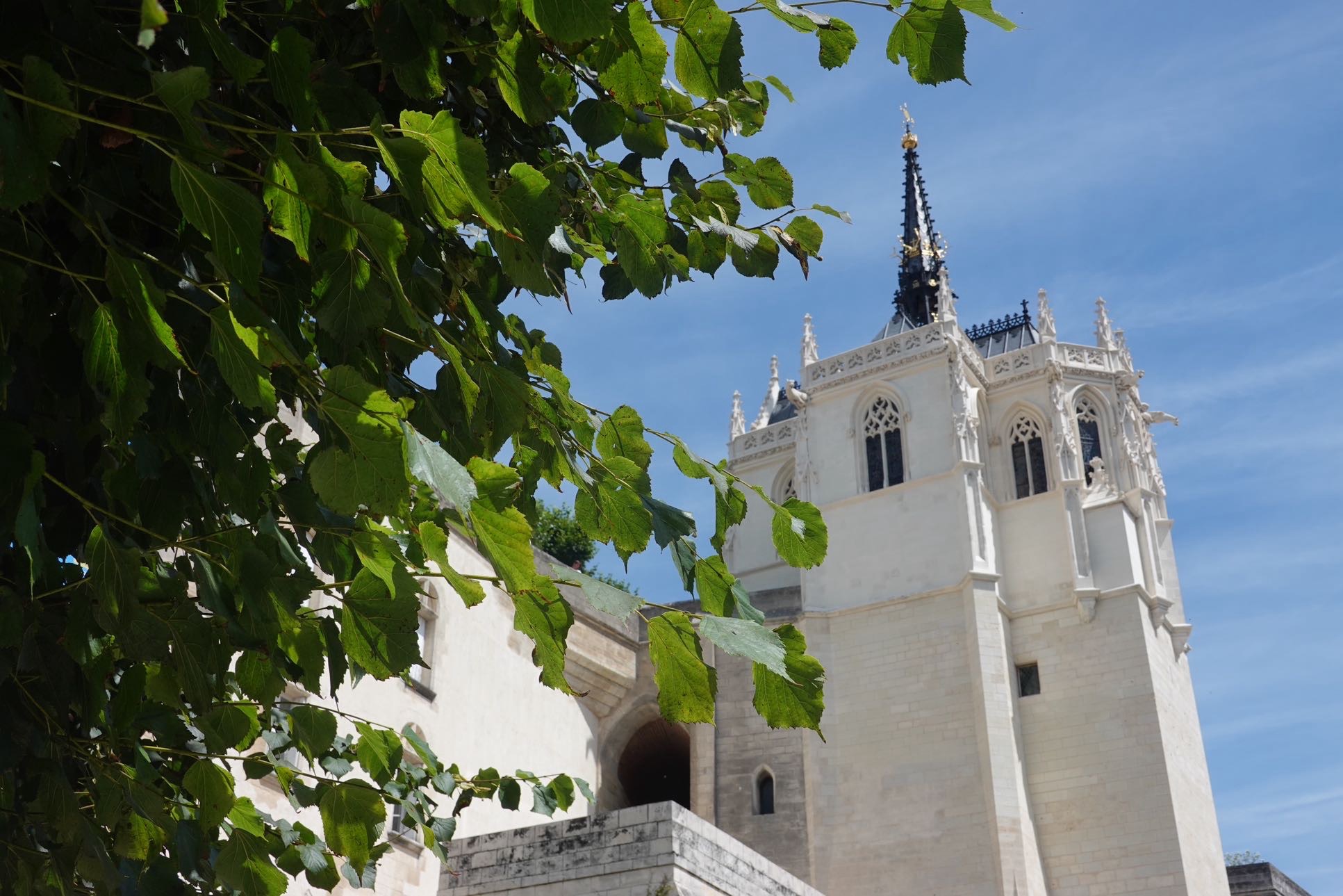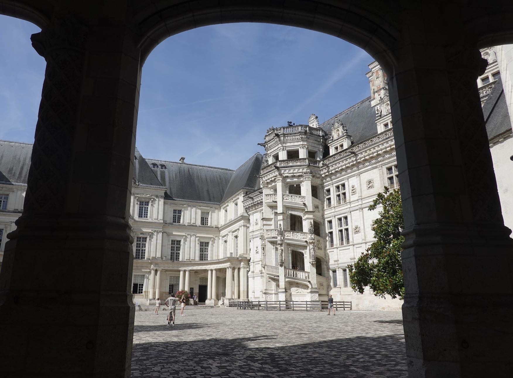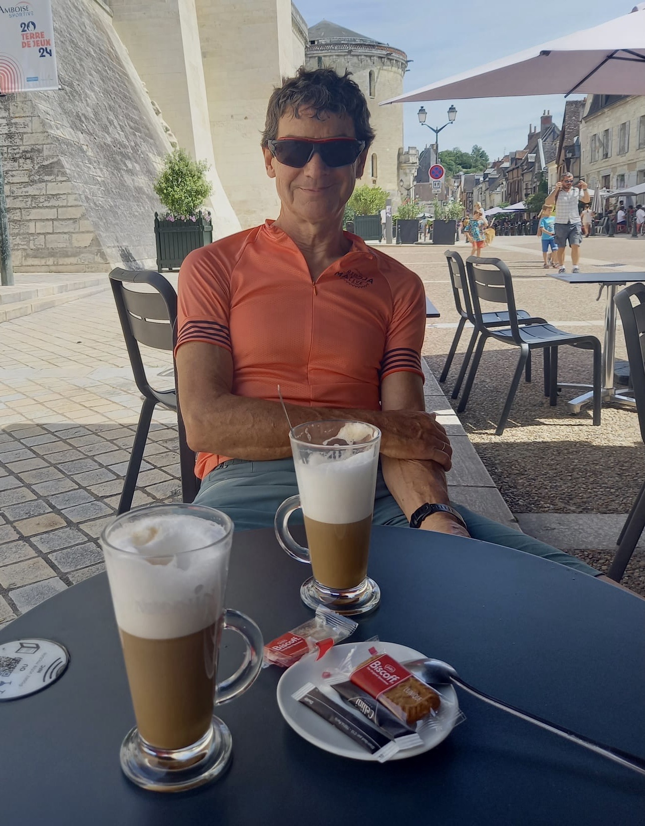 Der Loireradweg führt durch kleine Dörfer, Wiesen und Wälder. Bis Blois ist mächtig Betrieb. Wir fahren zum Schloss hoch. Vor ca. 35 Jahren hatten wir es schon mal besichtigt. Es ist berühmt für seinen doppelt gewendelten Treppenturm. Durch ein Tor erhaschen wir einen Blick darauf. Dann geht es weiter in Richtung Amboise zum nächsten Schloss. Statt den Radweg nehmen wir teilweise die Landstraße. Sie führt immer schattig an der Loire entlang und ist nur wenig befahren. Der Original-Radweg wird über Hügel und Felder in der prallen Sonne geführt. In Amboise gönnen wir uns die erste Kaffeepause seit zuhause. Direkt neben dem Schloss.