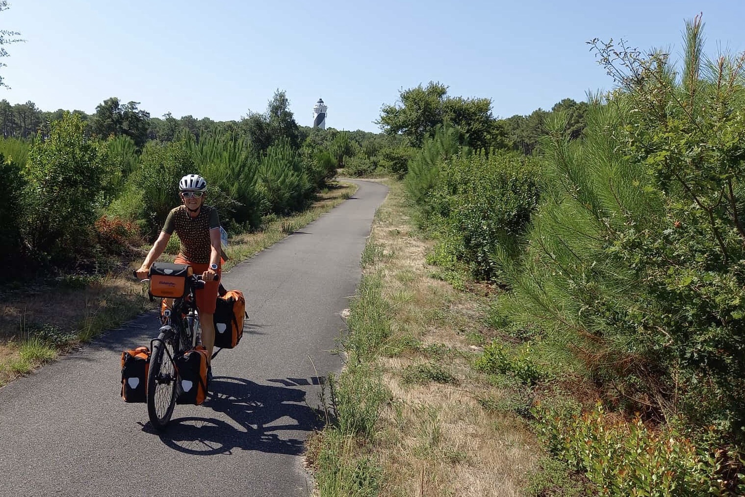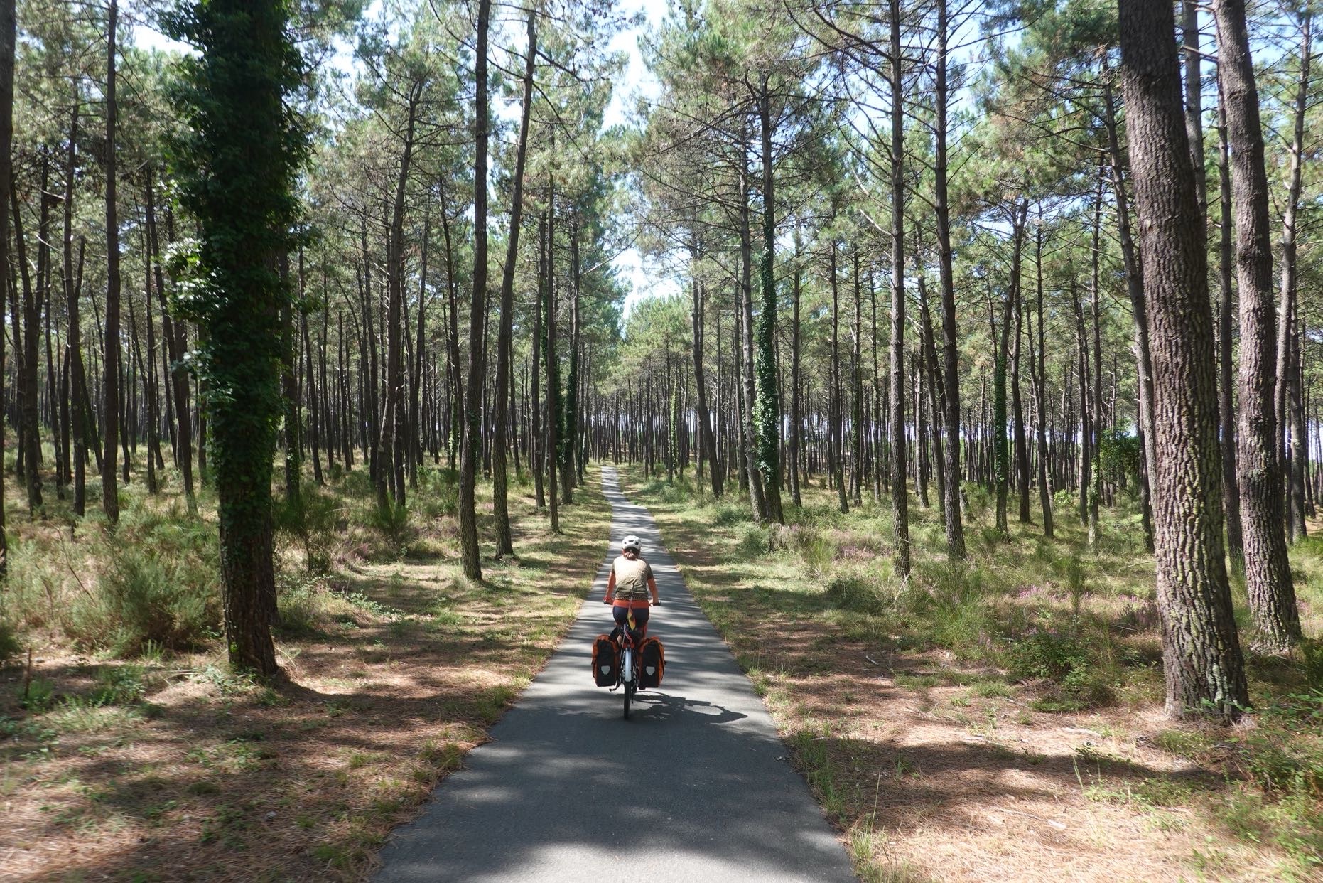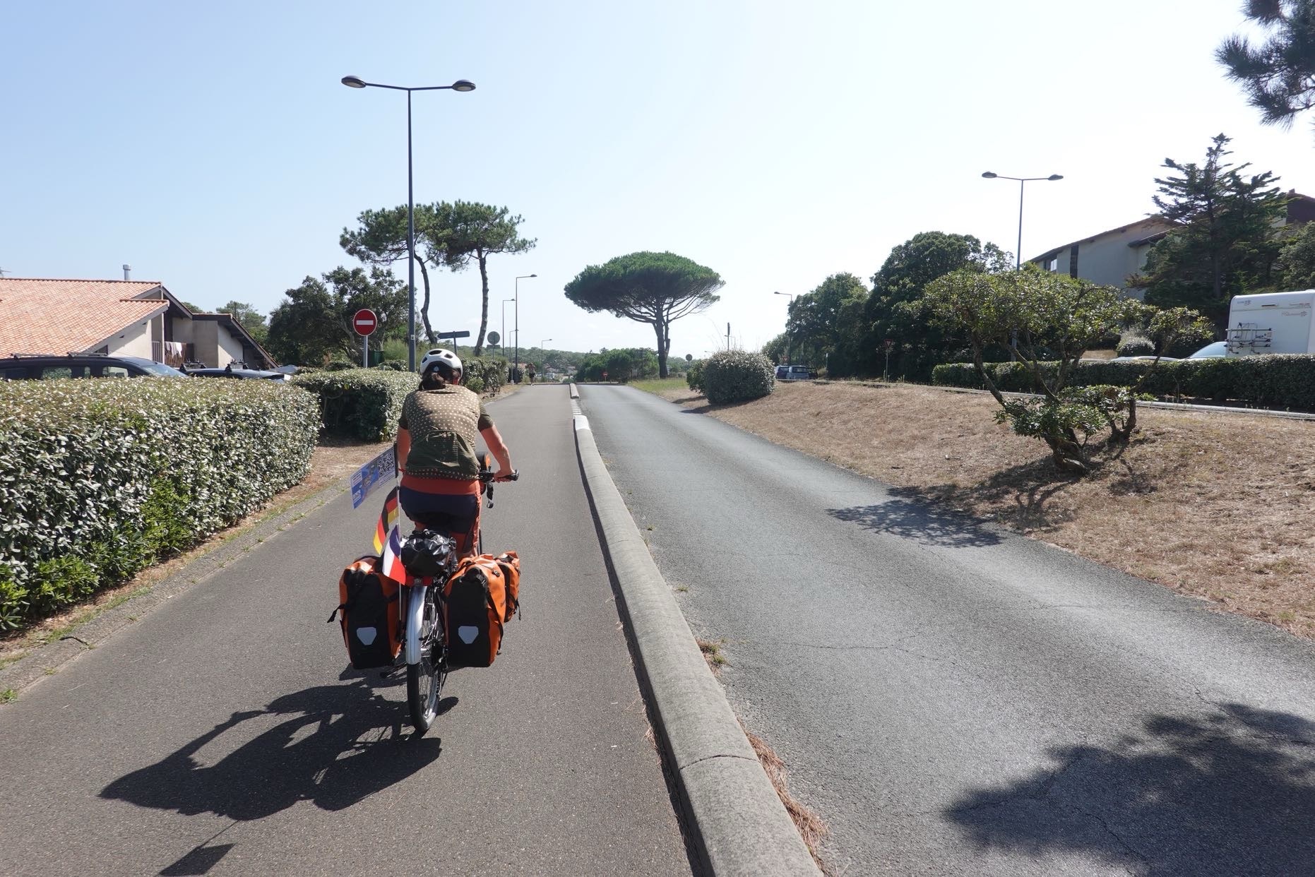 Heute genießen wir noch einmal den Radfernweg Vélodyssée. Über 90 km fahren wir über perfekte Radwege durch Dünen und Wald. Traumhaft. Die Stecke heute ist für uns eine der schönsten. Sie ist wohl stark befahren, doch so breit, dass wir ohne Probleme überholen können. Oder von Rennradfahrern überholt werden. Auch die Ortsdurchfahrten von Seignosse und Hossegor sind radfahrerfreundlich. Ganze Spuren auf Straßen wurden zugunsten der Vélos aufgegeben und mit Randsteinen abgetrennt. Die Straßen sind nur noch einspurige Einbahnstraßen. Eine gute Idee auch für unsere Städte zuhause.