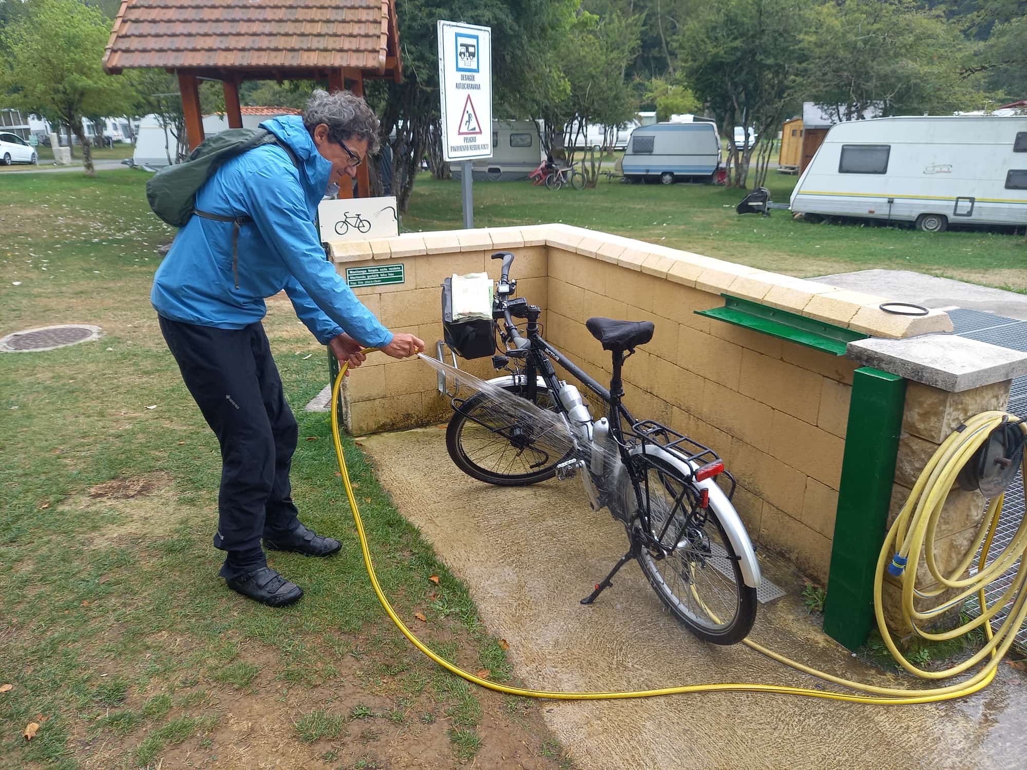 Wir ziehen noch eine Jacke unter die Regenkleidung und dünne Handschuhe an. Dann fahren wir den Pass runter. Es ist eiskalt. Im Pilgerort Roncesvalles sind wir völlig durchgefroren. Und an unserem Campingplatz spüren wir die Finger nicht mehr. Waren es nicht gestern noch fast 30 Grad? Wir sind auf über 800m Höhe. Ein heißer Kaffee wärmt unsere Finger. Hier können wir auch mal die Räder abspritzen. Sie haben es dringend nötig.