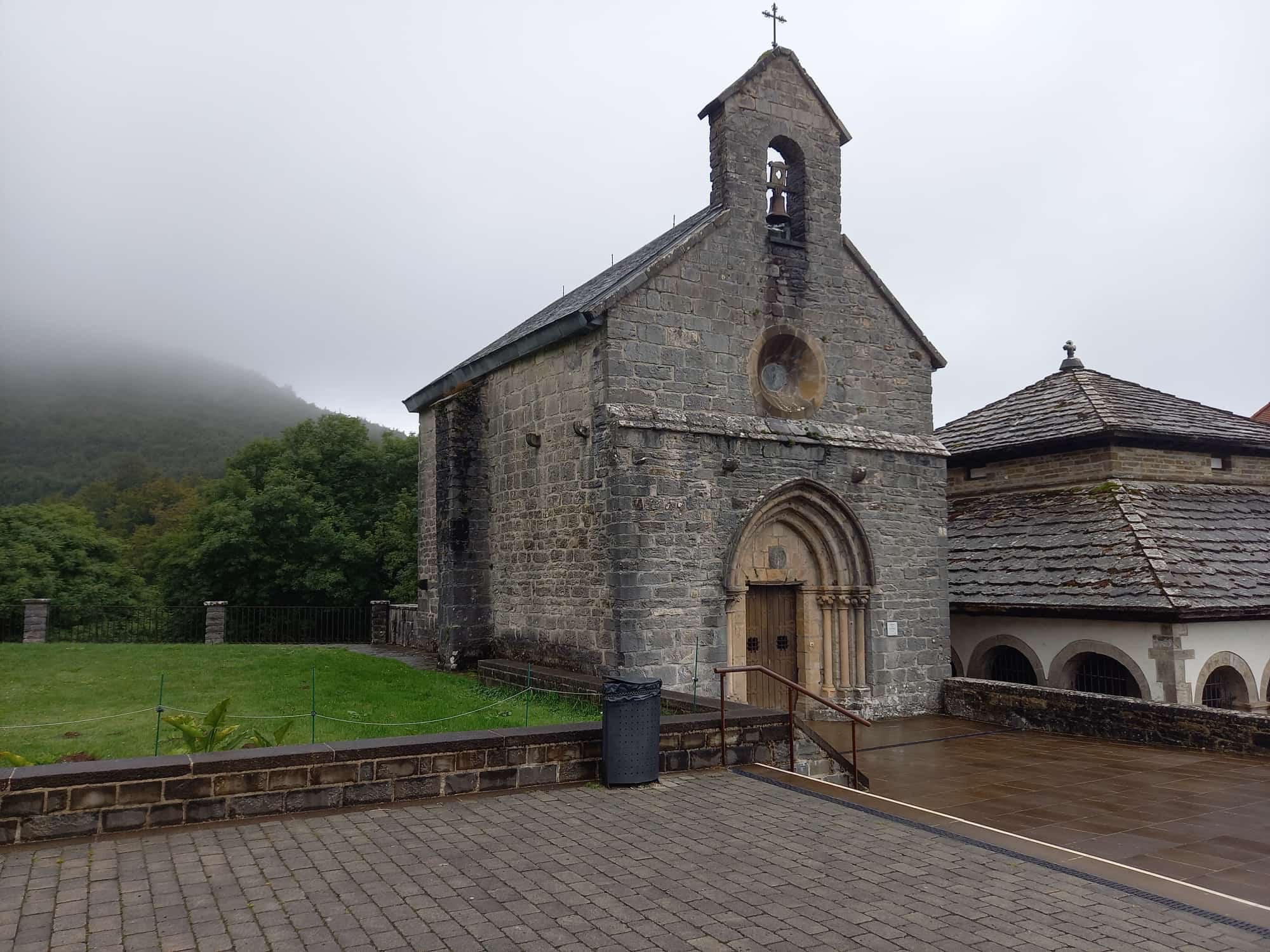 Wir erreichen den Pass, die Puerto de Ibañeta, 1057m hoch. An dem Aussichtspunkt sehen wir nur dichten Nebel. An einer Kapelle suchen wir Schutz. Zwei junge Radfahrerinnen kommen von der anderen Route. Sie sind klatschnass und suchen auch einen trockenen Platz. Sie erzählen, dass sie auf der EV 3 Route zwei Tage gebraucht haben. Und im Sturm gestern Abend beinahe ihr Zelt weggeflogen ist. Die zwei Frauen sind kreuz und quer durch Europa gefahren und haben kein Ziel. Sabine fragt sie, wo sie zuhause sind. Ihre Antwort: auf dem Bike. Und überall dort, wo sie gerade sind. Zwei interessante Frauen.